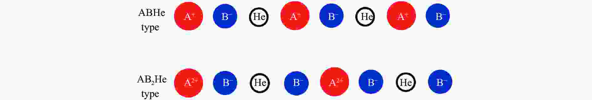 图 1 He原子插入AB和AB2型离子化合物的一维示意图(红色大圆圈代表带有1或2个正电荷的离子,蓝色小圆圈代表带有1个负电荷的离子,白色圆圈代表氦原子)