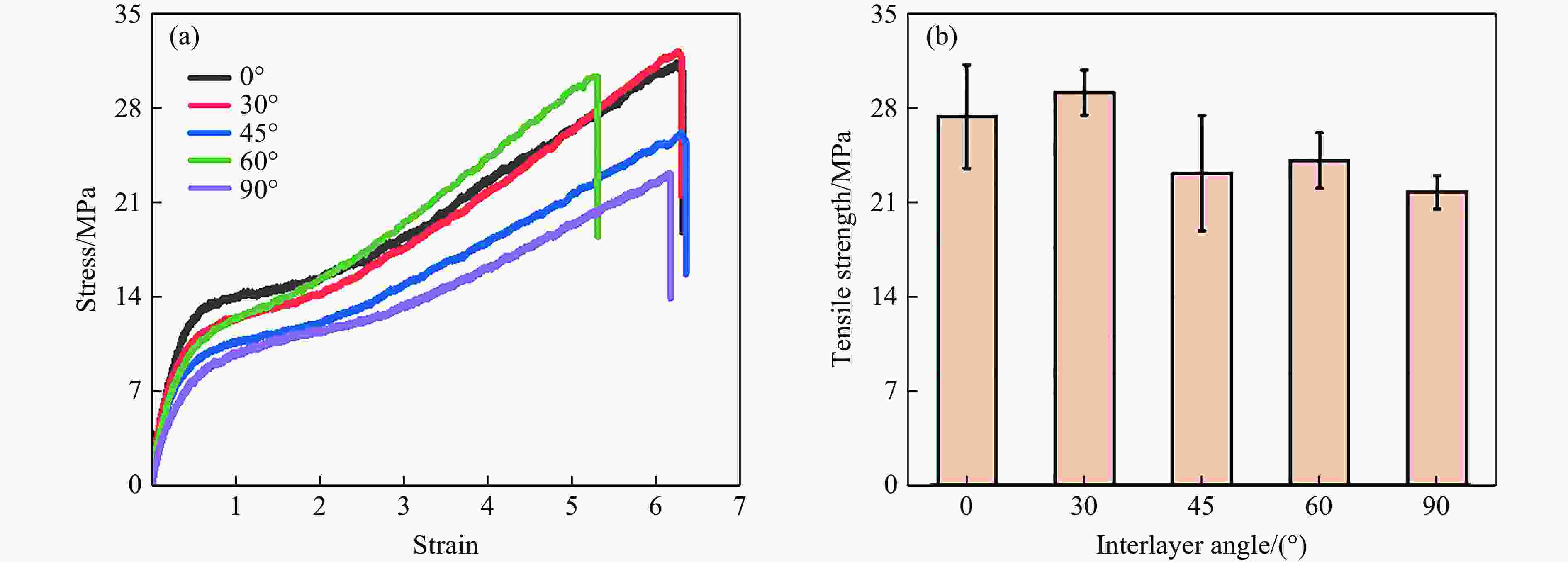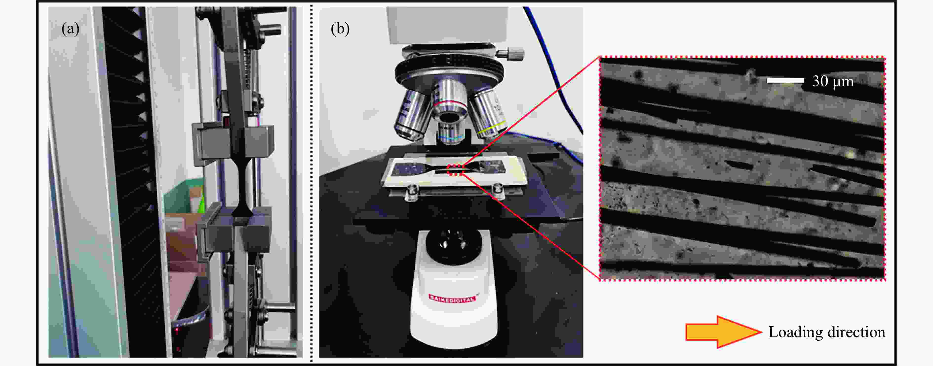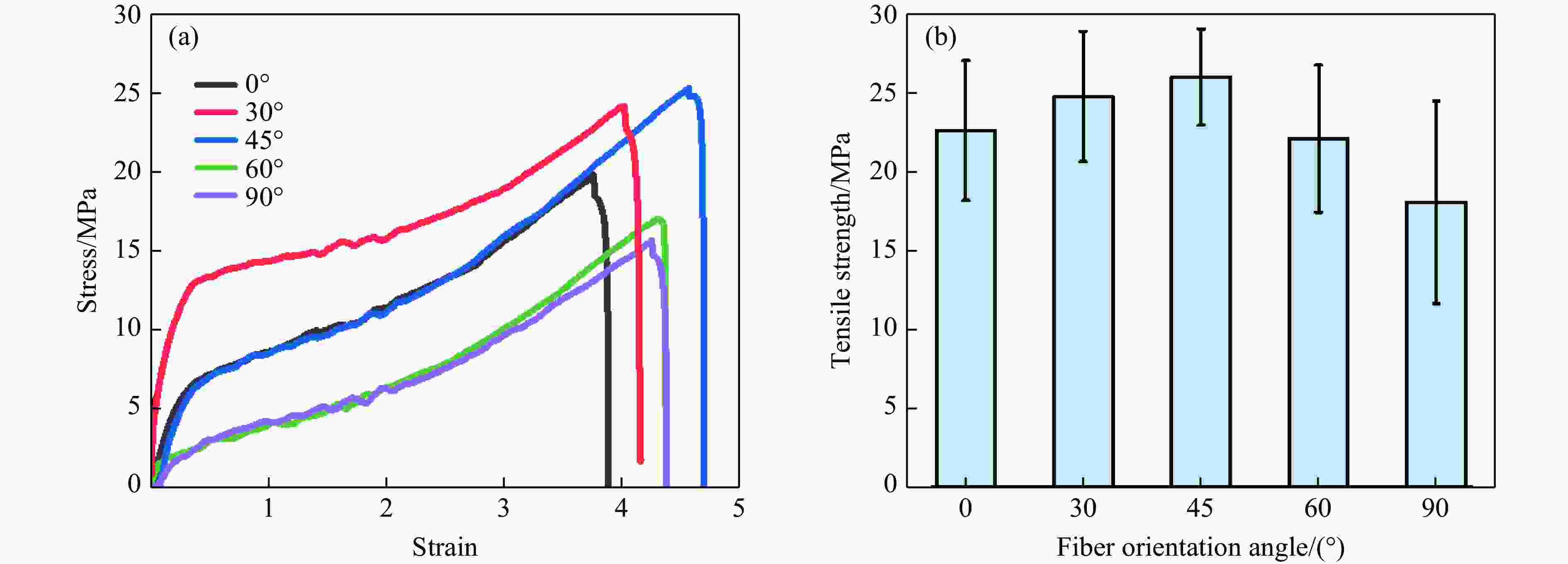 摘要: 在自然进化中,众多生物材料因其内部多级结构的精巧配合表现出卓越的力学性能。碳纤维作为一种性能优异的人工材料,为仿生材料设计与制备提供了重要的原材料支撑。以短碳纤维和聚氨酯为原料,发展了一种针管挤制和蒸发固化方法,制备出具有特定纤维取向的短碳纤维增强聚氨酯复合材料薄膜,利用叠层固化成型方法,制备出具有不同层间夹角的仿螳螂虾螺旋叠层结构材料。在此基础上,通过拉伸性能测试及拉伸过程中材料内部微观形貌表征,对该仿生材料的力学增强机理进行研究。结果表明:短碳纤维在薄膜材料中具有良好的取向一致性,当纤维取向角为45°时,单层薄膜的拉伸强度最高;在螺旋叠层结构中,当层间夹角为30°时,仿生材料的拉伸强度最高,这主要是由材料内部纤维端部引起的损伤破坏以及界面脱粘引起的失效破坏所调控。研究结果对于设计和制备高性能短纤维增强复合材料、实现其性能优化具有指导意义。Abstract: In natural evolution, numerous biomaterials exhibit astonishing mechanical properties due to the exquisite coordination of their internal structures at all levels. Carbon fiber, as an excellent artificial material, provides an important raw material support for the design of biomimetic materials. This study uses short carbon fibers and polyurethane as raw materials, combined with a syringe extrusion and thermal evaporation methods to prepare short carbon fiber reinforced polyurethane composite film with specific fiber orientation. Then, a spiral layered structure material resembling mantis shrimp with different interlayer angles was prepared using laminated assembly method. In addition, the mechanical strengthening mechanism of the material was studied by observing its morphology characteristics before and after stretching and measuring its tensile strength. The results show that short carbon fibers have good orientation consistency in thin film materials. When the fiber orientation angle is 45°, the tensile strength of the thin film material is the highest; when the interlayer angle is 30°, the tensile strength of short carbon fiber reinforced polyurethane biomimetic spiral structure material is the highest. The results of this study are of guiding significance for the design and preparation of high-performance short fiber reinforced composite materials, and for achieving their performance biomimetic optimization.