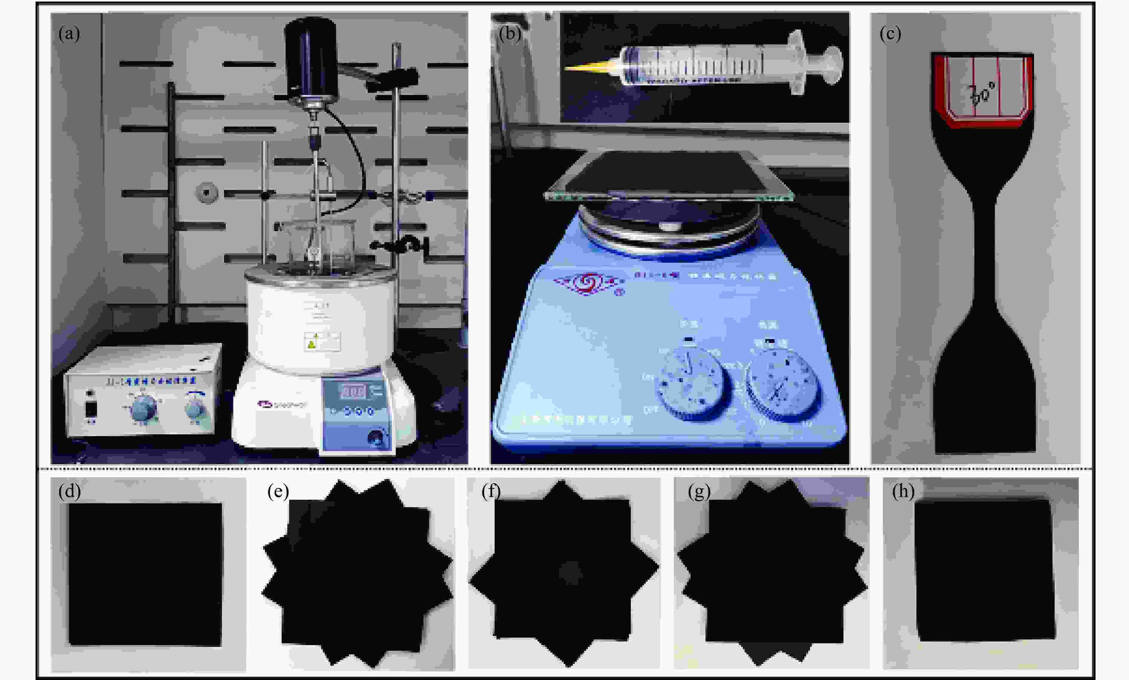 Figure 2. Experimental preparation tools and samples: (a) mechanical stirring device; (b) constant temperature heating device and needle tube; (c) 30° thin film specimen; (d)−(h) laminated samples with interlayer helix angles of 0°, 30°, 45°, 60°, and 90°, respectively