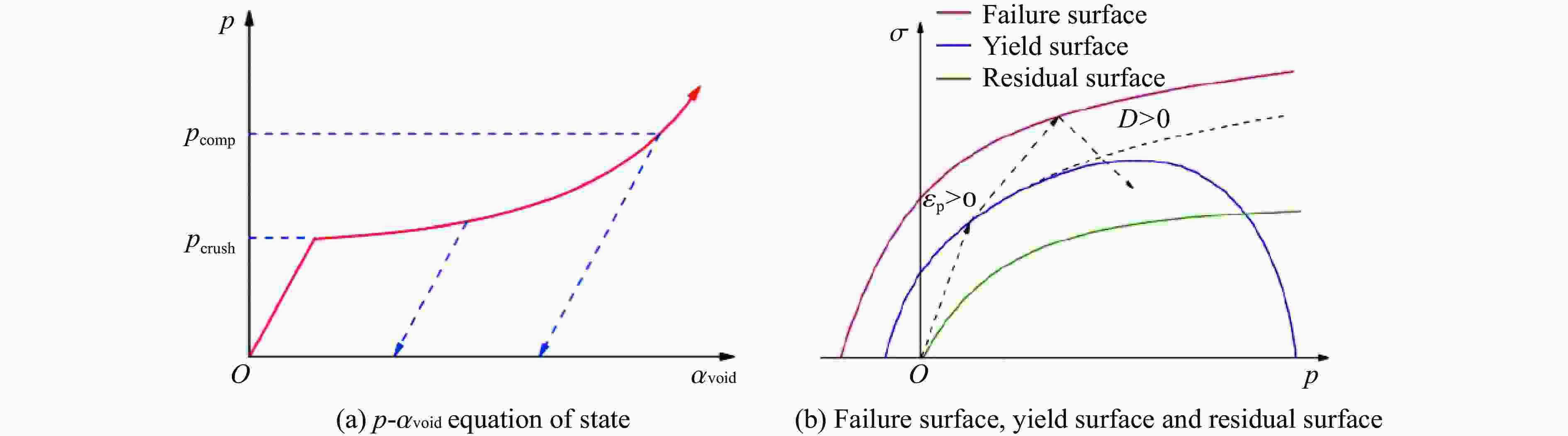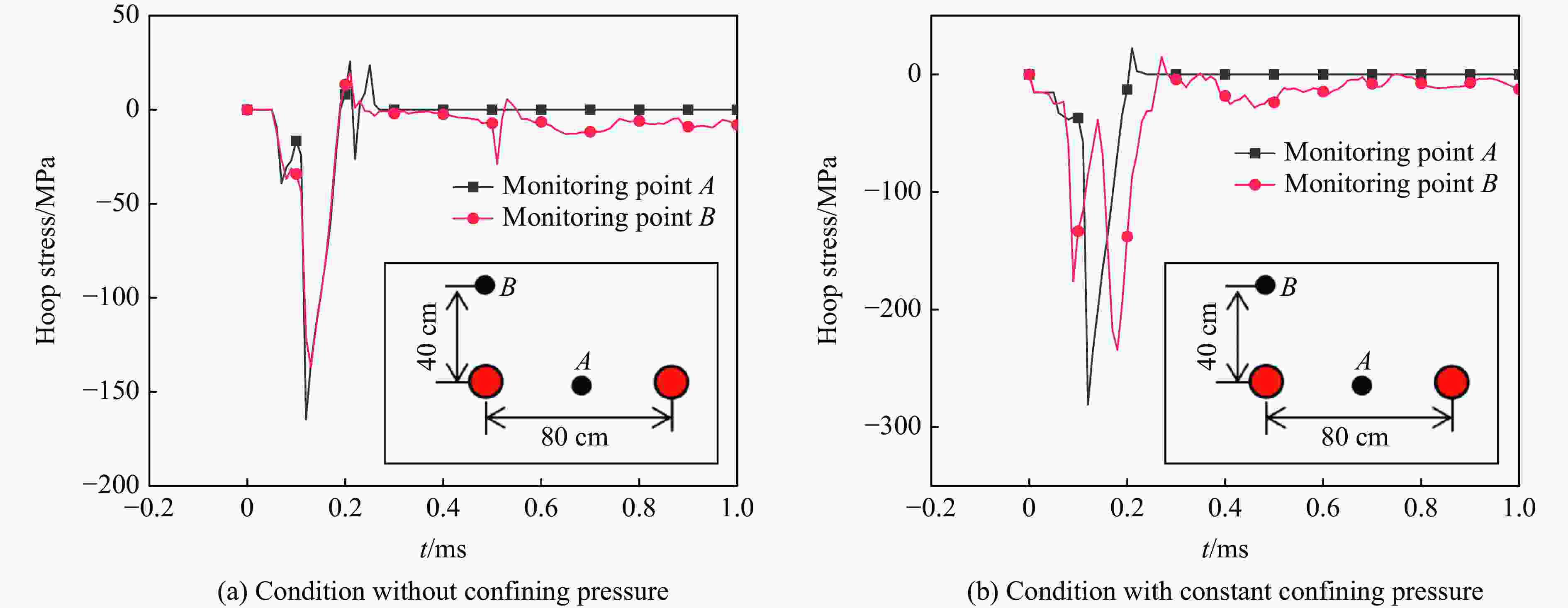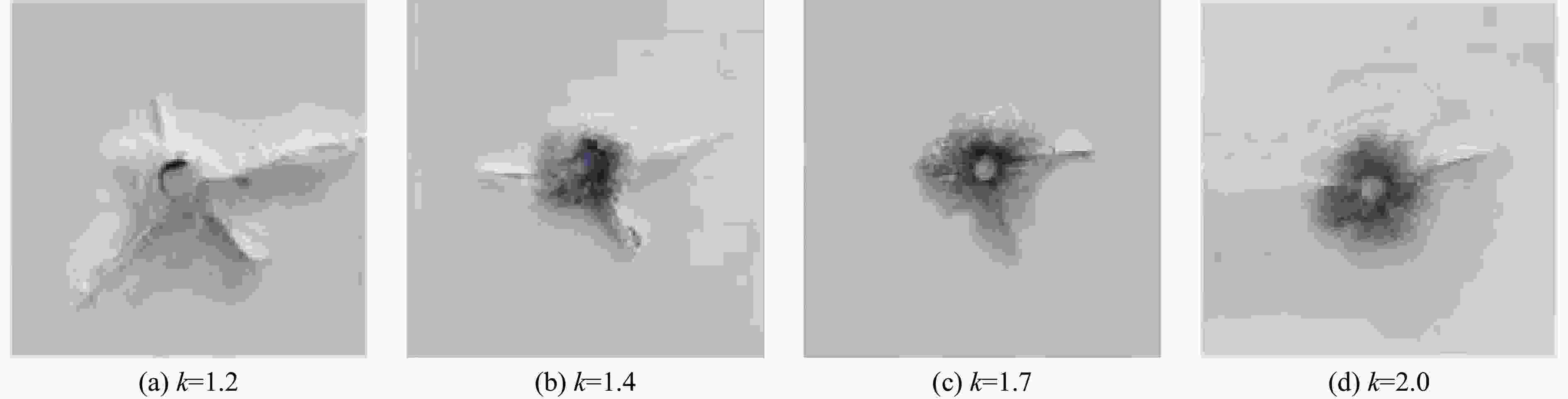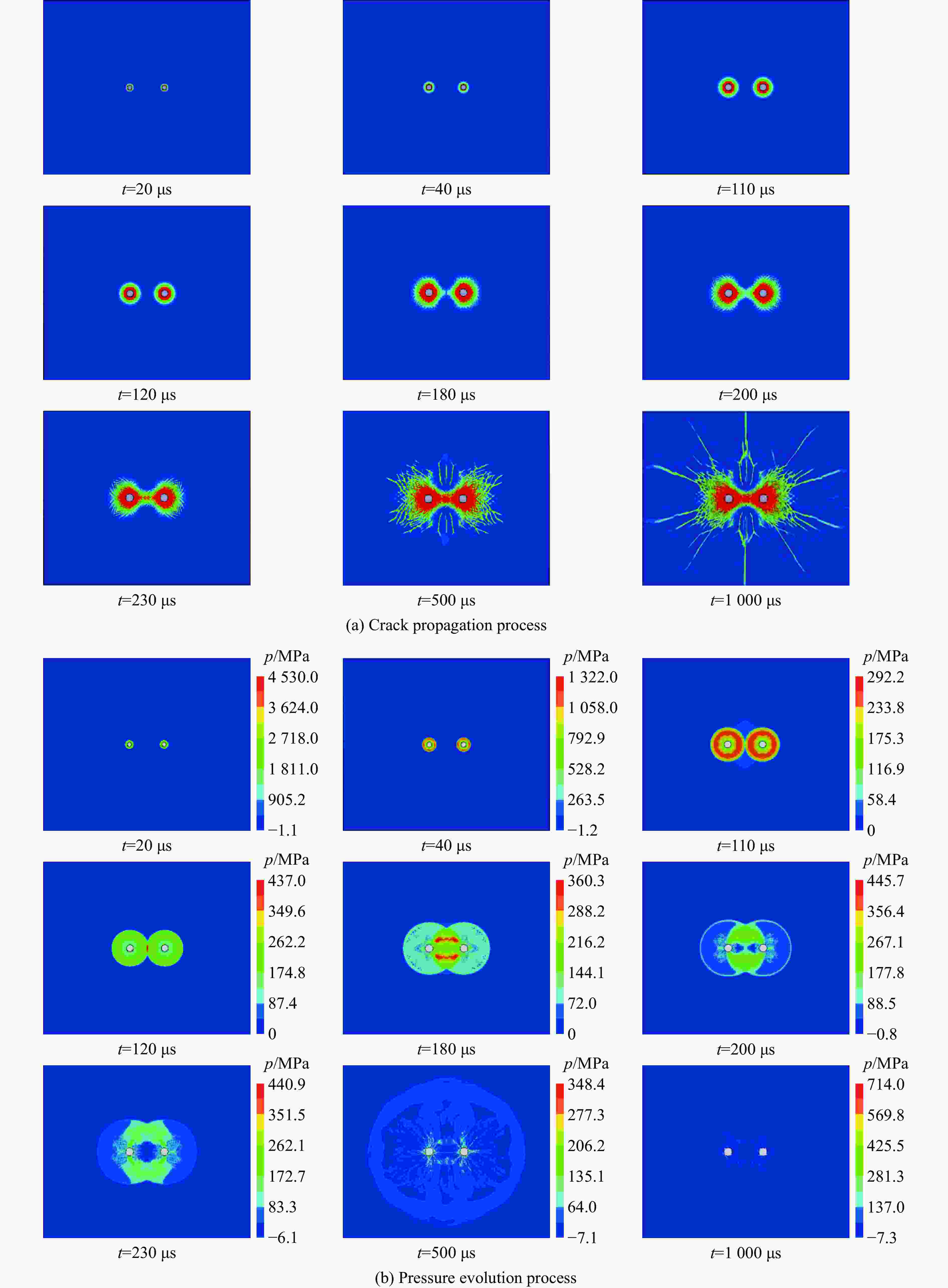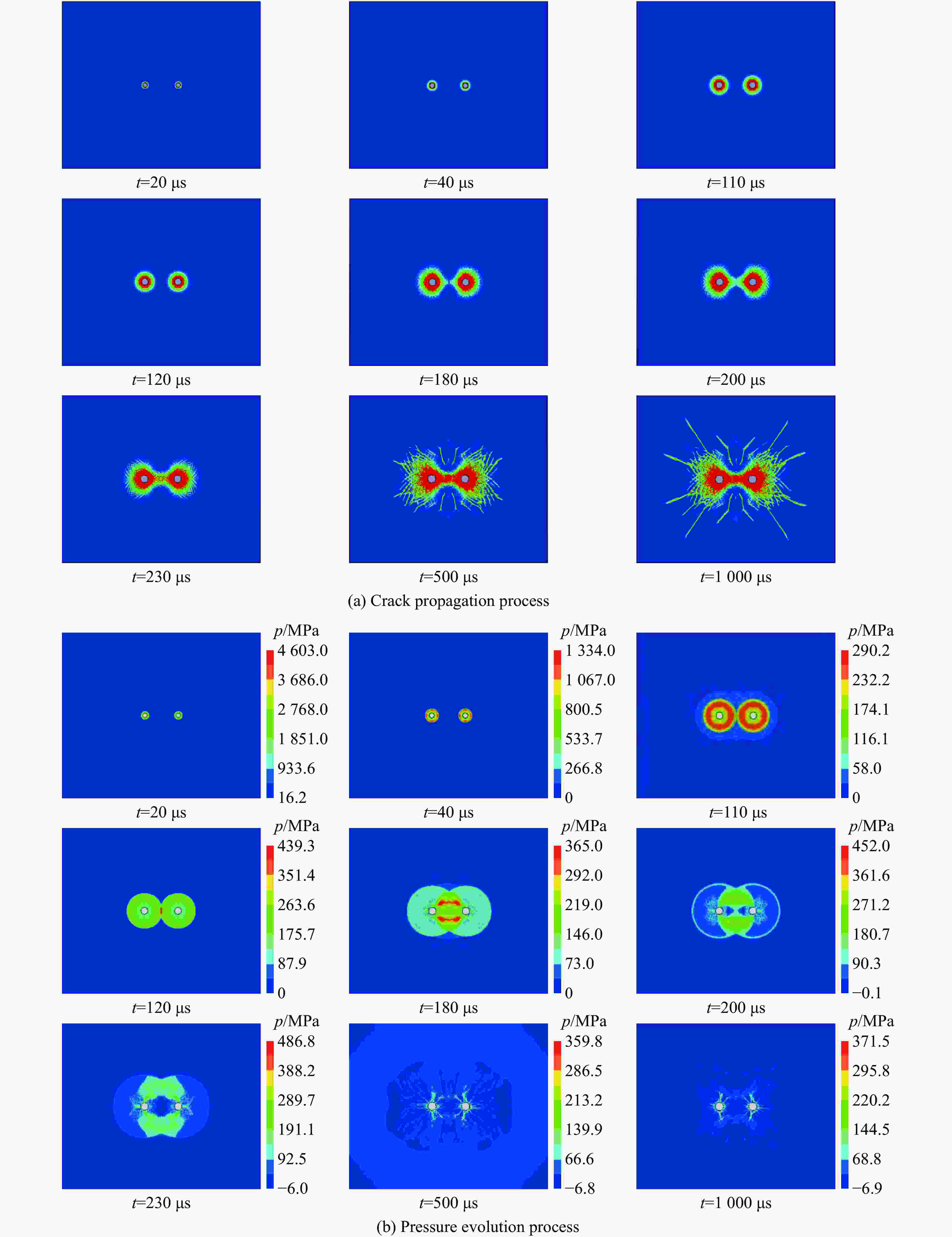 fc/GPa α0 pel/GPa βc βt A1/GPa A2/GPa A3/GPa B0 B1 T1/GPa 0.1678 1.0 0.0363 0.0102 0.0278 55.90 89.44 48.64 1.6 1.6 55.90 T2/GPa $ \dot\varepsilon {_0^{\,}}^{ \text{c}}/{\rm{s}}^{-1} $ $ \dot\varepsilon {_0^{\,}}^{ \text{t}}/{\rm{s}}^{-1} $ $ \dot\varepsilon ^{\text{c}} /{\rm{s}}^{-1}$ $\dot\varepsilon ^{\text{t}} /{\rm{s}}^{-1}$ D1 D2 B $g_{\rm{t}}^*$ A n 0 3.0×10−5 3.0×10−6 3.0×1025 3.0×1025 0.04 1 0.05 0.7 2.51 0.72 pcomp/MPa $f_\text{s}^*$ $f_\text{t}^*$ Q0 $g_{\rm{c}}^* $ ξ $\varepsilon _\text{p}^{\text{m} }$ Af nf N 6.00 0.21 0.04 0.68 0.53 0.5 0.015 0.25 0.62 3.00 表 3 炸药材料和JWL状态方程参数