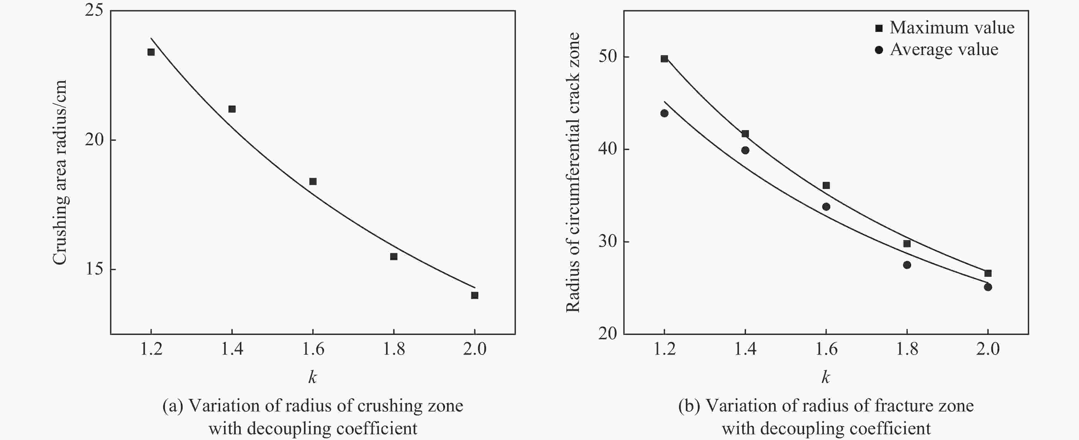 摘要: 通过数值模拟,研究了有无地应力条件下深部岩石爆破过程中裂纹扩展与不耦合装药系数之间的关系。模拟结果表明:初始地应力对爆破裂纹产生和扩展的影响较大;粉碎区半径、裂隙区半径、径向裂纹扩展最大长度以及炮孔孔壁应力峰值均随不耦合装药系数的增大而降低。通过动焦散相似试验,根据不同不耦合系数对应的径向裂纹扩展长度,构建了径向裂纹扩展长度与不耦合系数间的关系式,关系式与试验结果的拟合度达0.974。深部岩体爆破开挖过程中,可根据径向裂纹扩展长度与不耦合系数之间的关系设计爆破参数,以达到高效率爆破开采的目的。研究结果可为矿山深部高效率爆破开采提供一定的参考。Abstract: Through numerical simulation, the relation between the crack propagation during deep rock blasting and the decoupling charge coefficient under the conditions of in-situ stress or not was studied. The simulation results showed that the initial ground stress has a great influence on the generation and the propagation of blasting cracks. The radius of the crushing zone, the radius of the crack zone, the maximum length of radial crack propagation, and the peak stress of the blast hole wall all decrease with the increase of the decoupling coefficient. According to the radial crack propagation lengths under different decoupling coefficients obtained by dynamic caustic similarity test, a relation between the radial crack propagation length and the decoupling coefficient was established, and the degree of fit reaches 0.974. During the process of deep rock blasting excavation, the blasting parameters can be designed according to the relation between the radial crack propagation length and the decoupling coefficient, so as to realize high efficiency blasting mining. This study provides some reference for the background of deep mining.