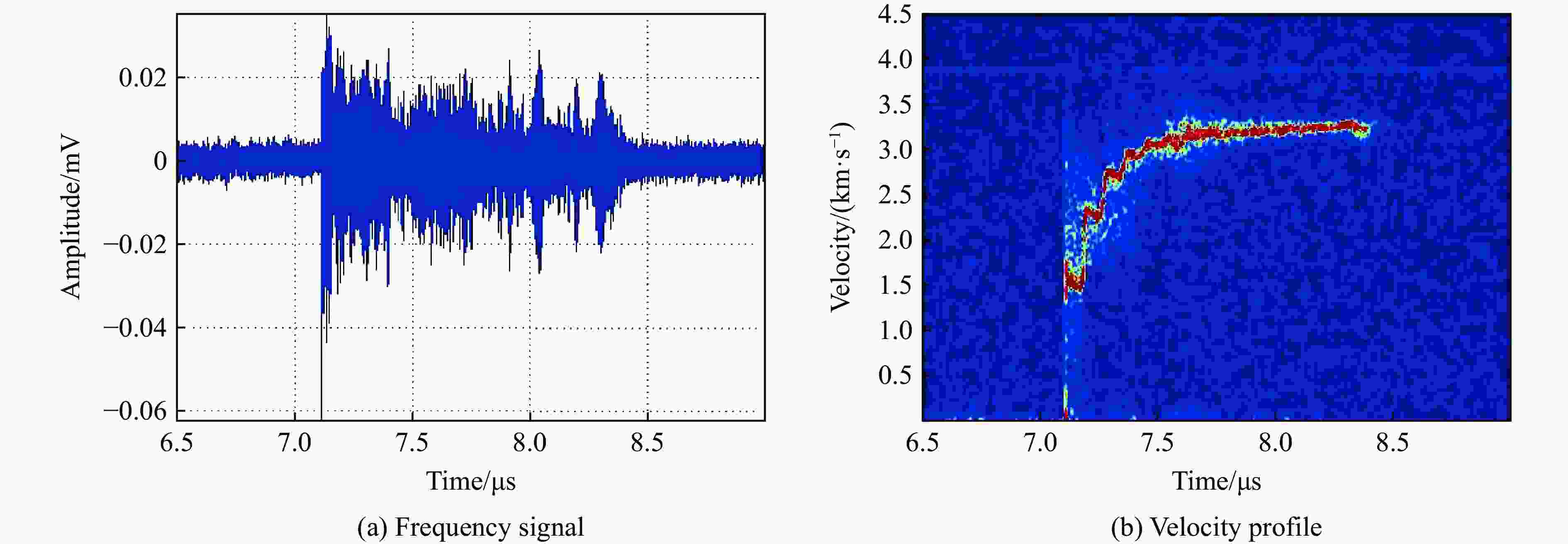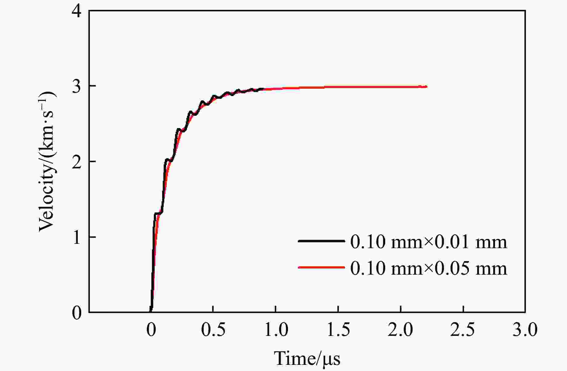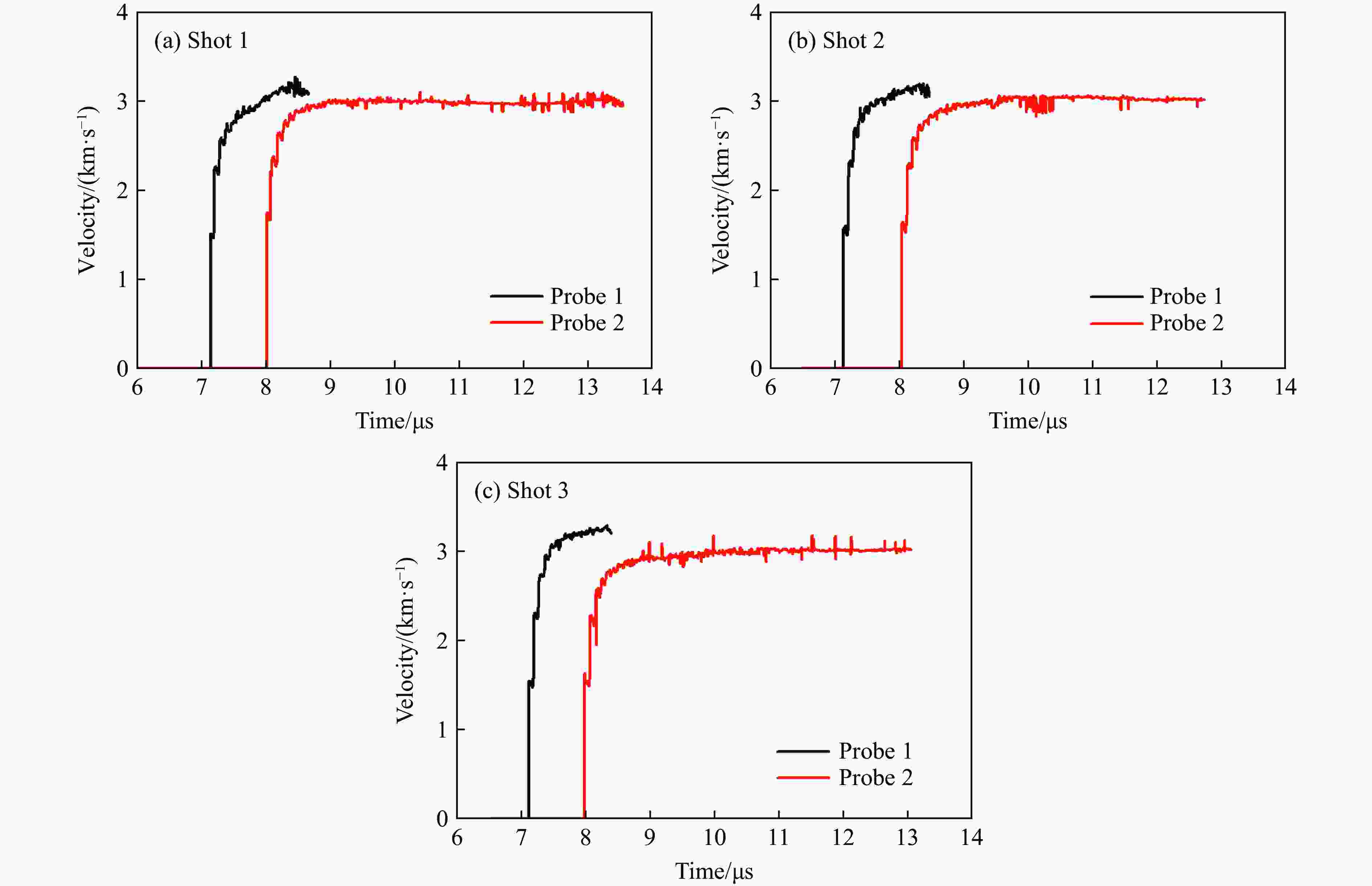 Shot No. Maximum velocity/(m∙s−1) Probe 1 Probe 2 1 3163.6 3004.6 2 3167.4 3050.1 3 3246.8 3016.0 表 3 速度起跳时间与爆轰波传播速度计算结果