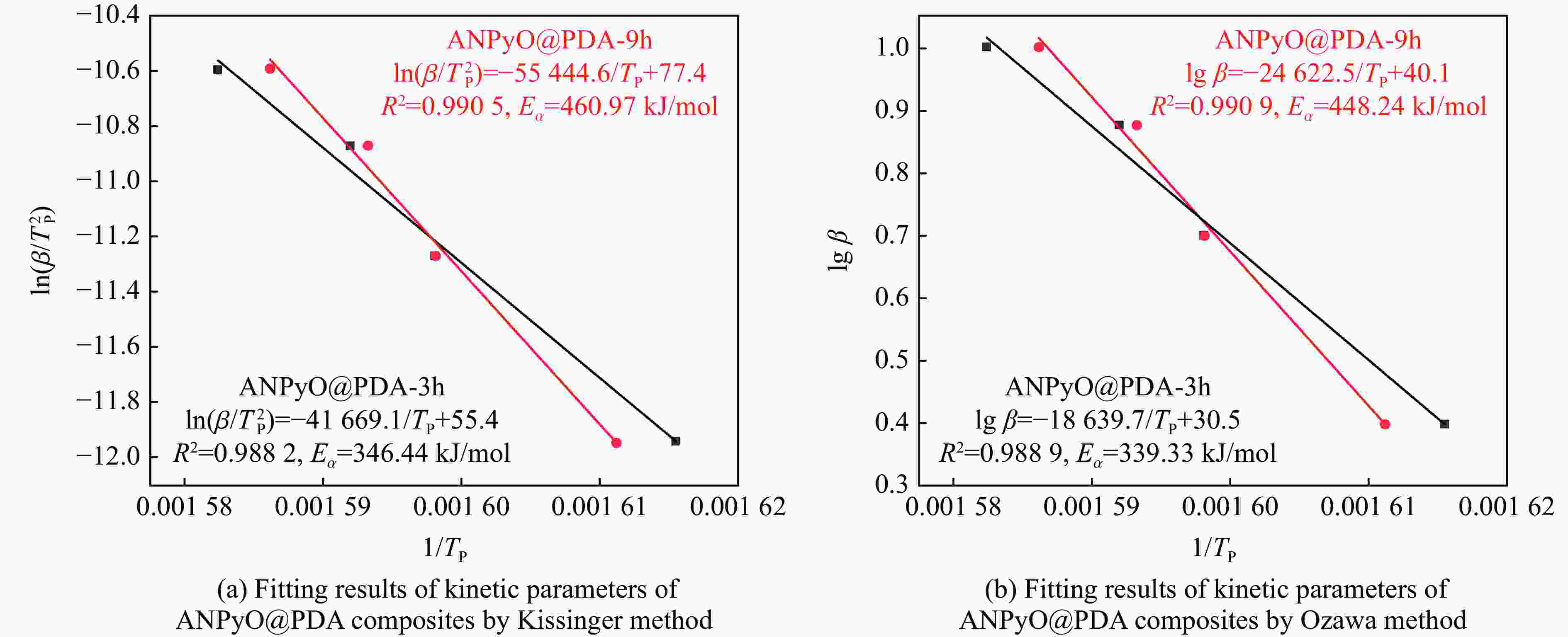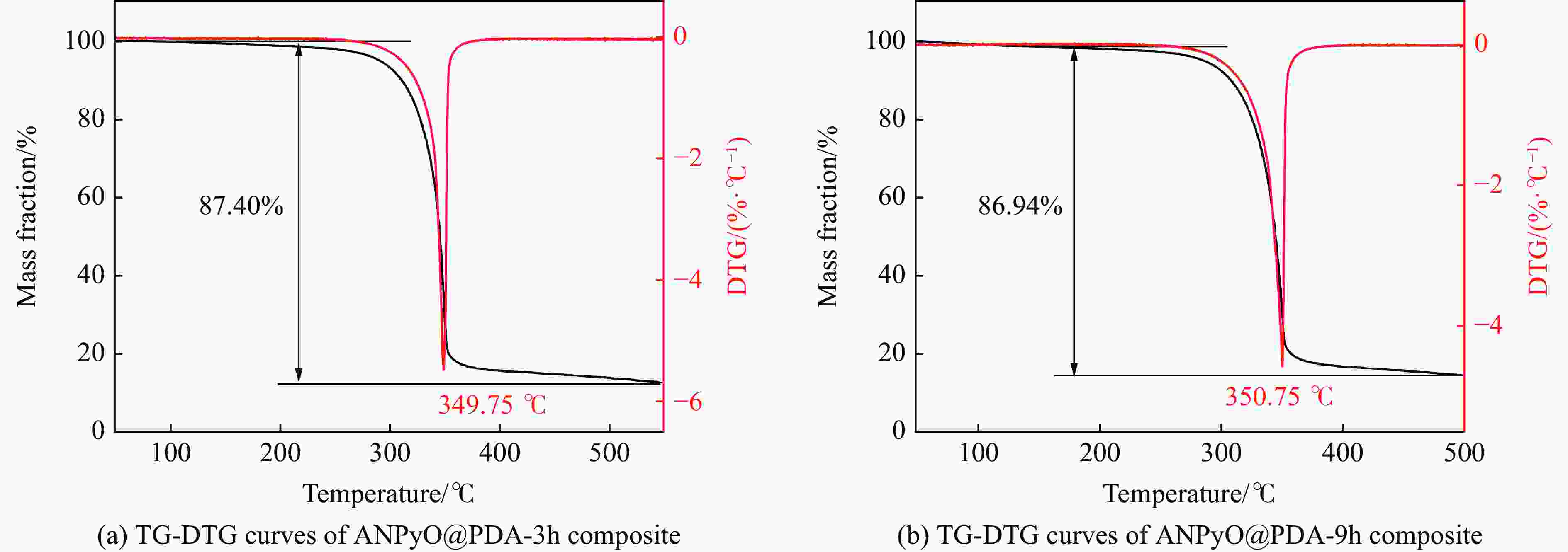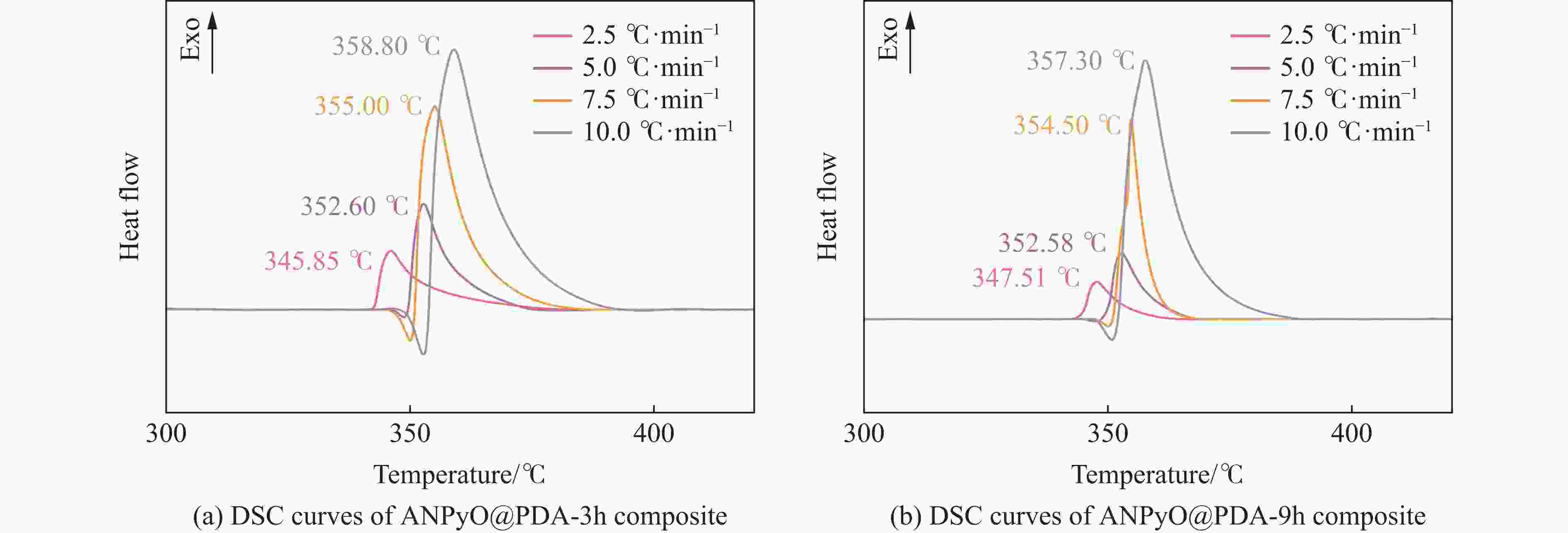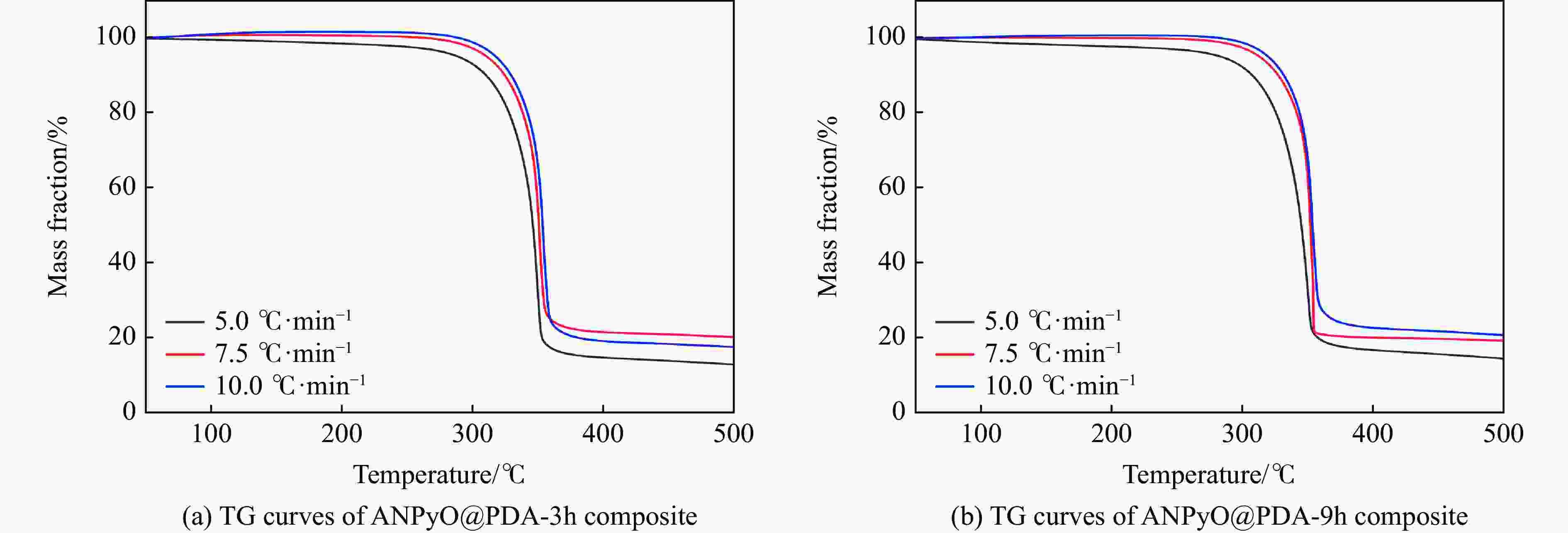 Samples wC1s/% wN1s/% wO1s/% Atomic ratio of N to C ω/% ANPyO 36.92 34.33 28.75 0.93 ANPyO@PDA-3h 42.00 29.41 28.59 0.70 14.33 ANPyO@PDA-6h 51.06 22.85 26.09 0.45 33.44 ANPyO@PDA-9h 58.57 12.14 29.29 0.21 64.63 PDA 70.82 7.65 21.53 0.11 表 2 ANPyO和ANPyO@PDA复合材料的热分解动力学参数
