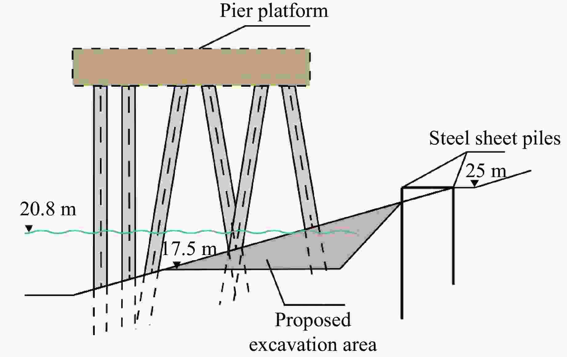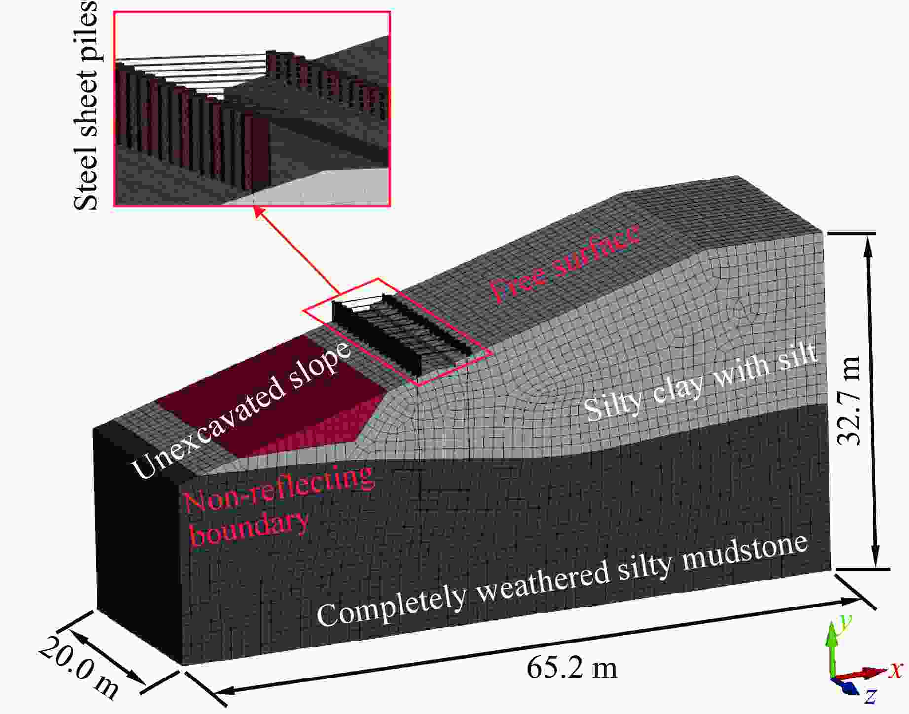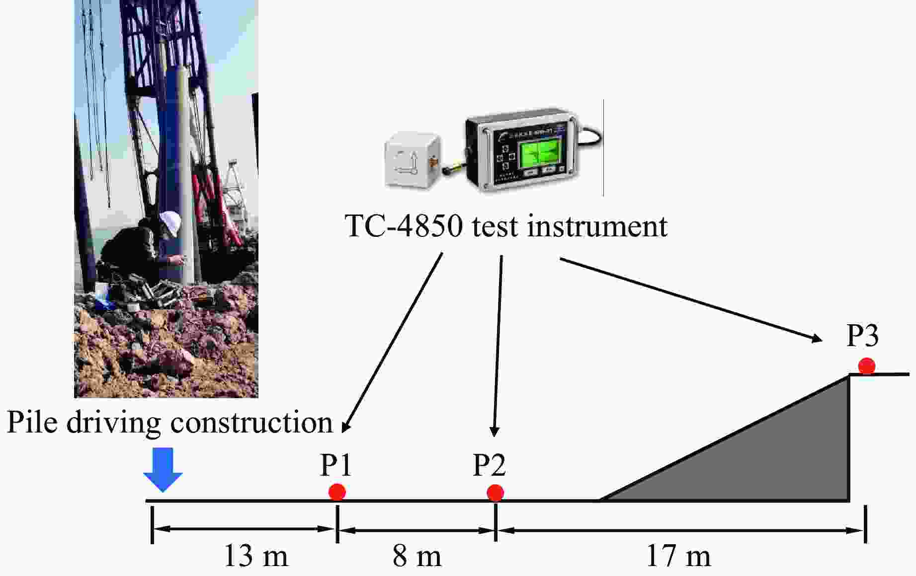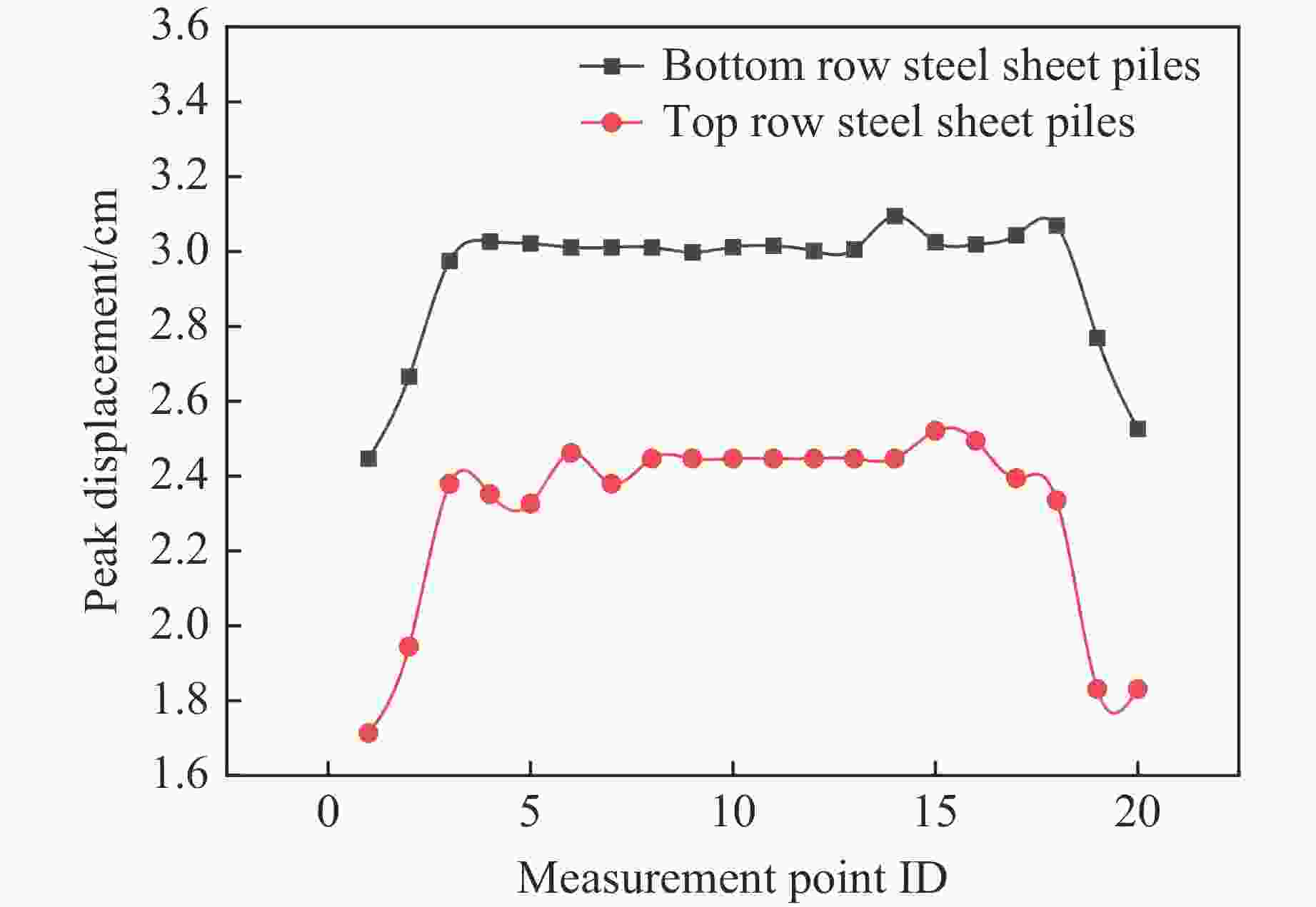 摘要: 岸坡锤击管桩施工过程中,为保证岸坡的安全稳定性,准确评估桩锤的动力荷载作用对岸坡支护钢板桩结构的影响非常重要。针对华容煤炭某码头一期工程,采用动力有限元数值模拟方法建立双排悬挂钢板桩结构计算模型;结合现场振动测试验证,分析桩锤振动作用下双排钢板桩的动力响应特性,实现桩锤振动影响下双排钢板桩的安全性评价。结果表明:钢板桩的位移变形与锤击位点相对位置的关系不大,上、下排钢板桩的最大位移分别为2.51和3.14 cm;最大主应力与锤击位点相对位置的关系不大,上、下排钢板桩的最大主应力均小于20 MPa;Mises应力最大值出现在钢板桩与锤击点垂直连线处,上、下排钢板桩的最大Mises应力分别为20.85和25.40 MPa。双排钢板桩的位移变形与应力处于安全控制范围内。Abstract: During the construction process of pile driving on nearshore slope, it is crucial to accurately assess the impact of dynamic loading from the pile hammer on the stability and safety of the slope’s supporting steel sheet pile structure. In the case of the first phase of the dock project at Huarong, a dynamic finite element numerical simulation method was employed to establish a computational model for the double-row suspended steel sheet pile structure. Through field vibration testing verification, the dynamic response characteristics of the double-row steel sheet piles under the influence of pile hammer impact were analyzed, enabling the evaluation of the safety of the double-row steel sheet piles. The research findings revealed that the displacement deformation of the steel sheet piles had little correlation with the impact location of the hammer. The maximum displacement of the lower row of steel sheet piles was 3.14 cm, while the maximum displacement of the upper row was 2.51 cm. The maximum principal stress had no significant relationship with the impact location, and the maximum principal stress of both the upper and lower rows of steel sheet piles was less than 20 MPa. The maximum von Mises stress occurred at the intersection between the steel sheet pile and the vertical line passing through the impact point of the hammer. The maximum von Mises stress for the upper row of steel sheet piles was 20.85 MPa, while for the lower row it was 25.40 MPa. The displacement deformation and stress of the double-row steel sheet piles remained within the safe control range.