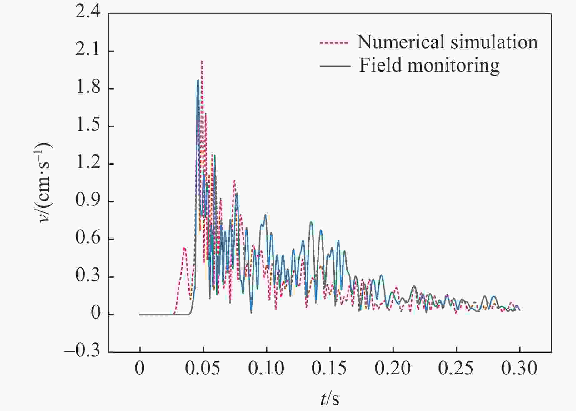 No. Burst distance/m Test PPV/(cm·s−1) Simulated PPV/(cm·s−1) Relative error/% 1 13 2.023 1.867 7.7 2 21 0.638 0.576 9.7 3 38 0.159 0.205 28.9 -