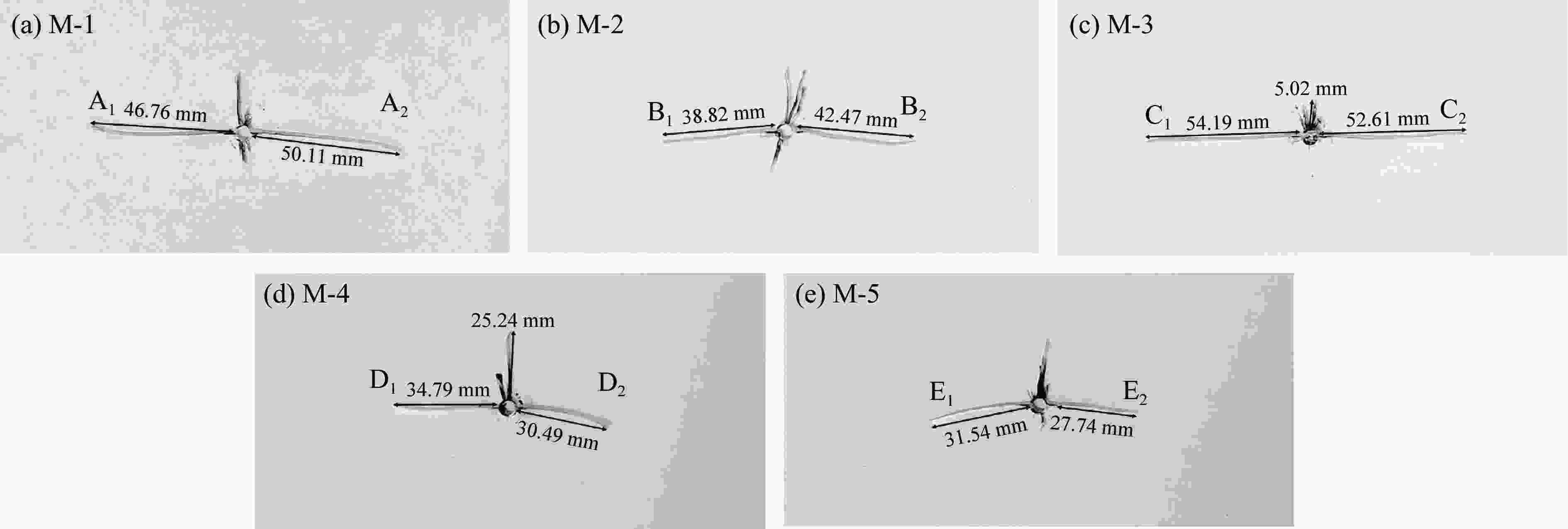 Scheme Main crack No. Main crack length/mm Average length/mm M-1 A1 46.76 48.44 A2 50.11 M-2 B1 38.82 40.65 B2 42.47 M-3 C1 54.19 53.40 C2 52.61 M-4 D1 34.79 32.64 D2 30.49 M-5 E1 31.54 29.64 E2 27.74 -