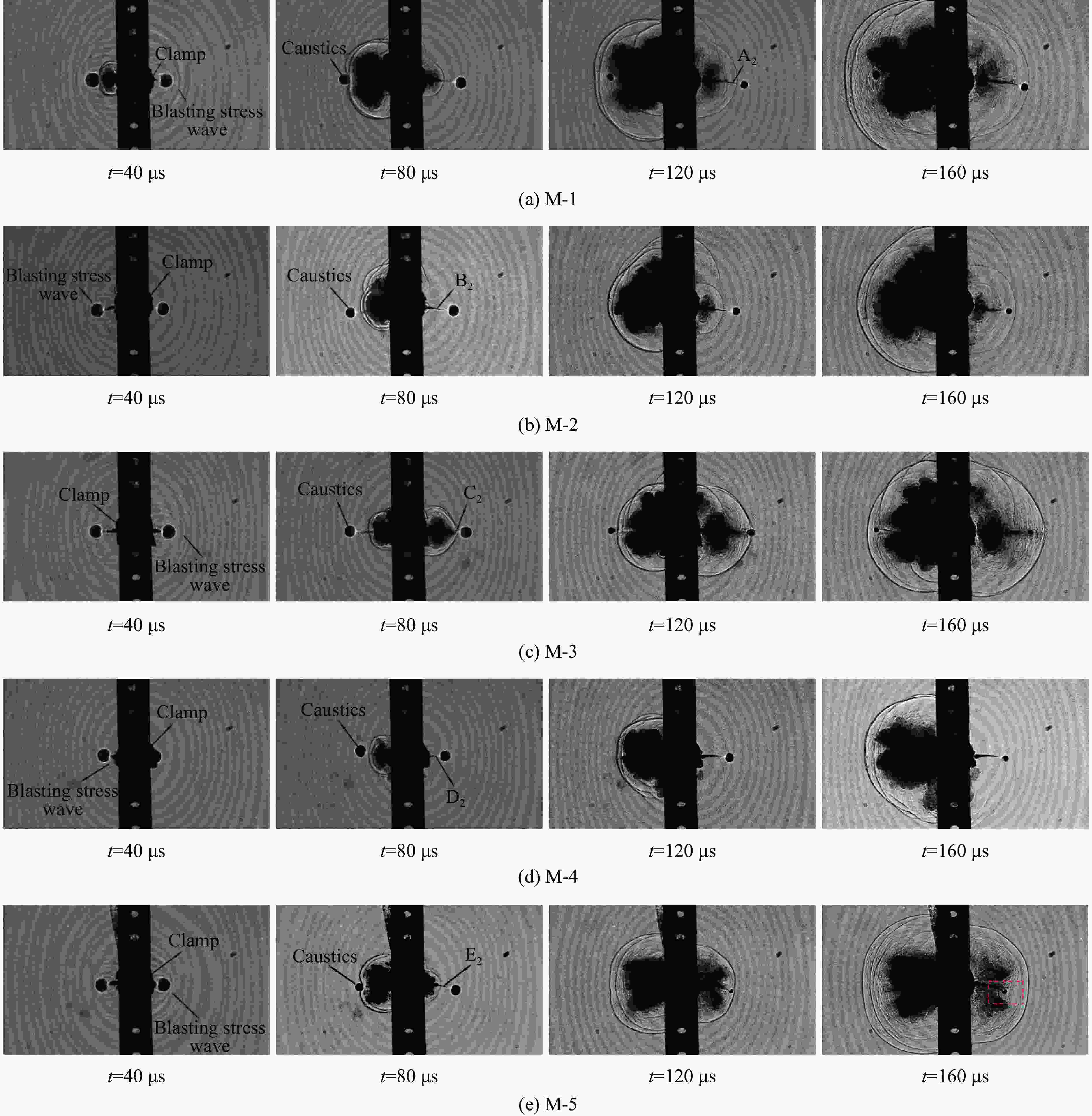 摘要: 深部煤矿爆破是初始地应力场与爆炸荷载共同作用的结果,采用单向动-静组合加载试验平台和动态焦散线试验系统,在有机玻璃板上施加与炮孔切槽平行或垂直的单向围压作用,探究了初始应力场强度对爆生裂纹的扩展规律。结果表明:炮孔切槽能够有效控制初始应力场的分布范围,促进能量集中释放,提高定向爆破效果,同时爆炸动载荷与围压静载荷分别在炮孔近区和远区占主导作用;水平初始应力场增强了切槽尖端应力集中程度,促进了主裂纹的扩展,且随着应力场增强,促进效果越明显,同时抑制了次裂纹的产生;竖直初始应力场降低了切槽尖端的应力集中程度,抑制了裂纹扩展,并使裂纹扩展模式由Ⅰ型转变为Ⅰ-Ⅱ复合型,且随着应力场的增强,剪切断裂越明显,且裂纹沿最大主应力方向扩展。Abstract: The deep coal mine blasting is the combined action of the initial ground stress field and the explosion load. By using the unidirectional dynamic and static combined loading test platform and the dynamic caustic experimental system, the expansion law of the initial stress field intensity on the blasting crack is explored under the horizontal or vertical unidirectional confining pressure applied to the blasthole notch on the plexiglass plate. The test results show that the grooving of the blasthole can effectively control the distribution range of the initial stress field, promote the concentrated release of energy, and improve the directional blasting effect. At the same time, the dynamic effect of explosion and the static effect of confining pressure are dominant in the near and far areas of the blasthole, respectively. The horizontal initial stress field increases the stress concentration at the crack tip and promotes the growth of the main crack. With the increase of the stress field, the promotion effect is more obvious, and the occurrence of secondary cracks is inhibited. In contrast, the vertical initial stress field reduces the stress concentration at the notch tip, inhibits the crack propagation, and transforms the crack from type Ⅰ fracture to type Ⅰ-Ⅱ mixed fracture. With the increase of stress field, the shear fracture is more obvious, and the crack propagates along the direction of the maximum principal stress.