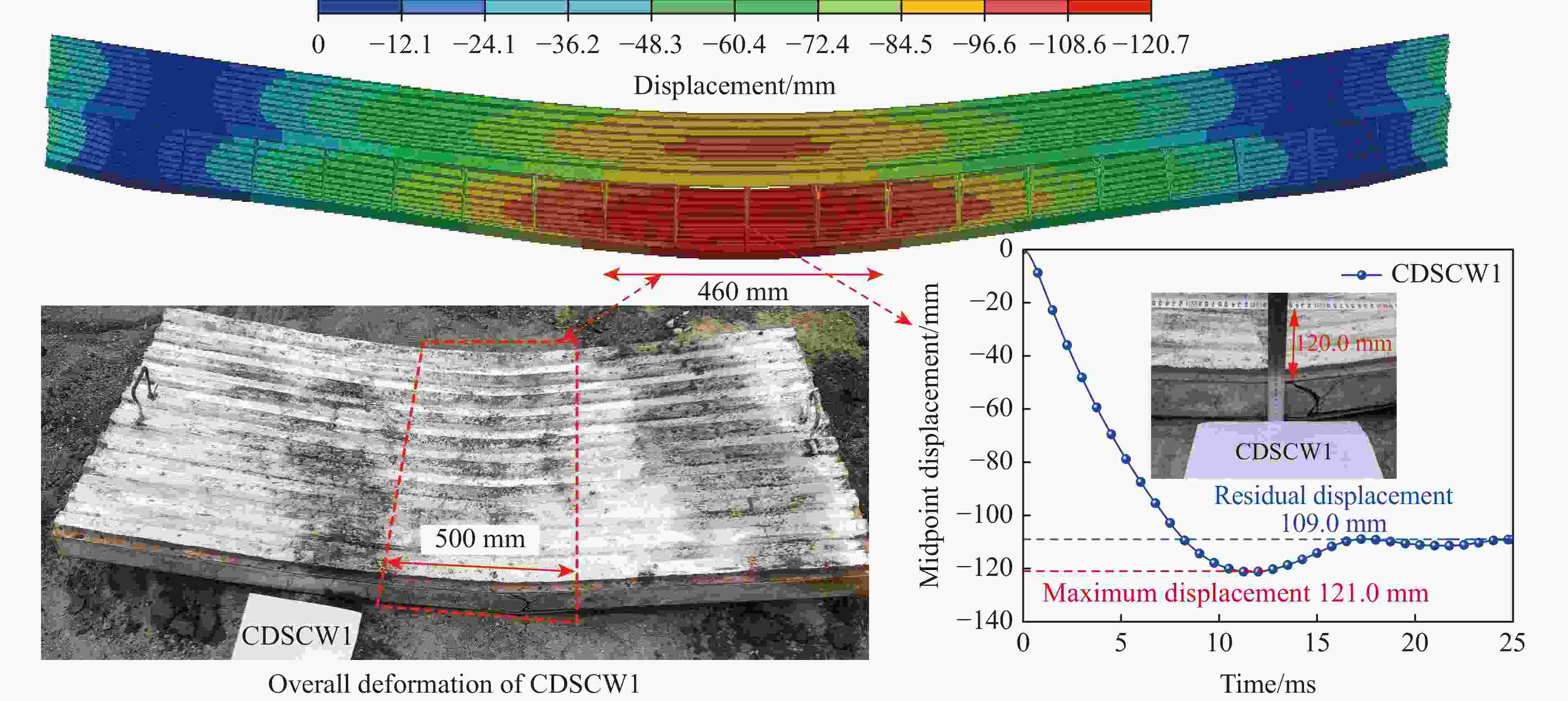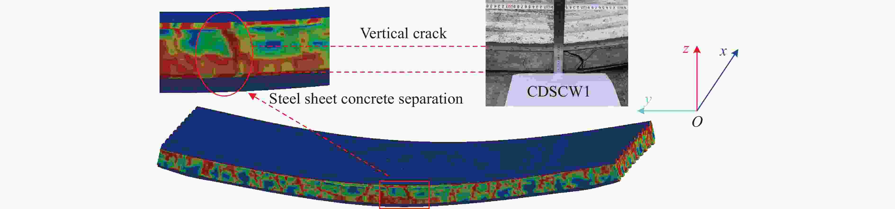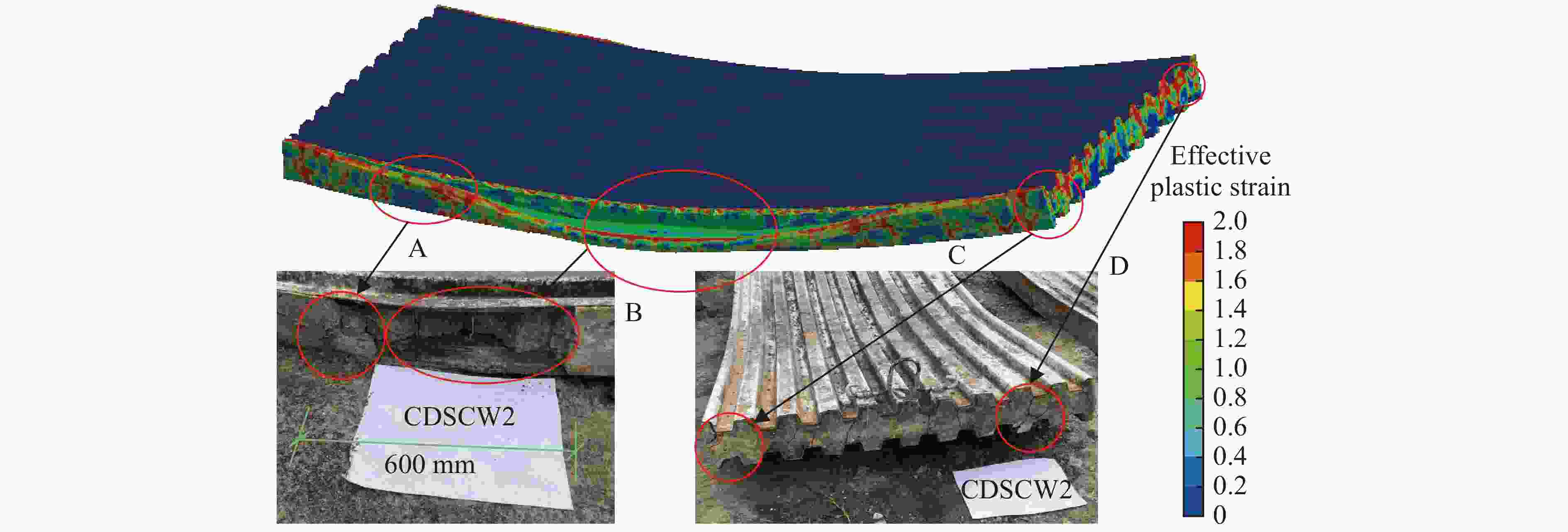 • 摘要: 相对于传统的钢筋混凝土墙板和平面双钢板-混凝土组合墙板(profiled double-skin composite wall,PDSCW),波纹双钢板-混凝土组合墙板(concrete-infilled double steel corrugated-plate wall,CDSCW)具有更高的轴向抗压承载力、更大的侧向抗弯刚度以及良好的抗冲击和抗震性能,在船舶和军事领域有广阔的应用前景。制作2种CDSCW试件,通过近场爆炸试验对比分析了2种试件的损伤模式及动态响应;采用ANSYS/LS-DYNA软件建立了CDSCW和PDSCW的有限元模型,研究了近场爆炸下2种混凝土组合墙板的损伤机理和爆炸响应,并与试验结果进行对比分析;分析了混凝土厚度、钢板厚度、药量对CDSCW抗爆性能的影响。结果表明:近场爆炸作用下,相较于PDSCW,相同混凝土方量和尺寸(长、宽)的CDSCW具有更大的抗弯刚度、更强的抗变形能力以及更优的抗爆性能;增加波纹深度能有效提高CDSCW的抗爆性能,可为抗爆构件设计和相关工程研究提供参考。