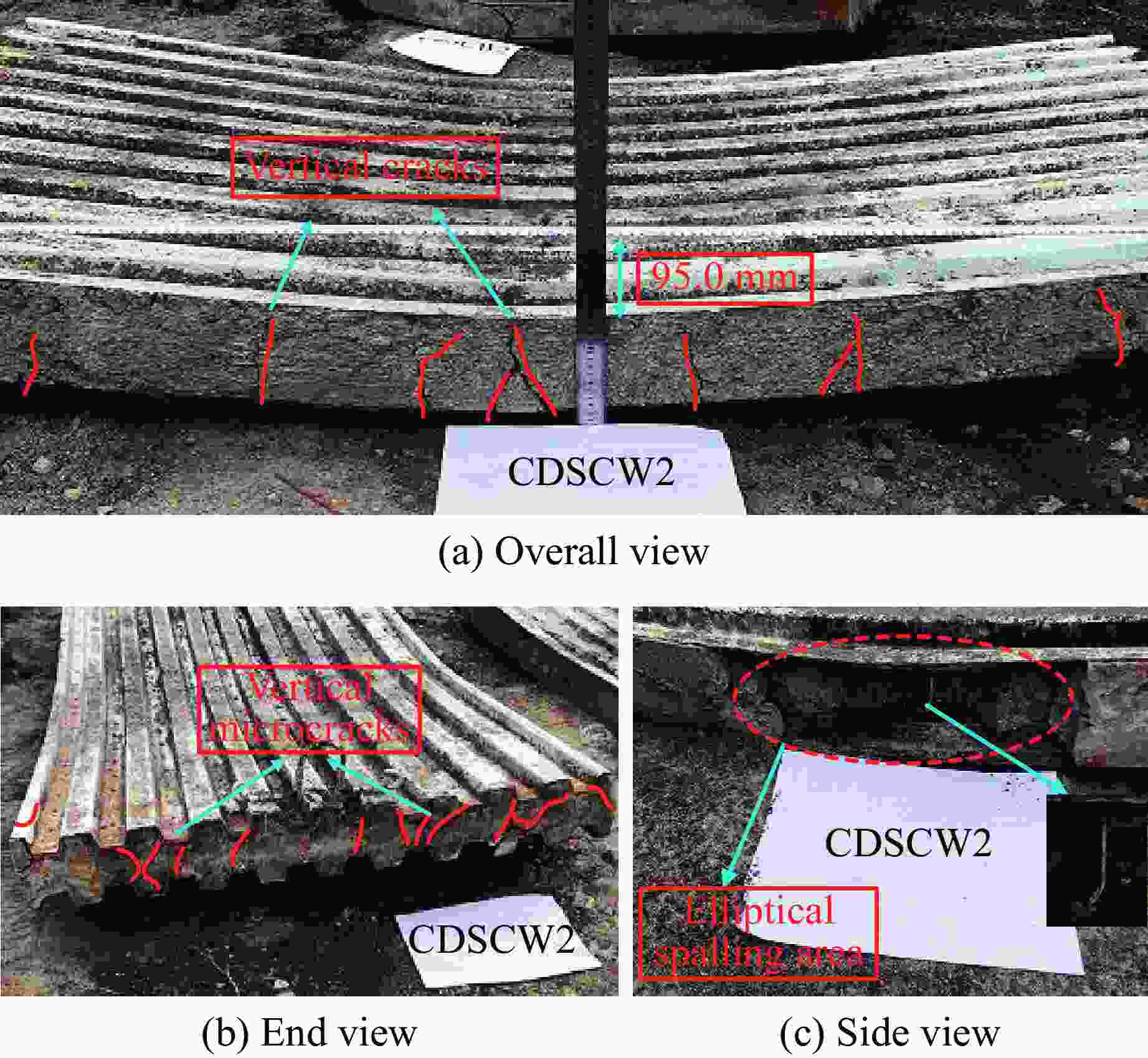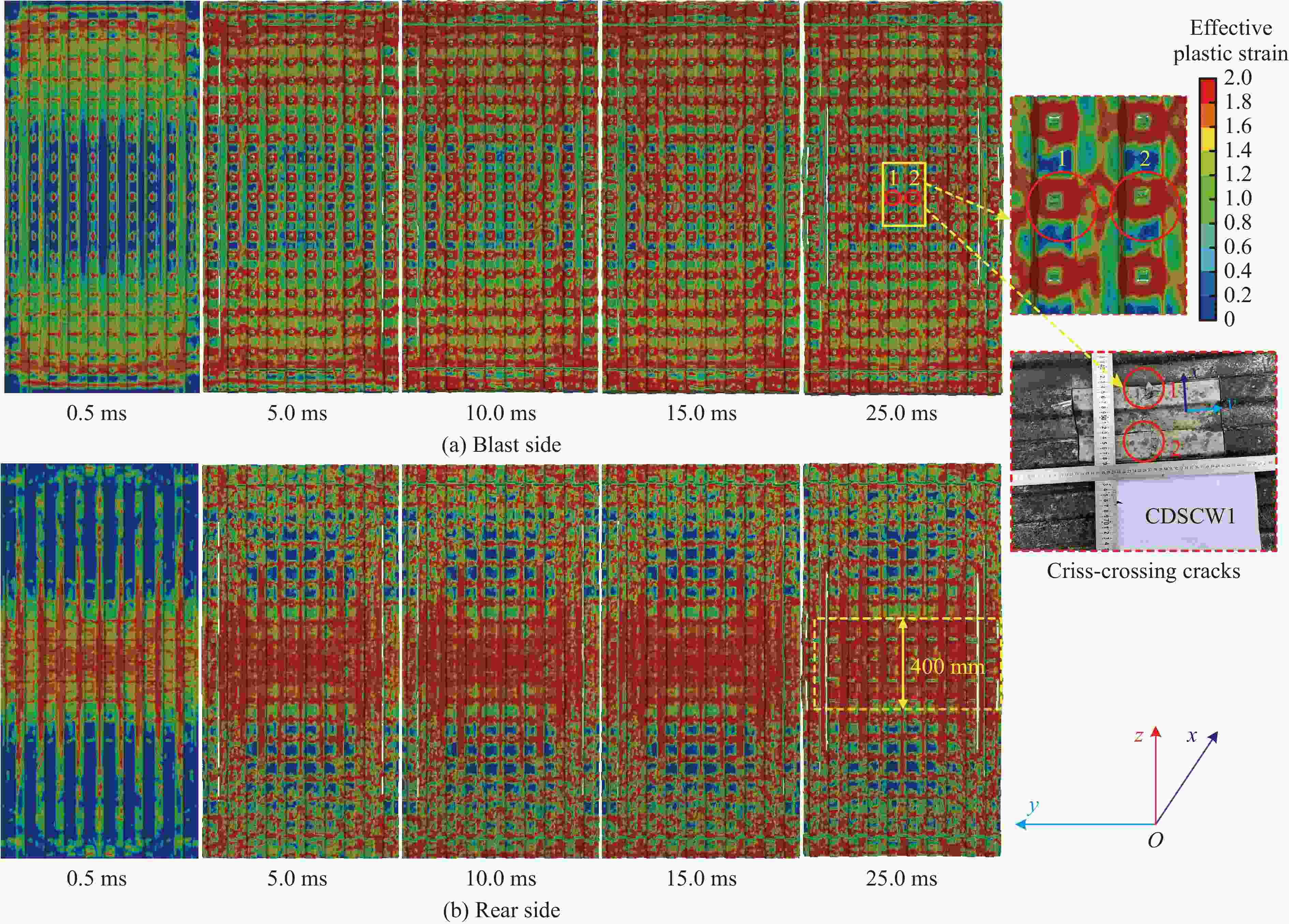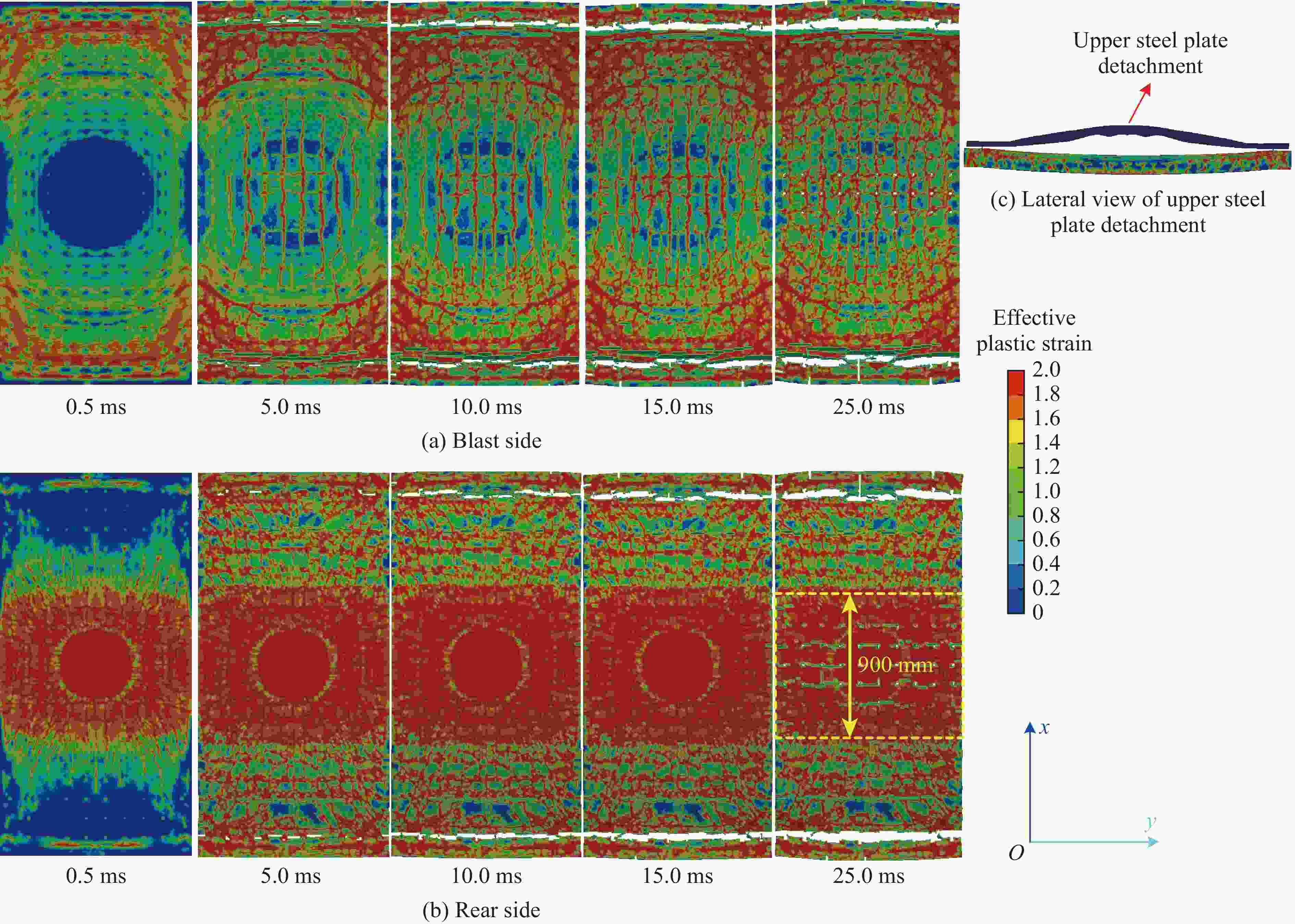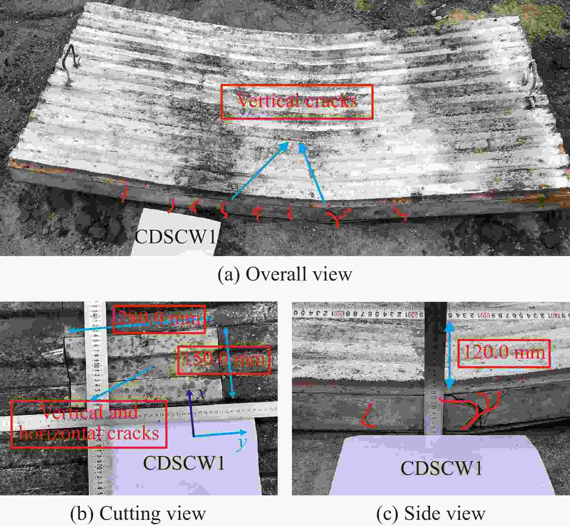 • 摘要: 相对于传统的钢筋混凝土墙板和平面双钢板-混凝土组合墙板(profiled double-skin composite wall,PDSCW),波纹双钢板-混凝土组合墙板(concrete-infilled double steel corrugated-plate wall,CDSCW)具有更高的轴向抗压承载力、更大的侧向抗弯刚度以及良好的抗冲击和抗震性能,在船舶和军事领域有广阔的应用前景。制作2种CDSCW试件,通过近场爆炸试验对比分析了2种试件的损伤模式及动态响应;采用ANSYS/LS-DYNA软件建立了CDSCW和PDSCW的有限元模型,研究了近场爆炸下2种混凝土组合墙板的损伤机理和爆炸响应,并与试验结果进行对比分析;分析了混凝土厚度、钢板厚度、药量对CDSCW抗爆性能的影响。结果表明:近场爆炸作用下,相较于PDSCW,相同混凝土方量和尺寸(长、宽)的CDSCW具有更大的抗弯刚度、更强的抗变形能力以及更优的抗爆性能;增加波纹深度能有效提高CDSCW的抗爆性能,可为抗爆构件设计和相关工程研究提供参考。