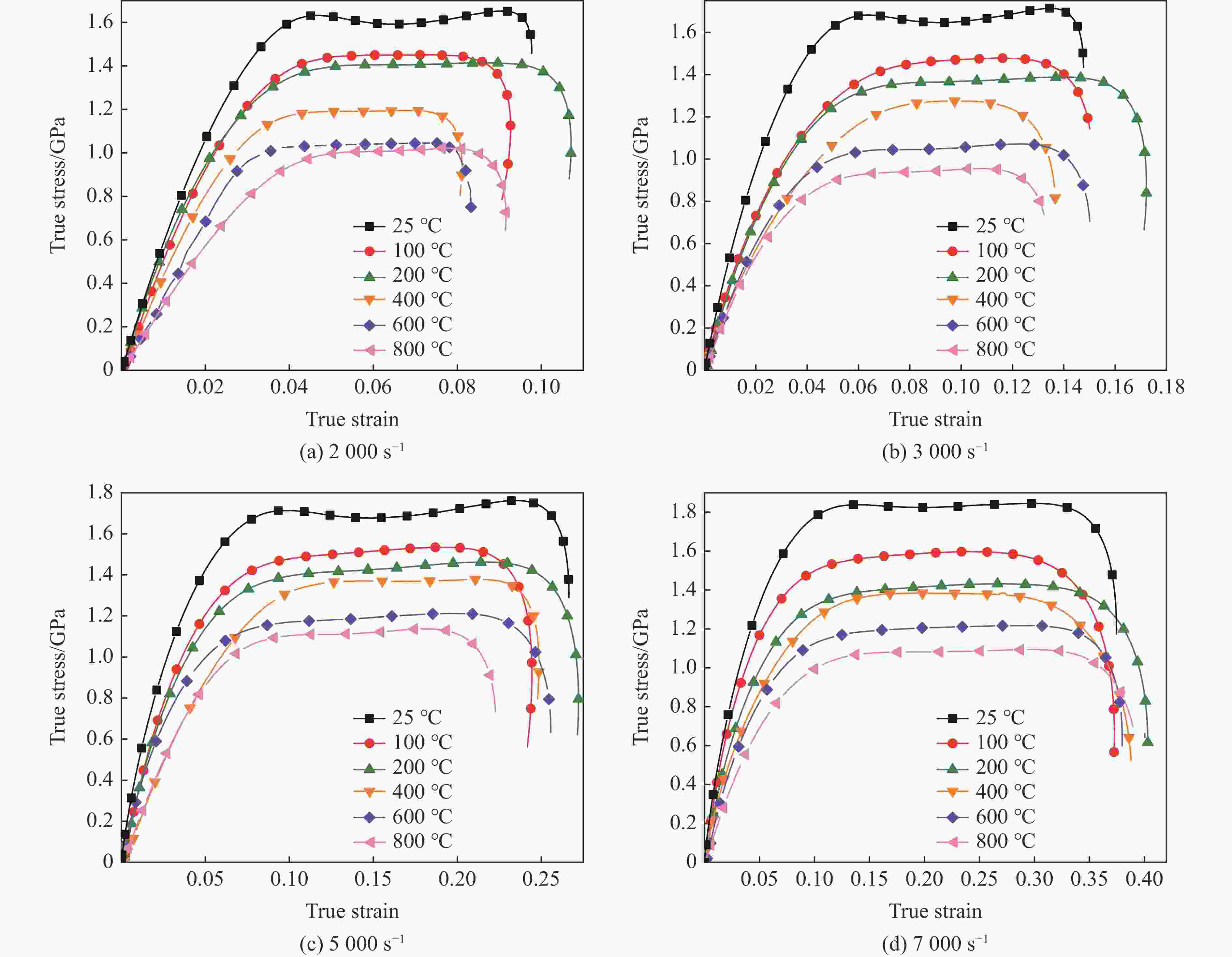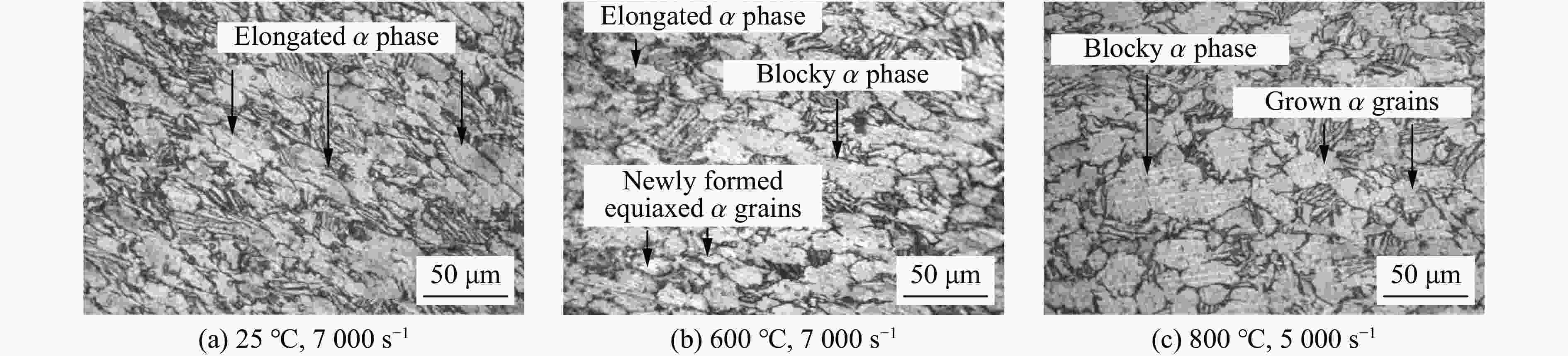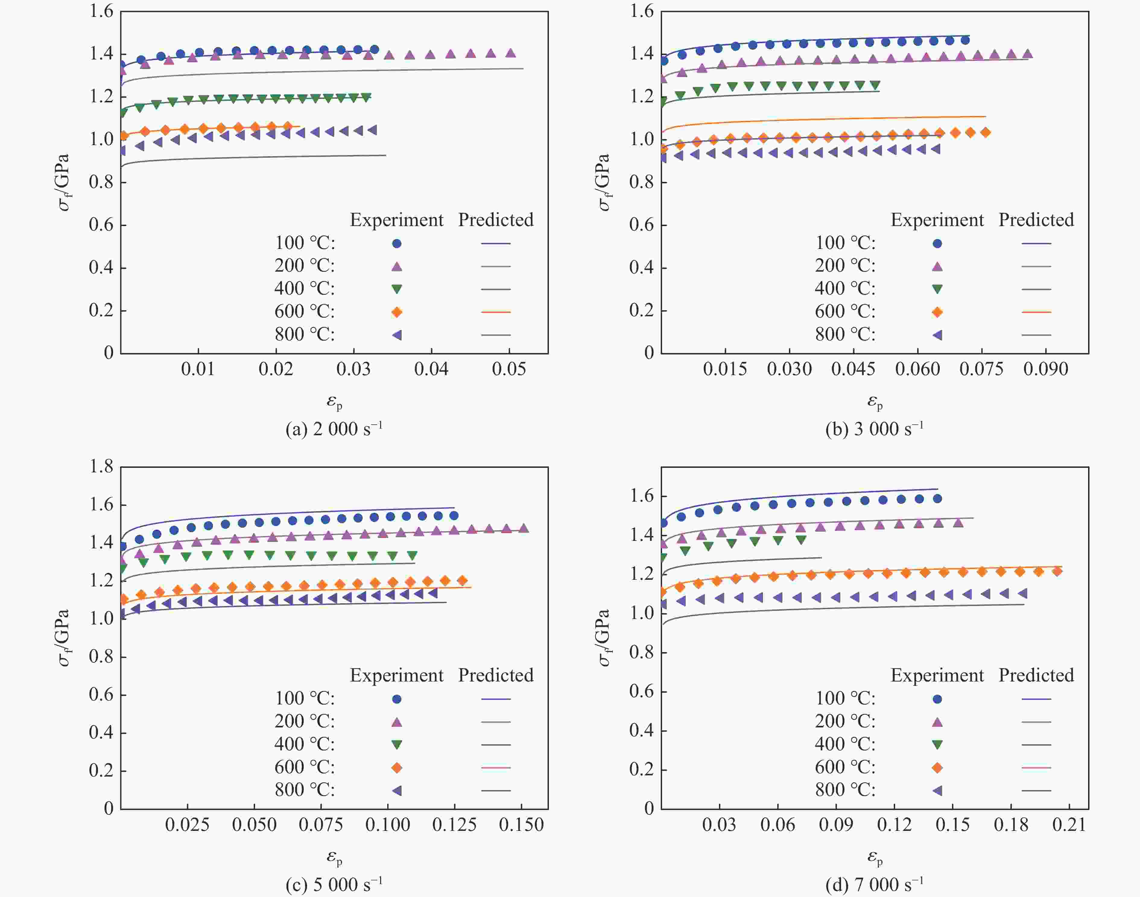 摘要: 采用分离式霍普金森压杆实验技术,研究了钛合金Ti6Al4V在温度为25~800 °C、应变速率为2000~7000 s−1的冲击压缩下的动态力学行为和微观组织演变,分析了其力学响应的温度依赖性和应变率敏感性,构建了可准确表征材料塑性流动行为的修正Johnson-Cook模型。结果表明,Ti6Al4V具有显著的应变硬化、应变率强化、应变率增塑和温度软化效应。随着加载温度和应变率的升高,材料的应变硬化效应减弱。温度敏感性随加载温度的升高而显著降低。应变率敏感性因子与加载温度呈负相关,随真实应变的增大呈下降趋势。高温高应变率下细小等轴α相、拉长型α相和块状α相取代初始等轴α相成为Ti6Al4V微观组织的典型特征。考虑率-温耦合作用和绝热温升影响的修正Johnson-Cook模型能够准确地预测Ti6Al4V的塑性流动应力-应变响应。Abstract: The dynamic mechanical behavior and microstructure evolution of titanium alloy Ti6Al4V under shock compression at temperatures ranging from 25 ℃ to 800 ℃ and strain rates from 2000 s−1 to 7000 s−1 were studied by using a split Hopkinson pressure bar. The temperature dependence and strain rate sensitivity of the material’s mechanical response were analyzed, and a modified Johnson-Cook model that could accurately characterize the plastic flow behavior of the material was developed. The results show that Ti6Al4V exhibited significant strain hardening, strain rate strengthening, strain rate plasticity, and temperature softening effects. With increasing loading temperature and strain rate, the material’s strain hardening effect is weakened. The temperature sensitivity is significantly decreased with increasing loading temperature. The strain rate sensitivity factor is negatively correlated with the loading temperature, and it shows a downward trend as the true strain increased. At high temperatures and high strain rates, fine equiaxial α phase, elongated α phase, and massive α phase replace the initial equiaxial α phase as the typical microstructure features of Ti6Al4V. The modified Johnson-Cook model that considers the effect of rate-temperature coupling and adiabatic temperature rise can accurately predict the plastic flow stress-strain response of Ti6Al4V.
