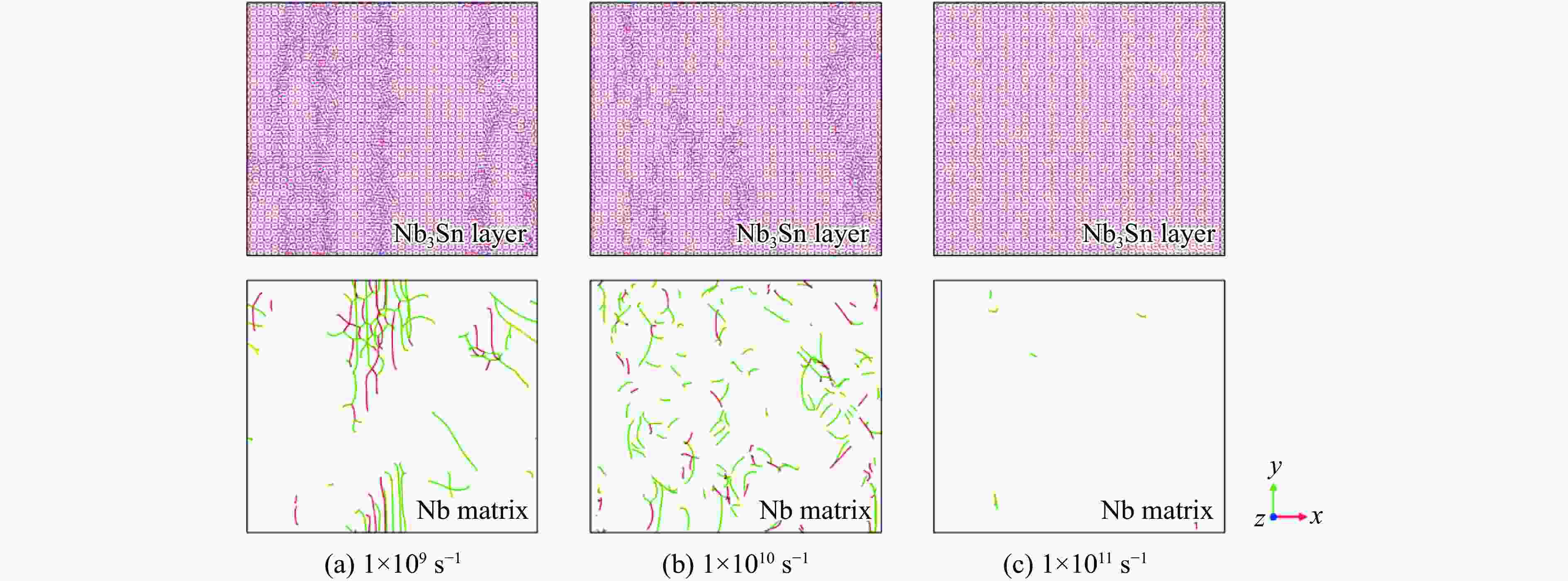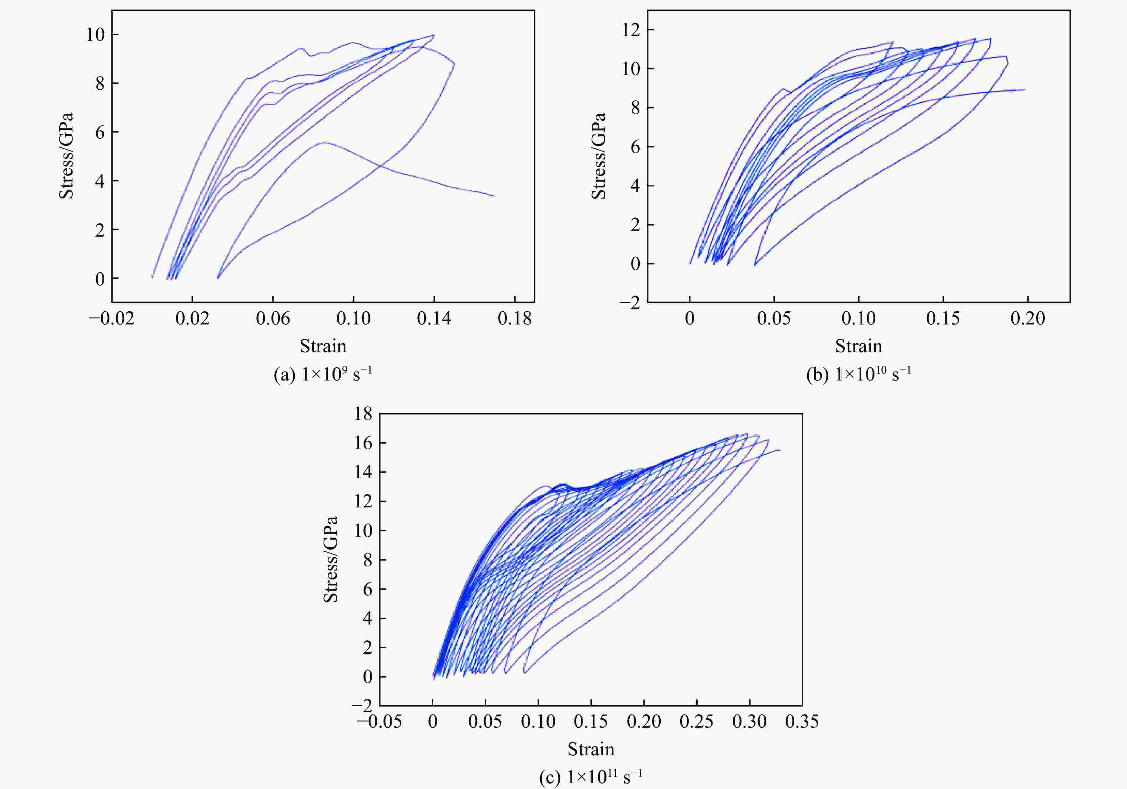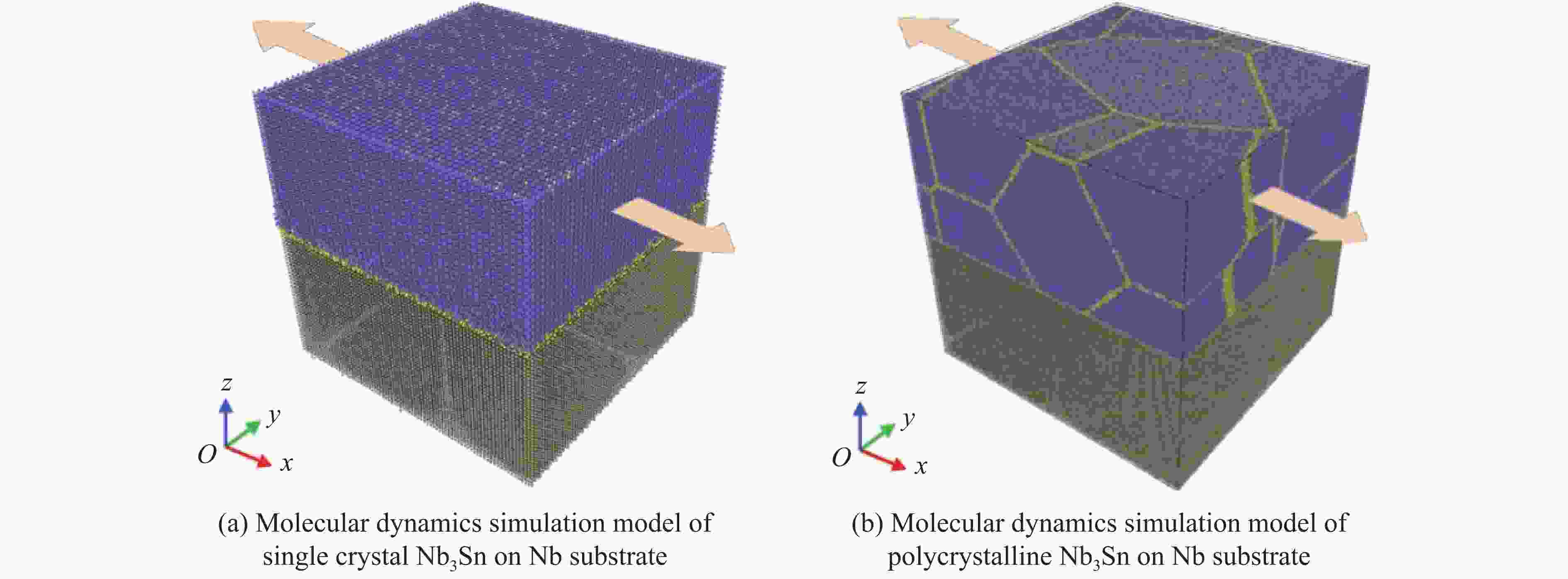 摘要: Nb3Sn超导体在循环载荷下的变形损伤行为研究对揭示超导体临界性能不可逆退化背后的力学机制具有重要意义。采用分子动力学模拟方法研究了极低温条件下单晶和多晶Nb3Sn/Nb复合材料在循环载荷下的变形损伤行为,同时分析了应变率对Nb3Sn/Nb复合材料变形损伤和断裂行为的影响。结果表明:单晶Nb3Sn/Nb复合材料在循环载荷作用后,Nb3Sn层出现滑移,当滑移带交错处的局部应力大于材料强度时,在滑移带交错处微裂纹萌生,致使复合材料中Nb3Sn层断裂失效;而多晶Nb3Sn/Nb复合材料则由于晶界处应力在循环载荷下得不到松弛,当应力峰值超过晶界强度时,在晶界处萌生微裂纹,导致复合材料中Nb3Sn层发生沿晶断裂。Nb3Sn/Nb复合材料在不同应变率下表现出不同的断裂方式。随着应变率的增加,单晶Nb3Sn层中的滑移带数量增加,导致单晶Nb3Sn/Nb复合材料的韧性增强。而多晶Nb3Sn/Nb复合材料中,晶界对材料强度的影响随着应变率的增加而降低,高应变率下,复合材料在Nb3Sn层局部断裂后具有较大的剩余强度。研究结果将有助于理解Nb3Sn/Nb复合材料在循环载荷下的损伤演化过程,为材料的性能优化设计提供一定的理论指导。