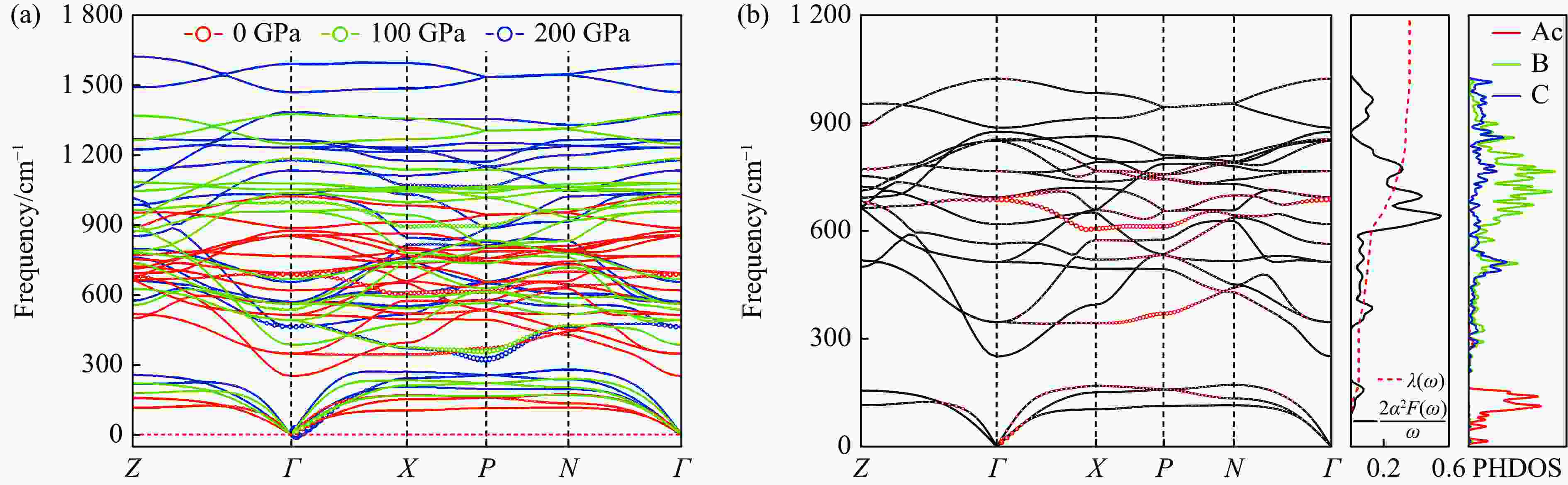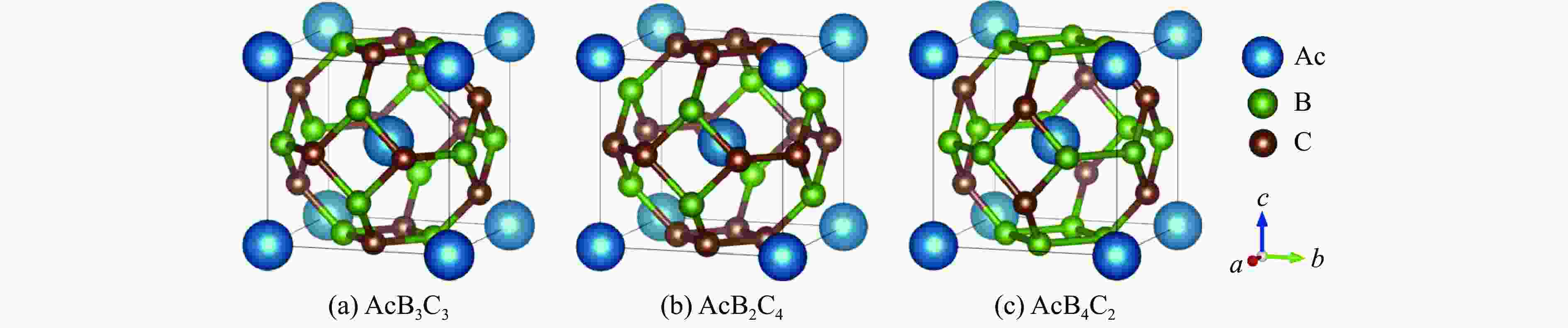 摘要: Ac元素作为锕系第一号元素,AcH10的超导转变温度(Tc)达到251 K,是潜在的室温超导体。XB3C3(X表示不同的金属掺杂元素)是新发现的sp3笼型化合物,同时具有强共价特性和超导特性,是潜在的高温超导材料。采用第一性原理密度泛函理论,探索以XB3C3、XB2C4和XB4C2笼型结构为原型、引入Ac元素掺杂的AcB3C3、AcB2C4和AcB4C2的晶体结构、晶格动力学、电子性质和超导特性。研究发现:AcB2C4在0~200 GPa区间内难以合成;常压下AcB3C3表现为间接带隙半导体,带隙宽度约为1.154 eV。根据力学稳定性判据可知,AcB3C3和AcB4C2是弹性稳定的具有较高硬度和刚度的脆性材料。同时,常压下AcB4C2表现出超导特性,超导转变温度达到1.565 K。随着压强的增加,超导转变温度呈现先降低后升高的变化趋势,其超导机制由中频声子主导转变为低频与中频声子的共同作用。研究结果可为实验合成笼型化合物超导材料提供理论指导,为探索具有高超导转变温度的超导材料提供新思路。Abstract: Recently, a large number of theoretical and experimental studies have reported the emergence of a new sp3 clathrate XB3C3, where X represents different metal doping elements. The potential high-temperature superconducting materials have been discovered. New-typical cage material with both strong covalent and superconducting properties has important scientific research significance. In recent years, Ac discovered as the first element of the actinide series, AcH10 has a superconducting transition temperature (Tc) of 251 K, making it a potential room temperature superconductor. Therefore, in this article, first principles density functional theory is used to explore the crystal structure, lattice dynamics, electronic properties, and superconducting properties of AcB3C3, AcB2C4, and AcB4C2 doped with Ac elements based on the cage structures of XB3C3, XB2C4, and XB4C2. Research has found that AcB2C4 is difficult to synthesize within the 0–200 GPa range, and AcB3C3 exhibits an indirect bandgap semiconductor with a bandgap width of approximately 1.154 eV at atmospheric pressure. Based on the mechanical stability criterion, it can be inferred that AcB3C3 and AcB4C2 are brittle materials with high hardness and stiffness that are elastically stable. At the same time, AcB4C2 exhibits superconducting properties at ambient pressure, with Tc reaching 1.565 K. It has been observed that as pressure increases, the Tc value exhibits a trend of initially decreasing and then increasing. The superconducting mechanism is mainly influenced by intermediate-frequencies phonons, which then shift to the combination of low-frequencies and intermediate-frequencies phonons. This study provides guidance for the experimental synthesis of cage type compound superconducting materials and provides new ideas for exploring superconducting materials with high superconducting transition temperature.