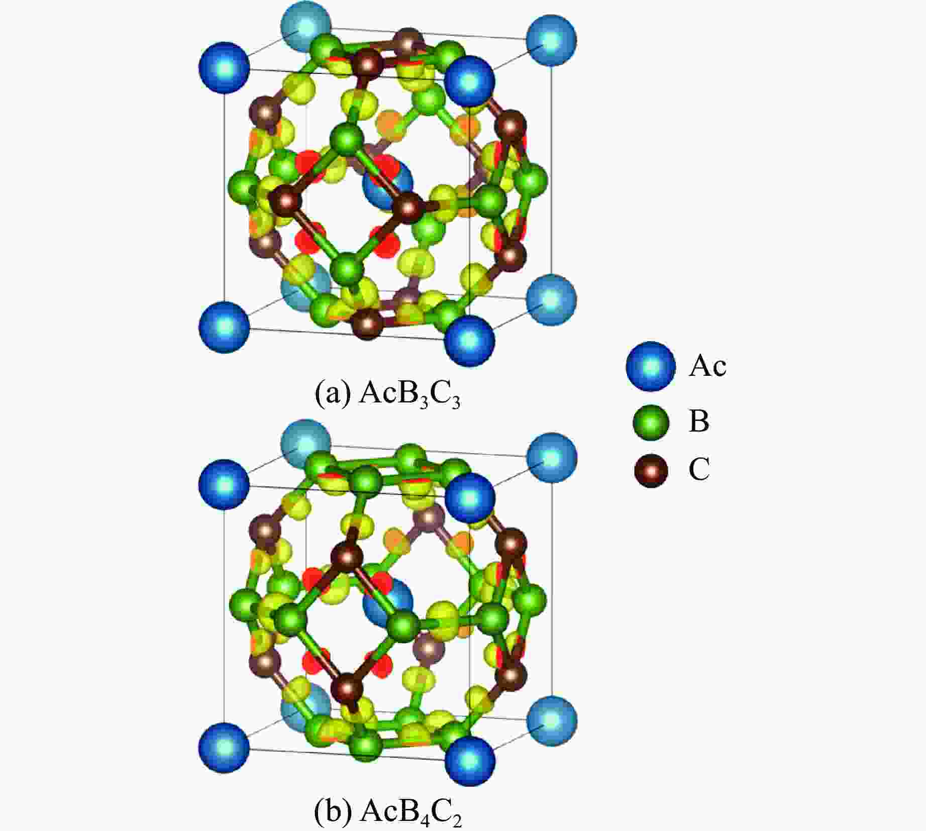 System C11/GPa C12/GPa C13/GPa C16/GPa C33/GPa C44/GPa $Pm \overline{3} n $-AcB3C3 859.97 185.78 327.12 I4/mmm-AcB4C2 715.43 241.16 114.38 0 814.58 274.96 System C66/GPa B/GPa G/GPa E/GPa ν B/G $Pm \overline{3} n $-AcB3C3 410.51 331.11 782.85 0.18 1.24 I4/mmm-AcB4C2 303.83 353.92 289.12 681.72 0.18 1.22 表 2 不同压强下AcB4C2的物性参数