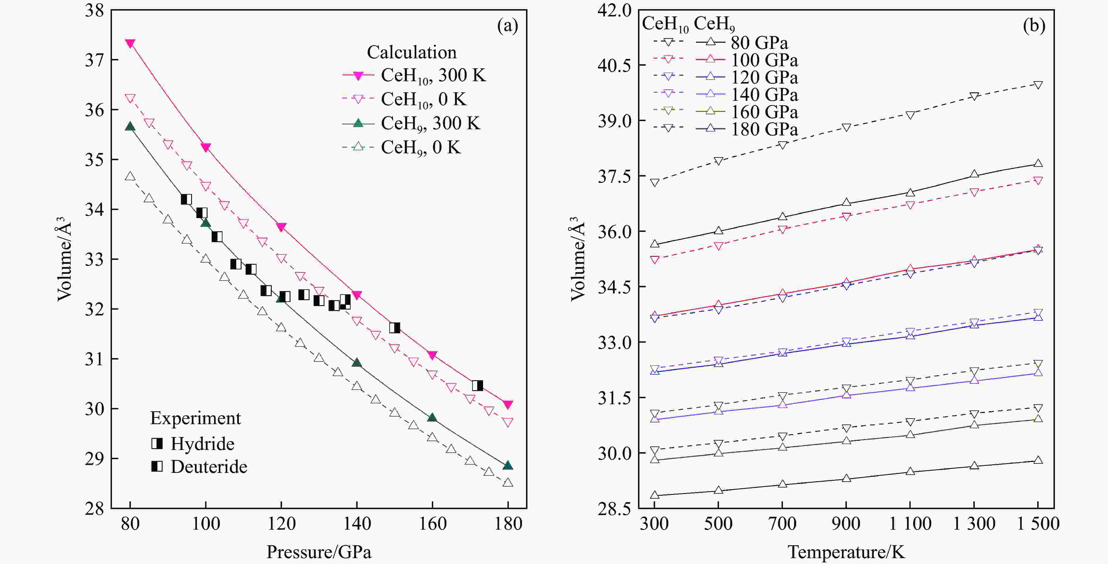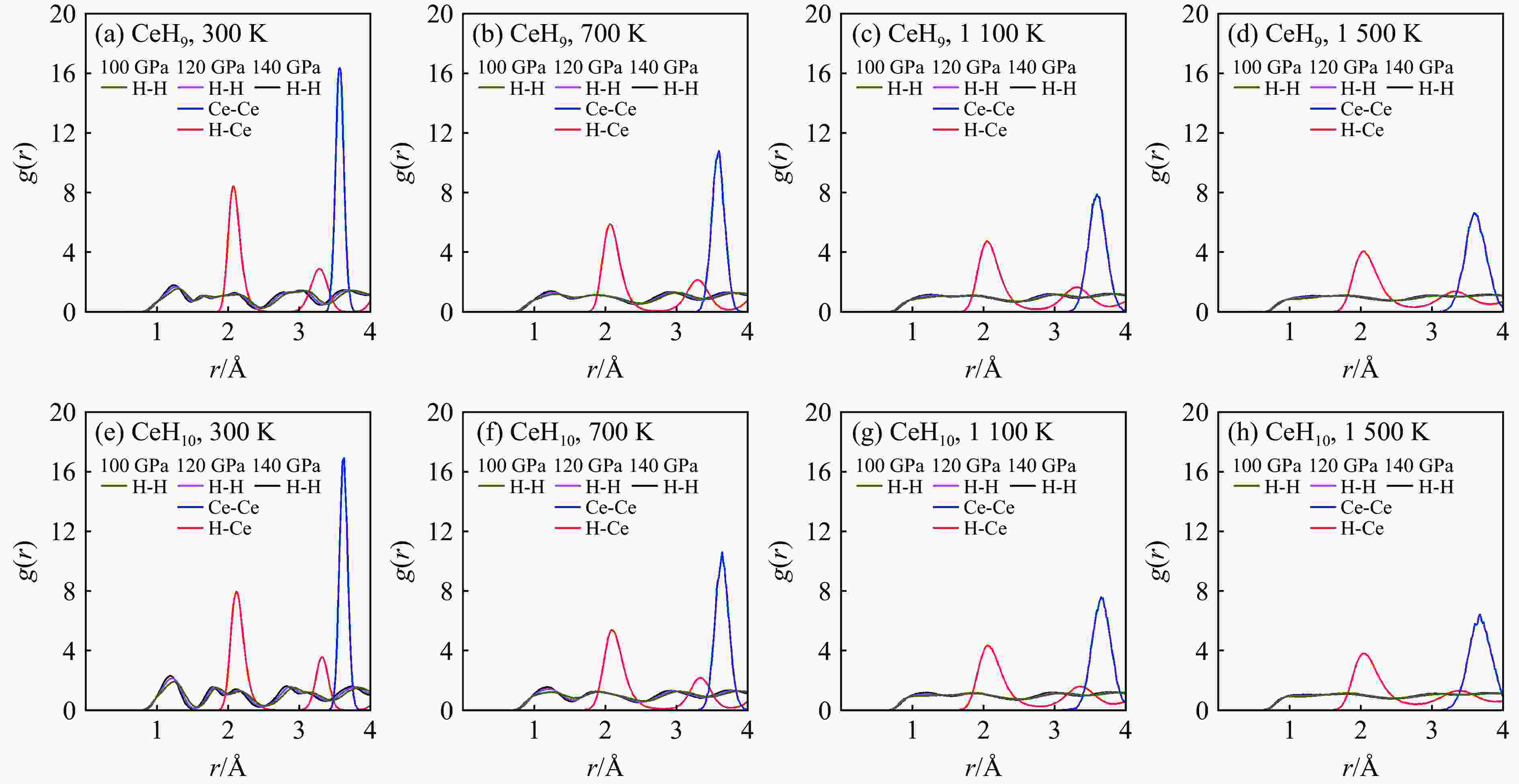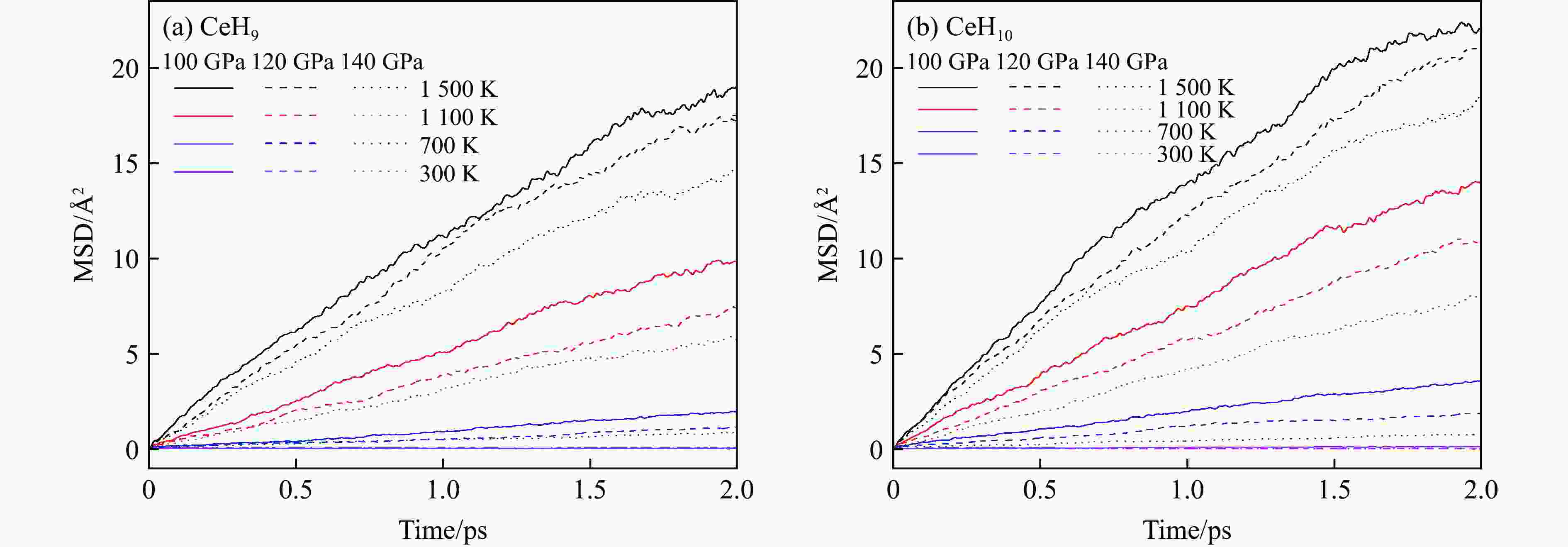 摘要: 高压下的稀土金属超氢化物因具有高温超导电性而受到广泛关注。由于实验只能部分地确定超氢化物中稀土金属原子的晶格结构,因此,第一性原理计算成为全面理解其结构与物性的重要方法。基于第一性原理计算,对氢含量不同但Ce晶格结构相同的面心立方CeH9和CeH10的弹性、晶格动力学、质子动力学性质进行了对比研究,发现低氢含量有利于面心立方超氢化铈的弹性和声子稳定向低压拓展。在100~140 GPa压强区间,室温下CeH9和CeH10不具有显著的质子扩散,但1500 K时全面转变为超离子态,扩散系数分别为1.6×10−4~1.2×10−4 cm2/s和1.9×10−4~1.5×10−4 cm2/s;扩散系数与温度、氢含量正相关,但与压强负相关。所获得的压强、温度及氢含量对超氢化铈结构与动力学性质的影响规律可为其他超氢化物研究提供参考。Abstract: Rare-earth metal superhydrides have attracted much attention because of their high-temperature superconductivity. Since experimental measurements can only determine the structures of rare-earth metal atoms in the superhydrides, first-principles calculations have become an important complementary method for a comprehensive understanding on their structures and physical properties. In this work, the elasticity, lattice dynamics and proton dynamics properties of face-centered cubic CeH9 and CeH10 with different hydrogen contents but the same Ce lattice structure are investigated comparatively by first-principles calculations. The low hydrogen content is found to favor the elastic and phonon stabilization of face-centered cubic cerium superhydrides expanding to low pressures. At 100–140 GPa, CeH9 and CeH10 do not have significant proton diffusion at room temperature, but fully transform into the superionic state at 1500 K with diffusion coefficients of 1.6×10−4−1.2×10−4 cm2/s and 1.9×10−4−1.5×10−4 cm2/s; the diffusion coefficient is positively correlated with temperature and hydrogen content, but negatively correlated with pressure. The findings on the laws of pressure, temperature and hydrogen content affecting the structure and dynamics of cerium superhydrides are obtained, which can be used as a reference for the study of other superhydrides.