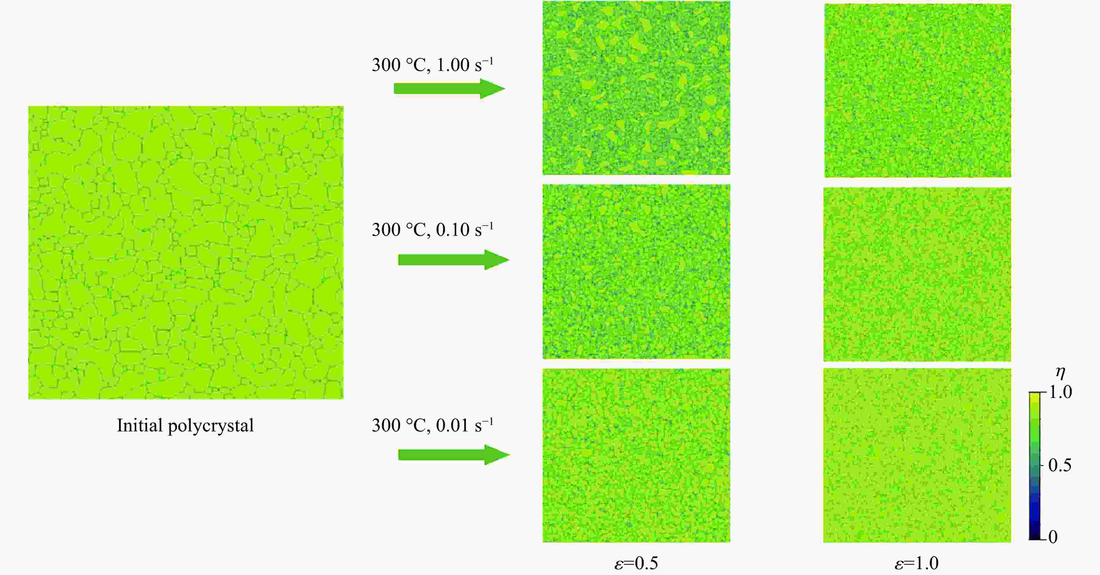Figure  3.  Microstructure (η) evolution of AZ31B magnesium alloy polycrystal under dynamic loading at a temperature of 300 °C and different strain rates