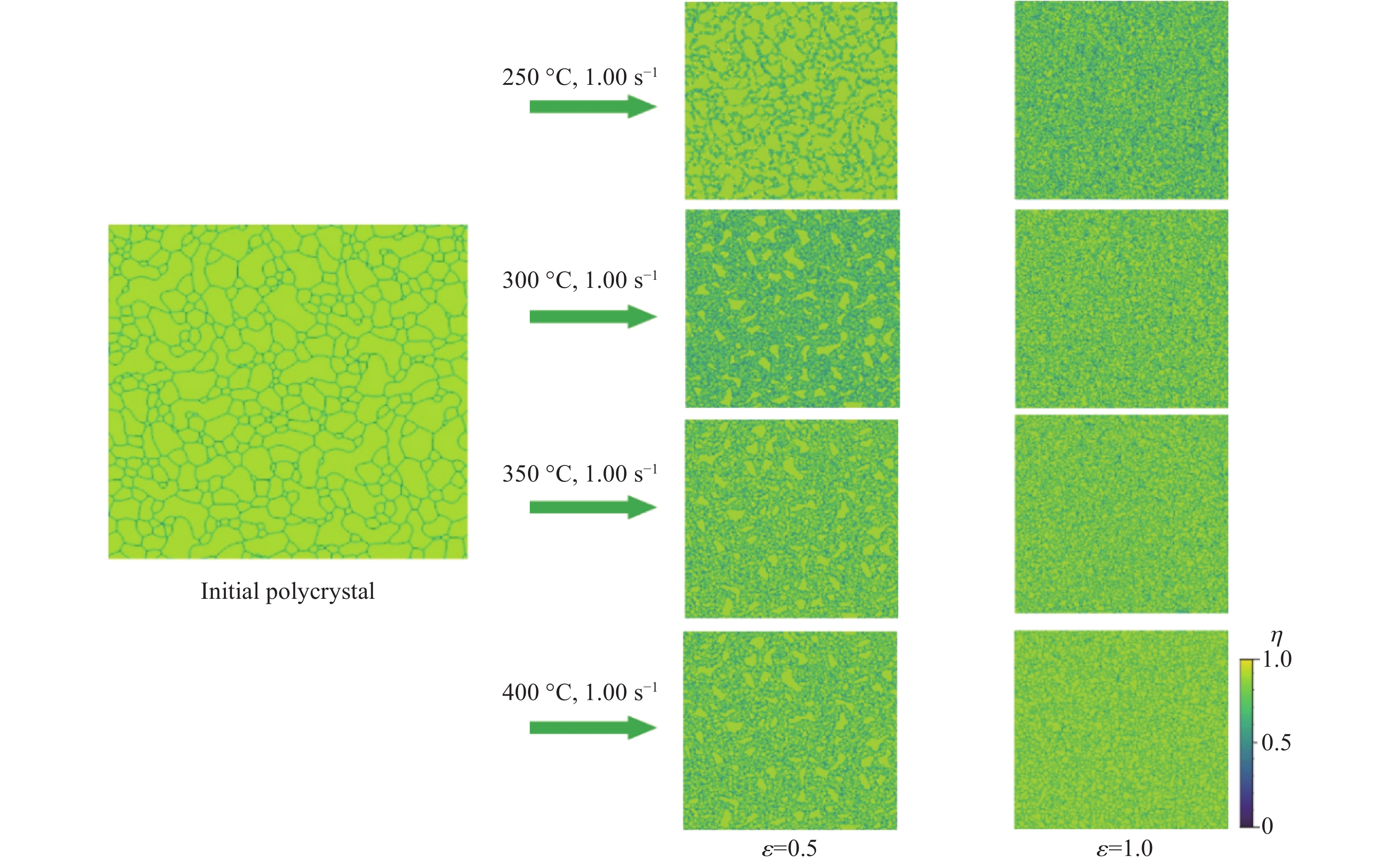 图  AZ31B镁合金多晶在应变率为1.00 s−1、不同温度动态加载下的微观组织(序参量η)演化