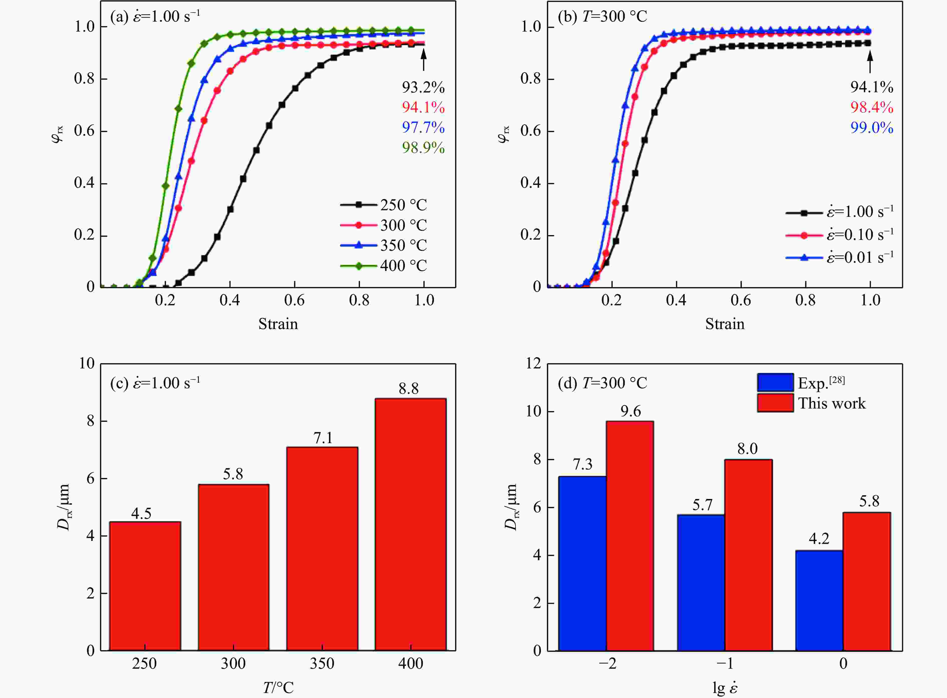 图  动态再结晶体积分数与(a)温度和(b)应变率的关系以及再结晶平均晶粒尺寸随应变的演化与(c)温度和(d)应变率的关系