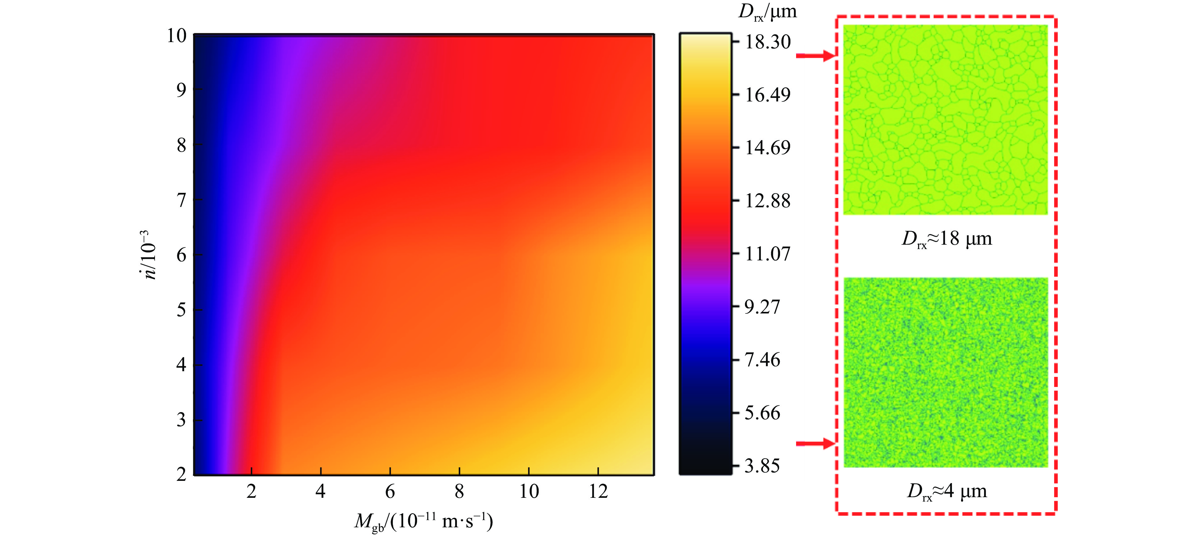 Figure  6.  Phase diagram of the average grain size of dynamic recrystallization with respect to the nucleation rate ($ \dot{n} $) versus the grain boundary migration rate Mgb, where real values are used for both the nucleation rate and the grain boundary migration rate