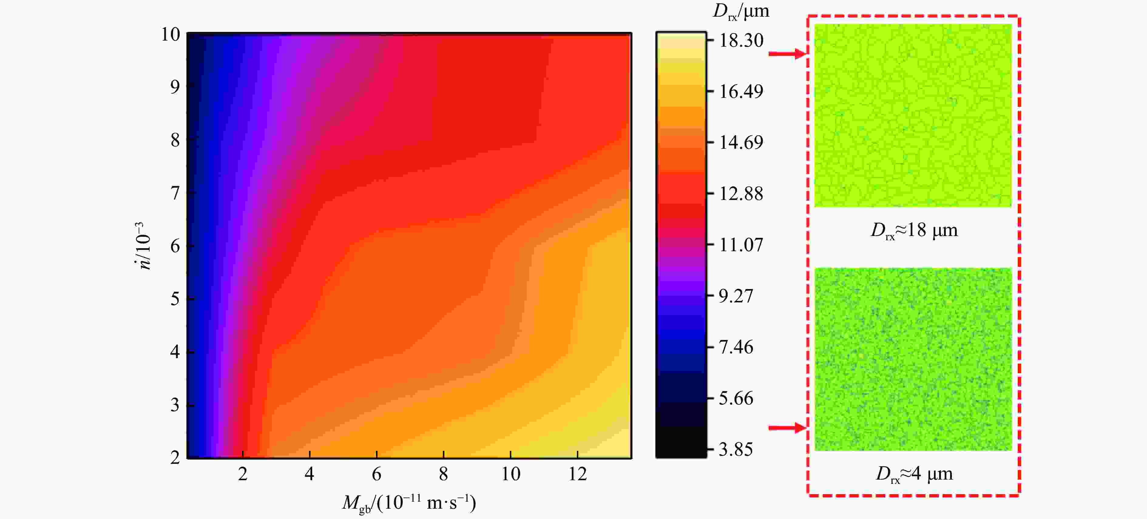 图  动态再结晶关于形核率$ \dot{n} $与晶界迁移速率Mgb的平均晶粒尺寸相图(形核速率和晶界迁移速率均采用真实数值)