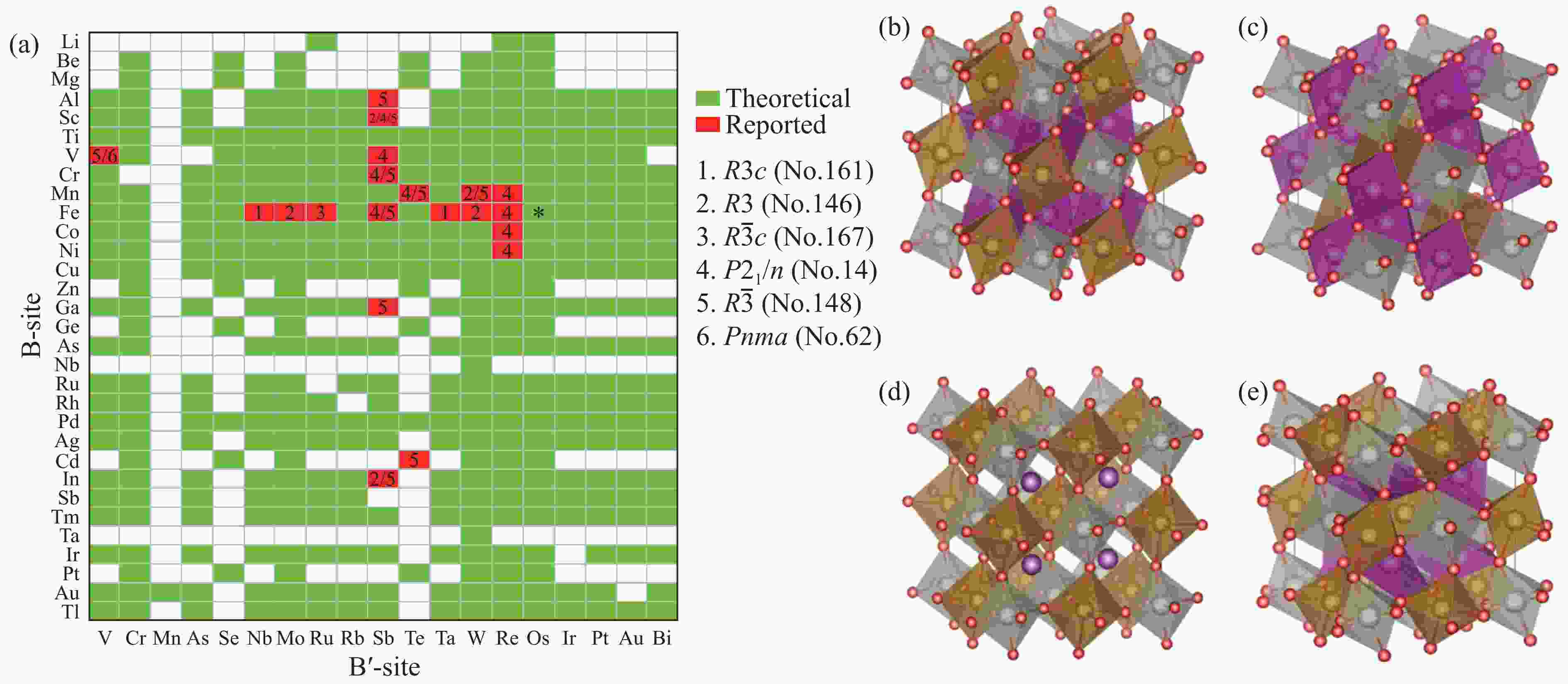 Figure 1. (a) Possible combinations of Mn2BB′O6 in the chemical space of B and B′ cations under charge balance (The possible, reported, and inexistent compounds are displayed in green, red, and blank, respectively. The numbers marked for the 20 known compounds denote the space group types listed on the right side.); (b)–(e) the crystal structures of some of the known compounds, including Mg3TeO6-type (R