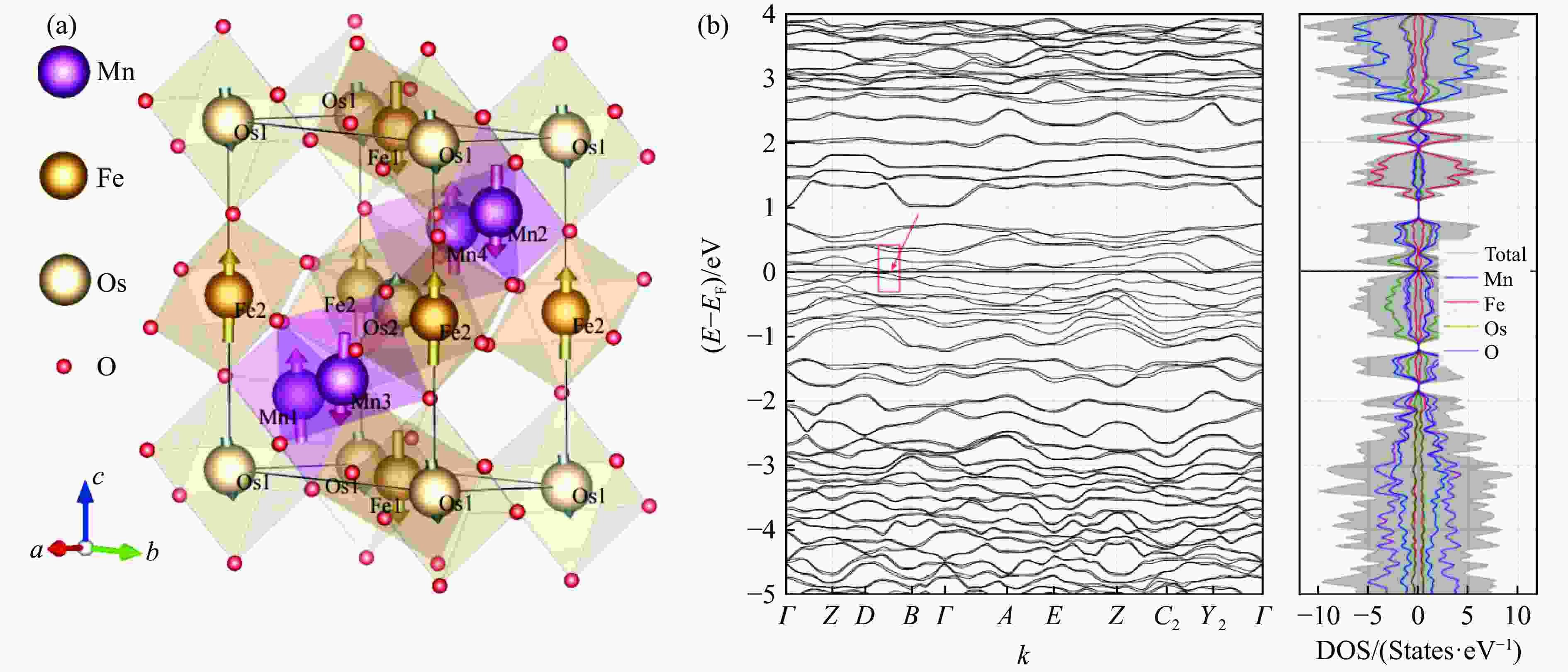 $ \overline{3} $ )[36–37], Ni3TeO6-type (R3)[38–39], β-Li3VF6-type (C2/c)[40–42], and GdFeO3-type (P21/n)[43–44](To ensure that our calculations are compatible with different magnetic configurations and atomic distortions, we have useda 40-atom super-cell, which can be considered as a (2, 2, 2) multiple of the ideal single perovskite structure alongthe three axes of Cartesian coordinates[50–51]. (b)–(e) also show the examples of collinear magnetic structure thatwe considered structure optimization with (b) FM, (c) Type Ⅰ AFM, (d) Type Ⅱ AFM and (e) Type Ⅲ AFM.)Figure 3. DFT results of Mn2FeOsO6 in consideration of SOC, DFT+U (UFe = 4.6 eV, UMn = 4 eV, UOs = 2.0 eV) and non-collinear magnetism: (a) the predicted atomic and magnetic structures, with a distorted GdFeO3-type monoclinic structure (P21/n) as for Mn2FeReO6[16, 29–30] (The arrow on each atom represents the spin orientation and the size of spin value. Every spin is almostlaying at <001> direction, forming a relatively ideal AFM configuration.); (b) energy band structure near Fermi level andspin-resolved density of states (DOS) (Mn2FeOsO6 has no bandgap, forming as conductor. There is a suspectedformation of Dirac points between wavevectors B-D, marked by red rectangle and arrow. The DOS of spin-upand spin-down are basically the same, verifying the AFM configuration of Mn2FeOsO6.)