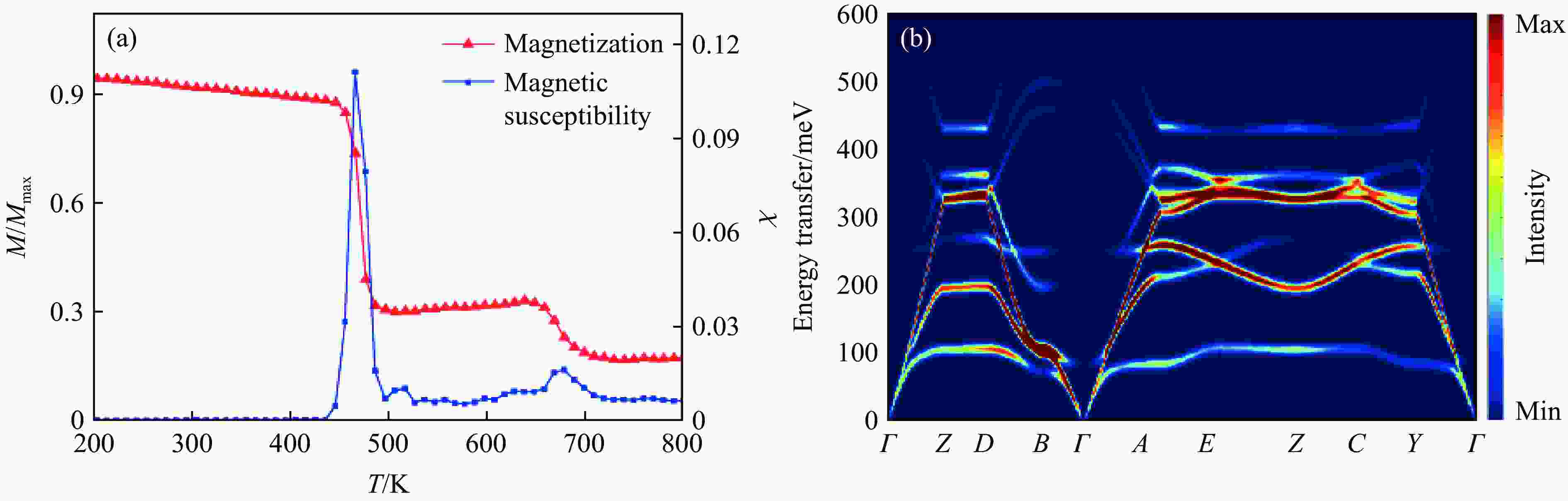 Figure 4. Magnetism of Mn2FeOsO6: (a) calculated magnetization and magnetic susceptibility via classical Monte Carlo simulation (The red line represents the theoretical total magnetic moment M divided by saturation magnetic moment Mmax, while the blue line represents the relative magnetic susceptibility χ, both indicating the phase transition positions around temparature T about 480 K.); (b) simulated excitation spectrum using SpinW package (The vertical axis represents the energy of the excitation spectrum,and the colors correspond to the intensity of the excitation spectrum.)