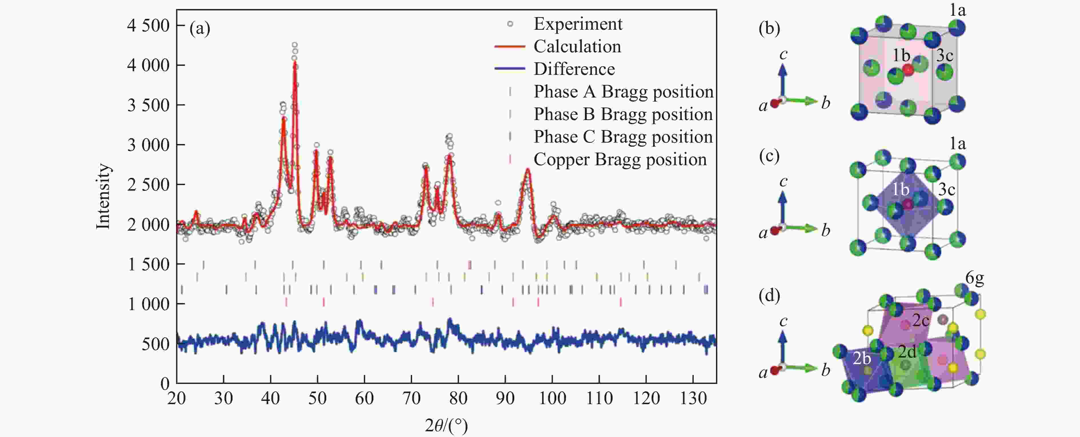 图  (a) 铁镍氮化合物的中子衍射精修图谱以及(b) γ-FeNi3相、(c) γ-Fe4N相、(d) ɛ-Fe3N相3种铁镍氮化合物的晶体结构[35]
