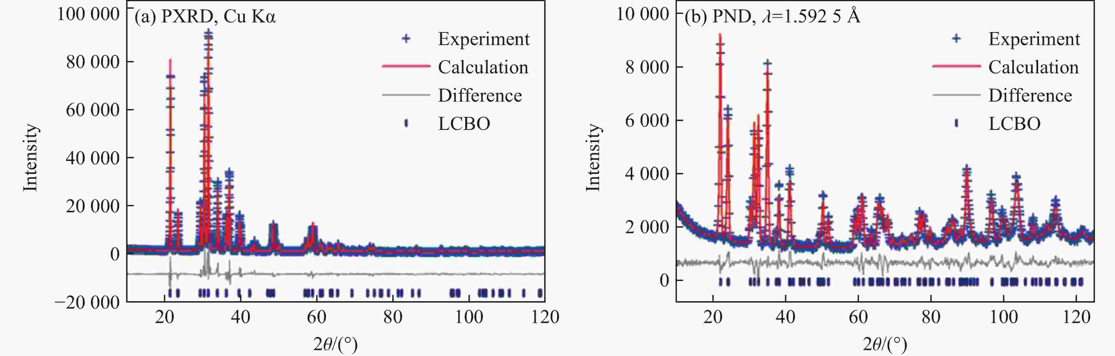 Figure  3.  Refined powder X-ray diffraction (PXRD) (a) and PND (b) profiles of the polycrystalline samples of Li2.1C0.9B0.1O3[37]