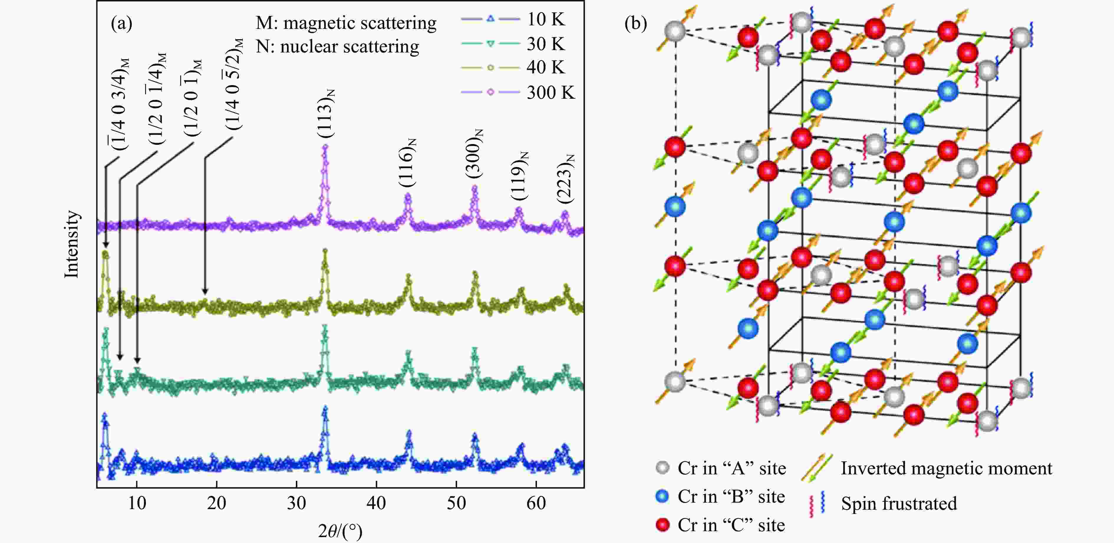 图  Cr2Se3的低温中子衍射谱 (a) 及得到的磁结构 (b) (虚线和实线分别对应晶体结构和磁结构单元)[39]