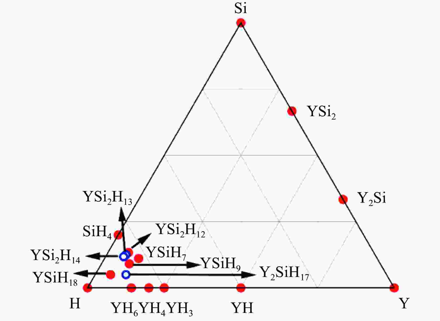 Figure  1.  Thermodynamic convex hull diagram of Y-Si-H system under pressure of 150 GPa (The red solid points are represented as thermodynamically stable structures on the convex hull, and the blue hollow points are represented as metastable structures deviating from the convex hull within 15 meV/atom.)