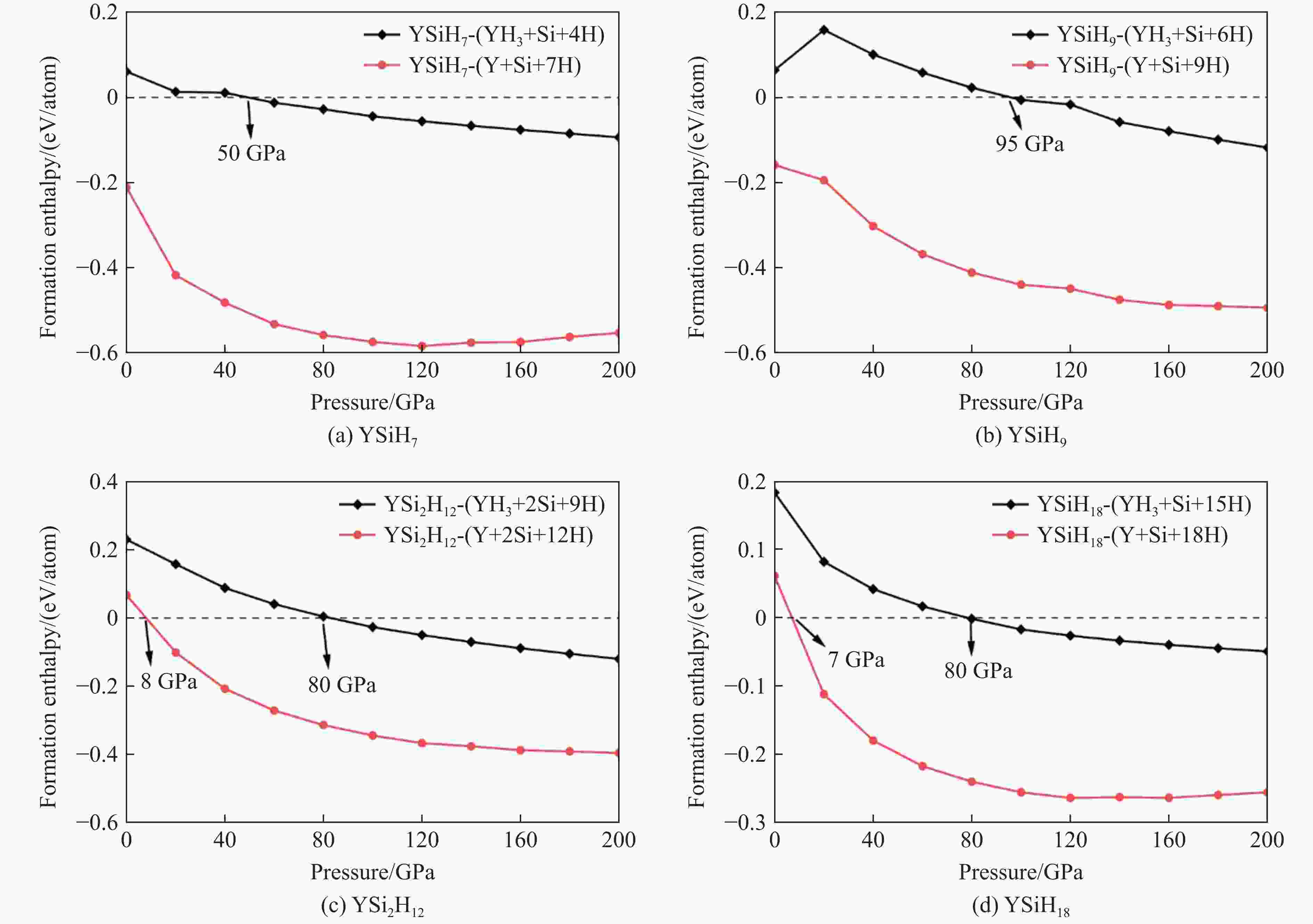 图  计算的YSiH7、YSiH9、YSi2H12和YSiH18形成焓随压力的变化关系
