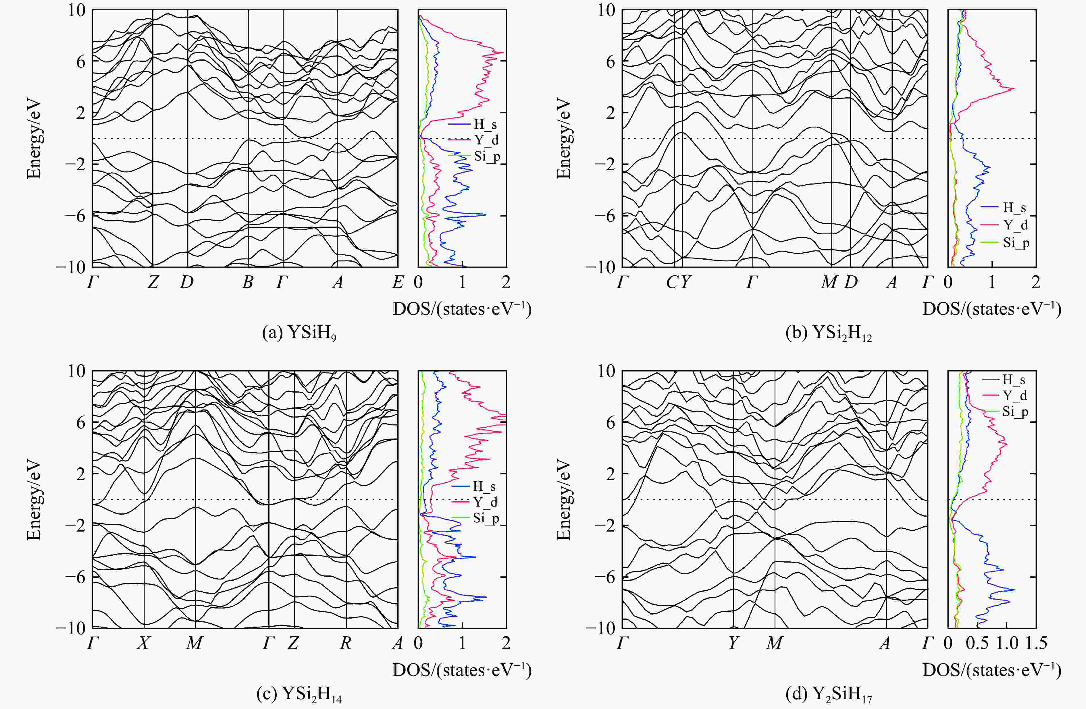 图  YSiH9、YSi2H12、YSi2H14、Y2SiH17在150 GPa压力下的能带结构和分波态密度