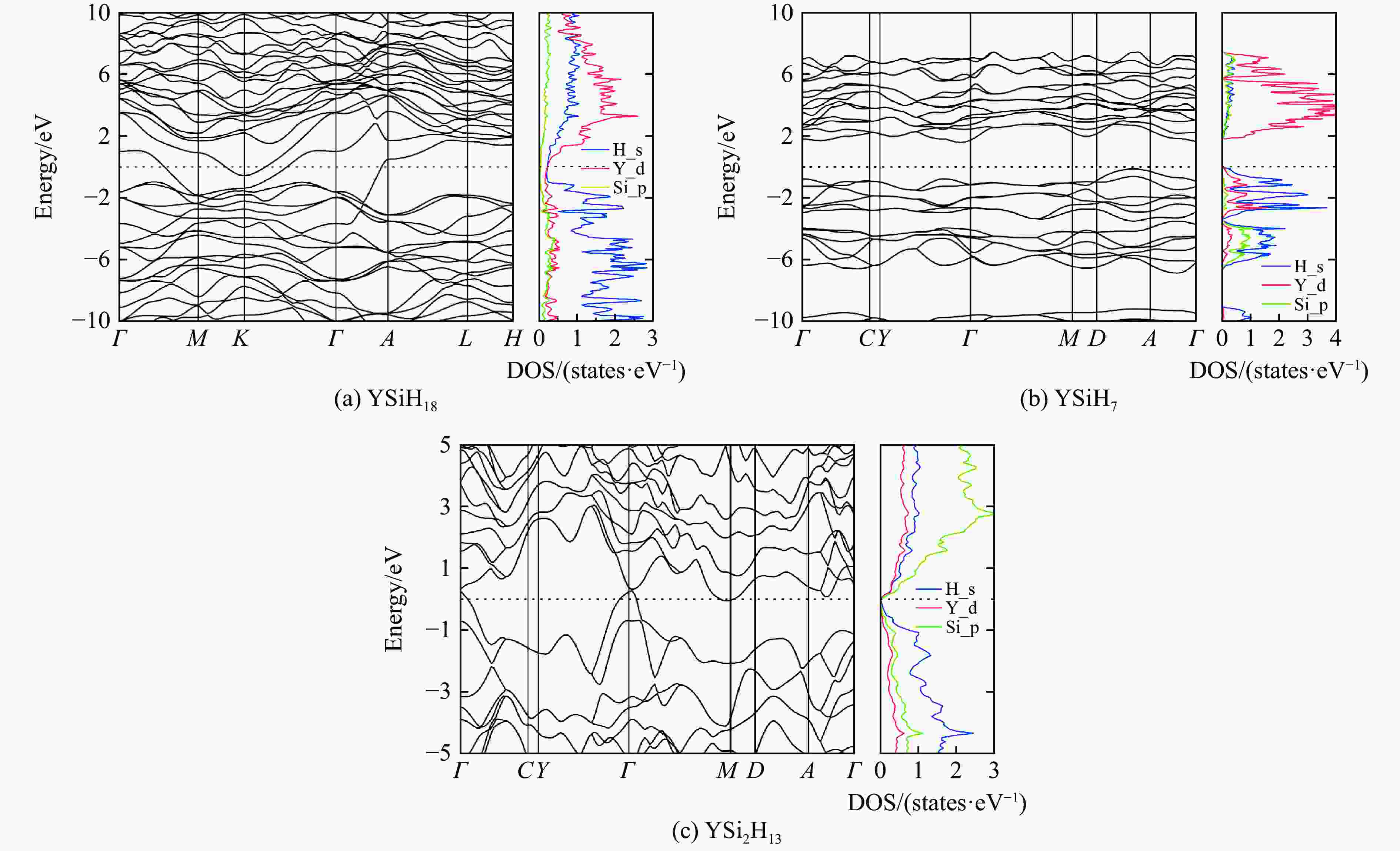 Figure  6.  Band structure and discrete electron state density of YSiH18, YSiH7, YSi2H13 under pressure of 150 GPa