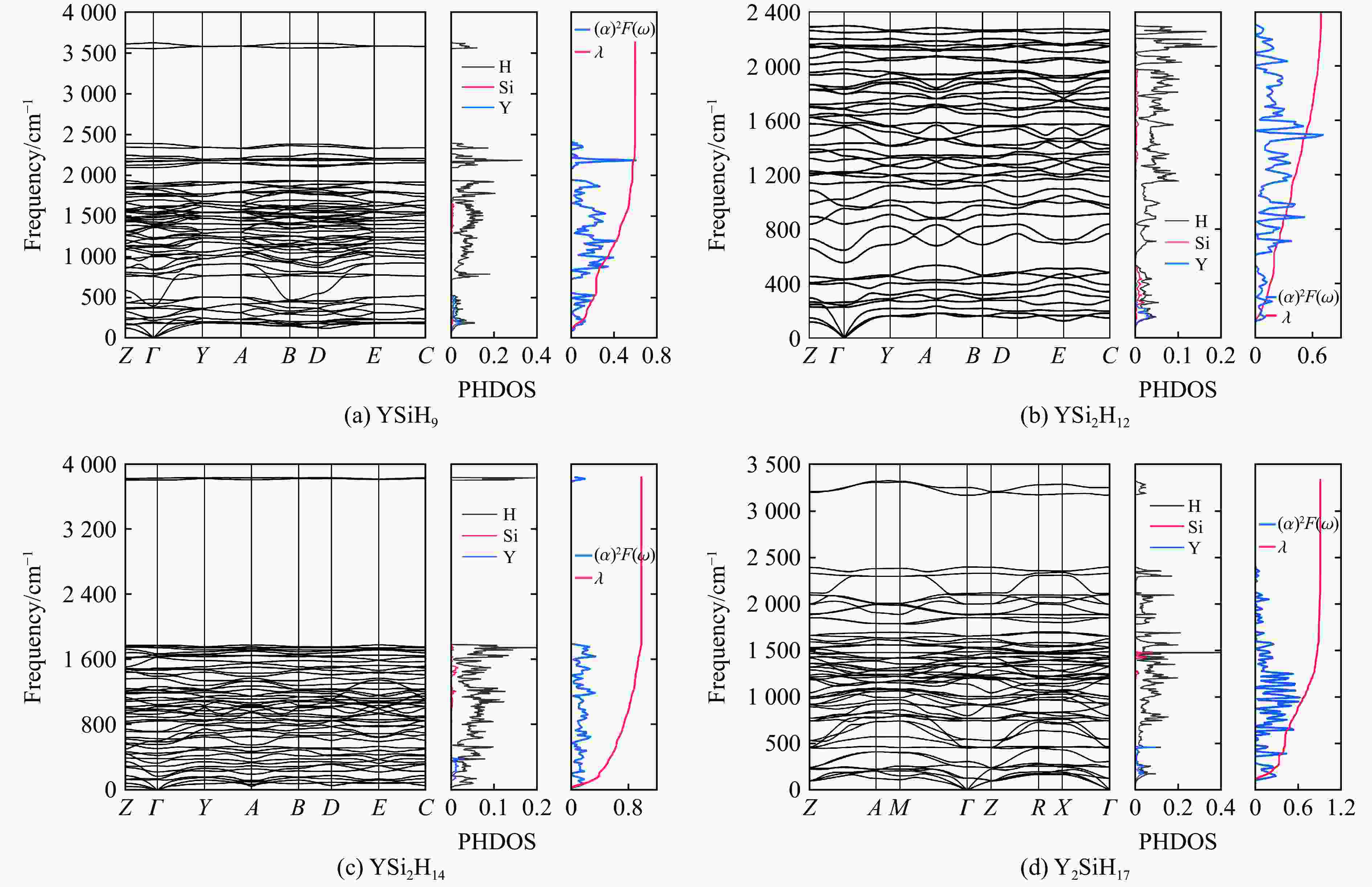 Figure  7.  Phonon spectra, phonon state density, spectral function $ {\alpha }^{2}F(\omega) $, electroacoustic coupling and $ \lambda $ at 150, 150, 40 and 100 GPa of (a) YSiH9, (b) YSi2H12, (c) YSi2H14, (d) Y2SiH17, respectively