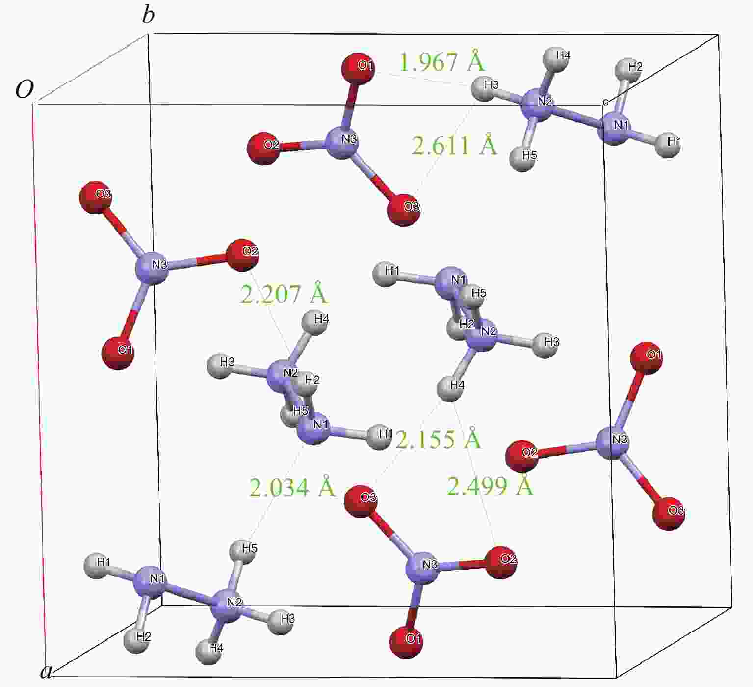 • 图  α相HN晶胞结构[8](灰色球为氢原子,红色球为氧原子,蓝色球为氮原子,绿色虚线表示分子间氢键)