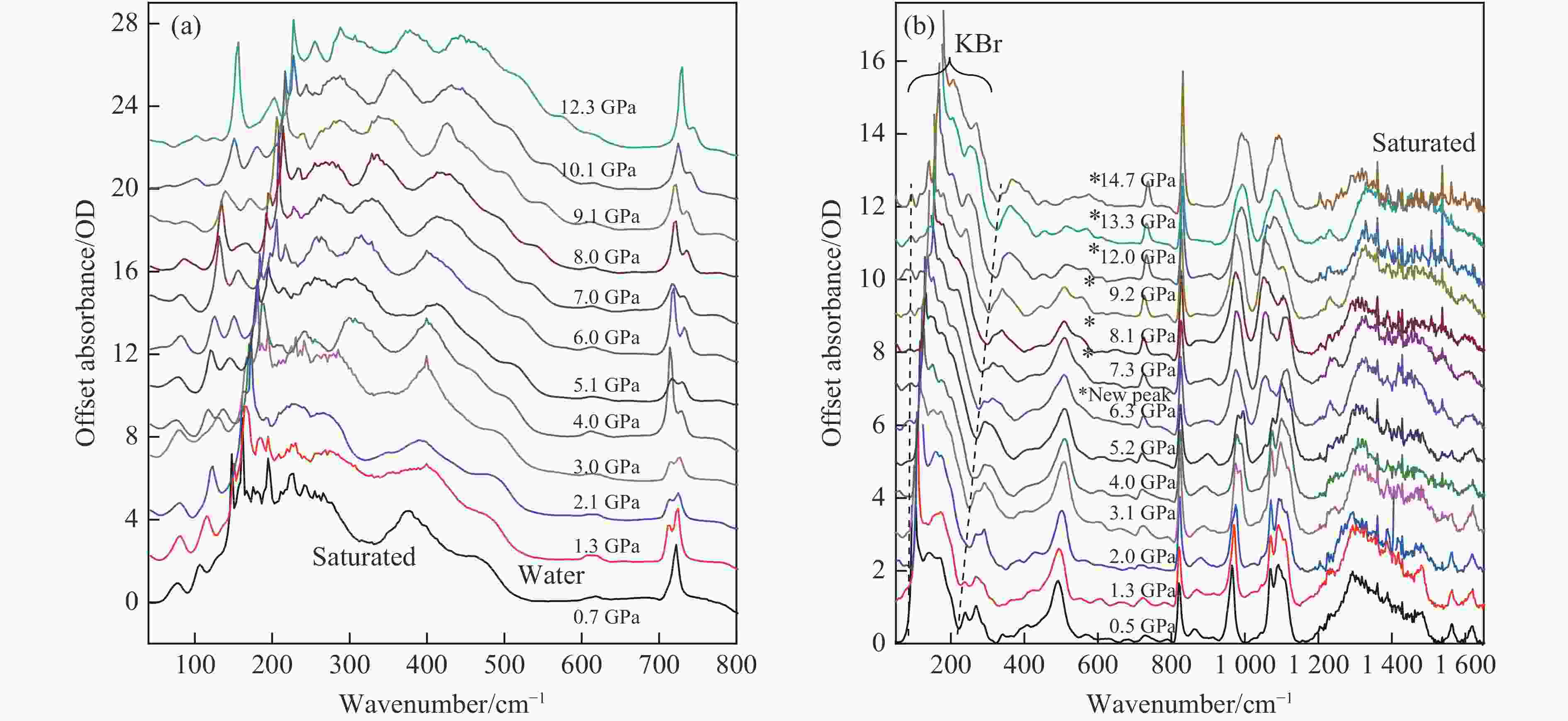 图  HN的高压红外吸收光谱:(a) 纯HN的远红外谱,(b) HN与KBr混合的中红外谱