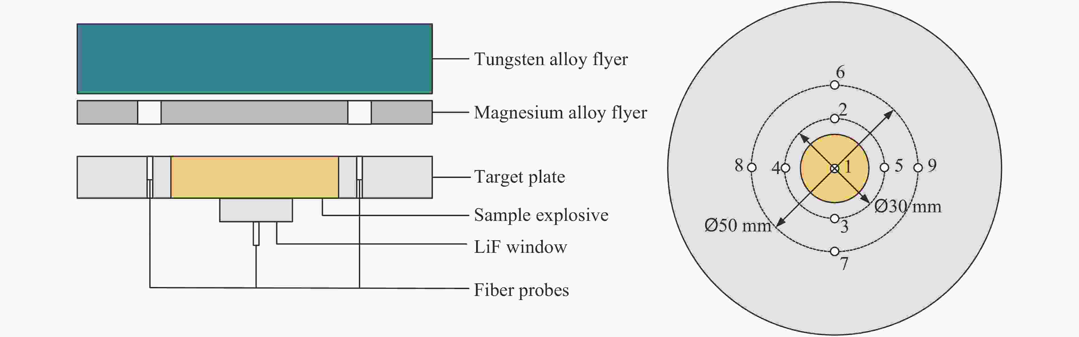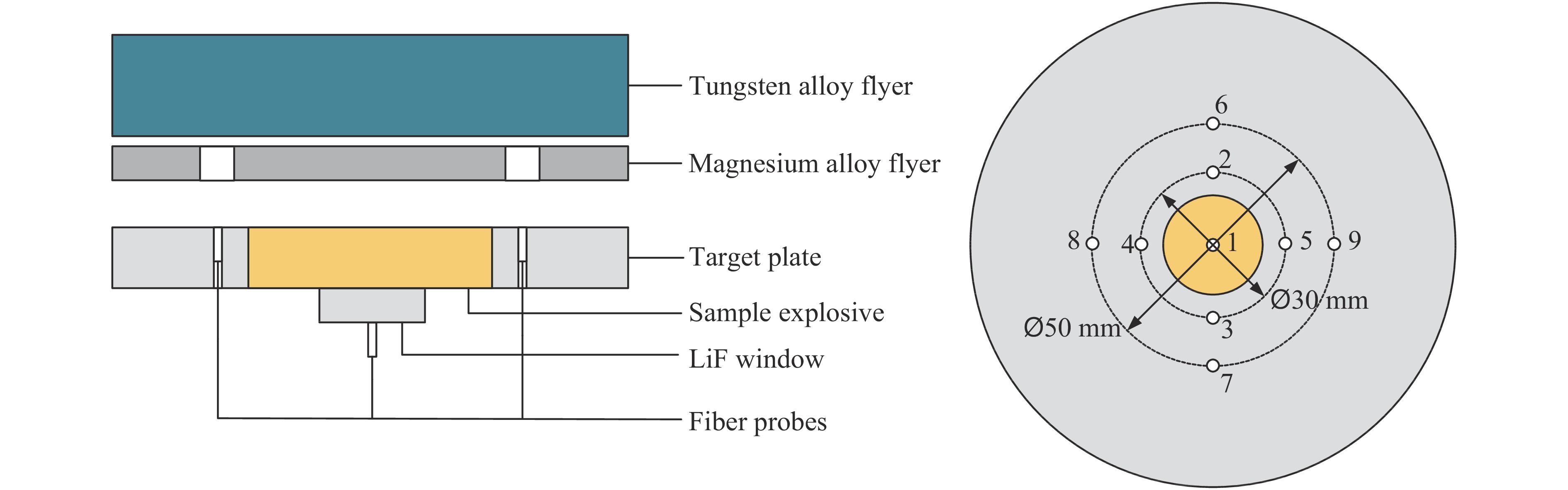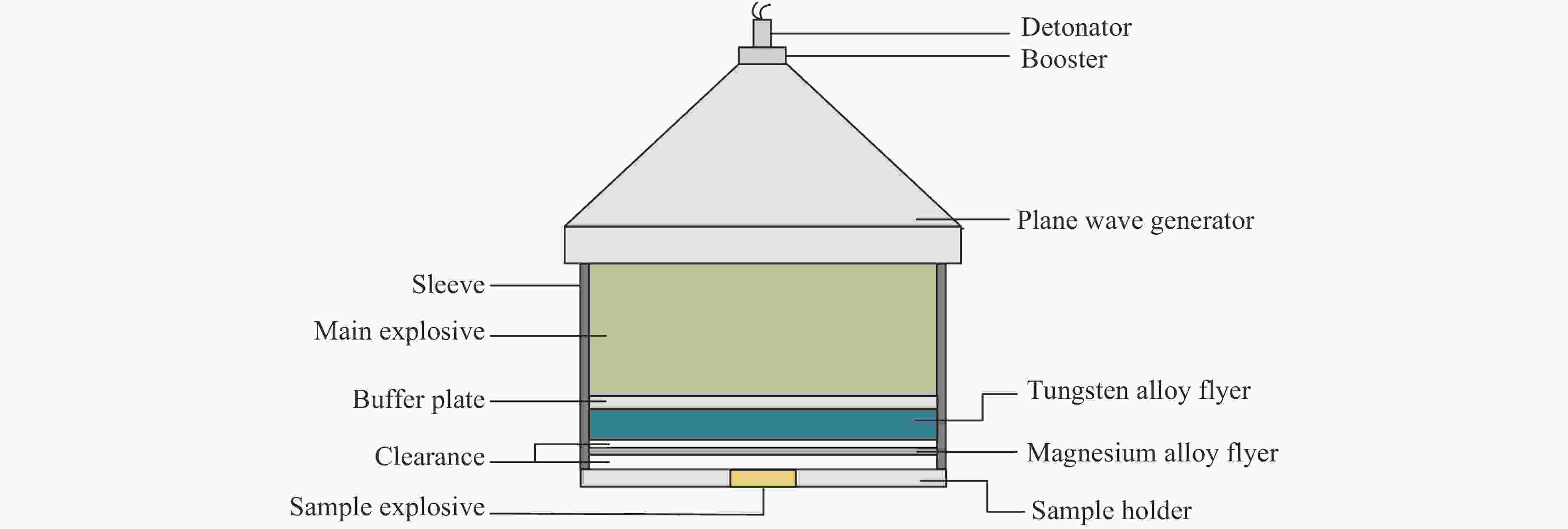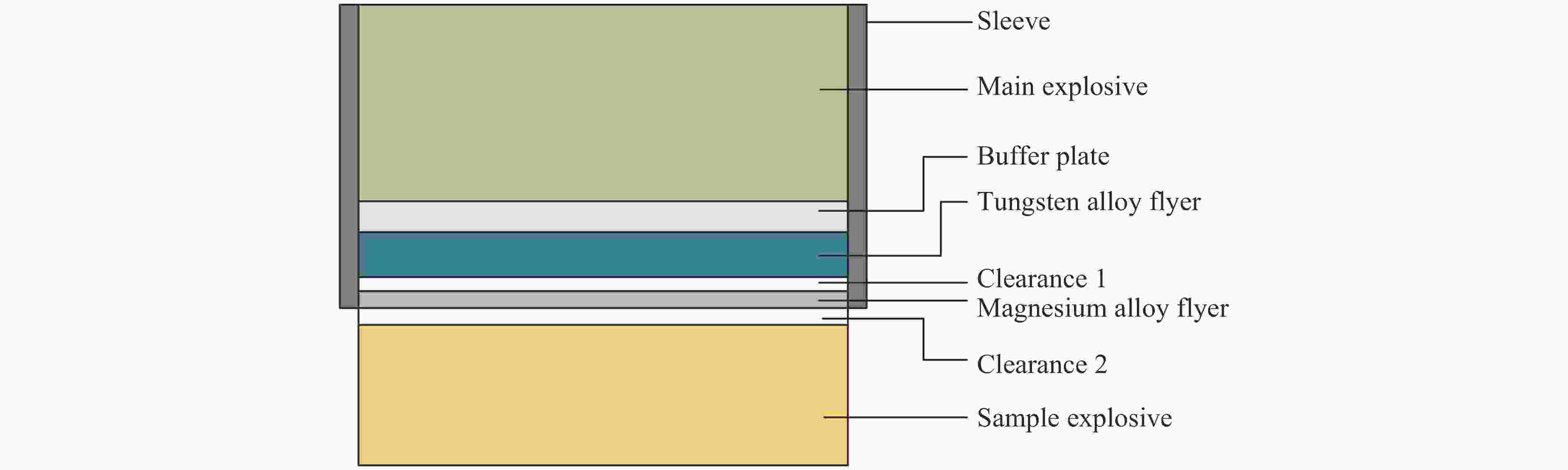 Part ρ0/(g·cm−3) Size Plane wave generator $\varnothing $100 mm, 37° HMX-based main explosive 1.849 $\varnothing $100 mm×30 mm Buffer plate 1.186 $\varnothing $100 mm×3 mm Tungsten alloy flyer 18.300 $\varnothing $100 mm×4 mm Clearance 1 1 mm Magnesium alloy flyer 1.776 $\varnothing $100 mm×1 mm Clearance 2 3 mm TATB based sample explosive 1.895 $\varnothing $20 mm×2 mm Sleeve $\varnothing $110 mm×52 mm -