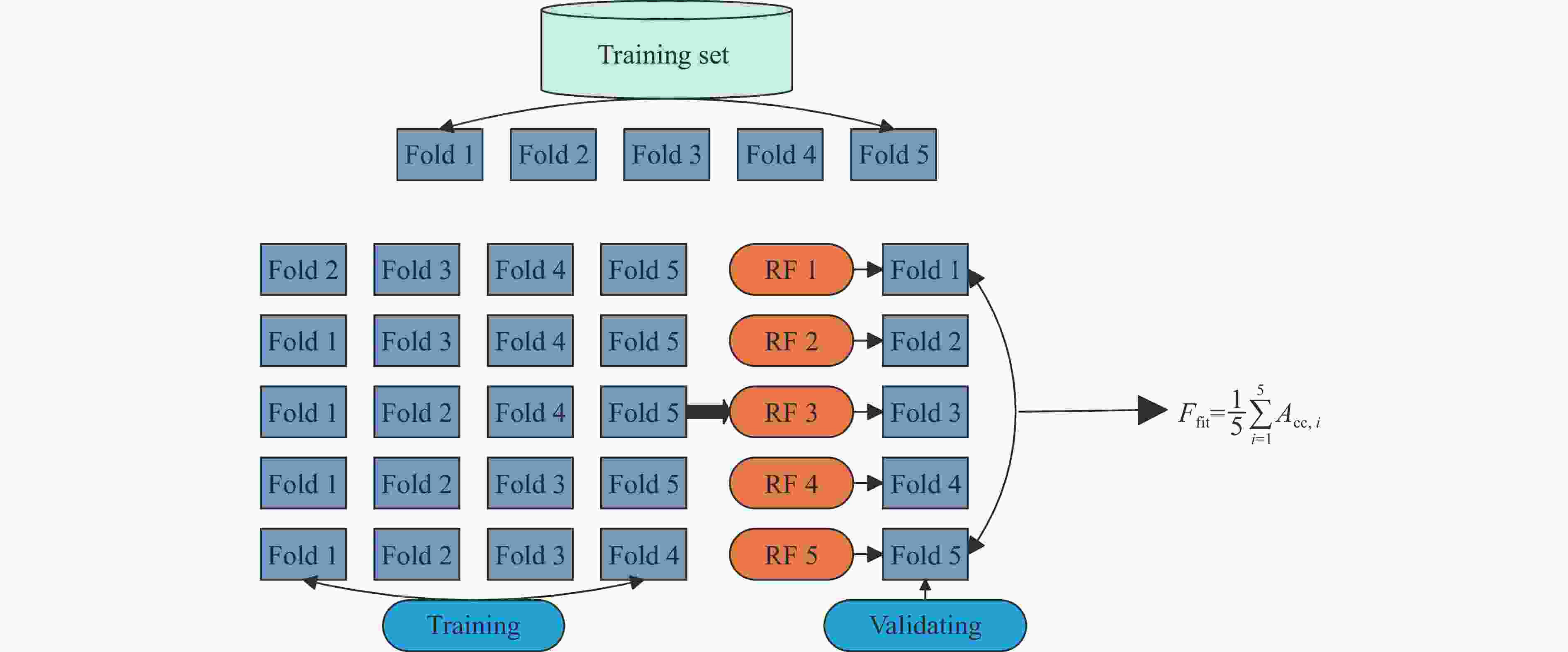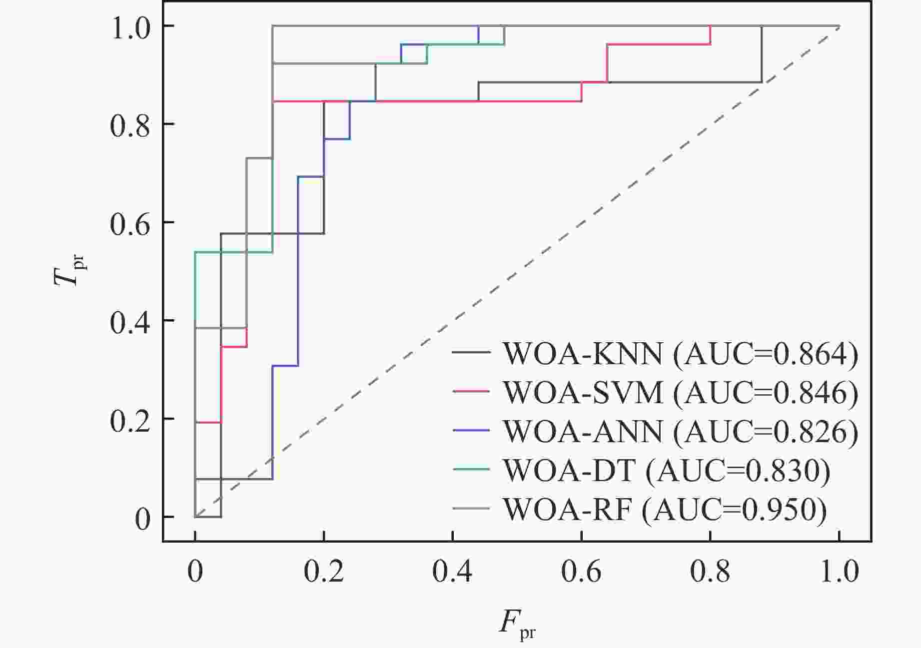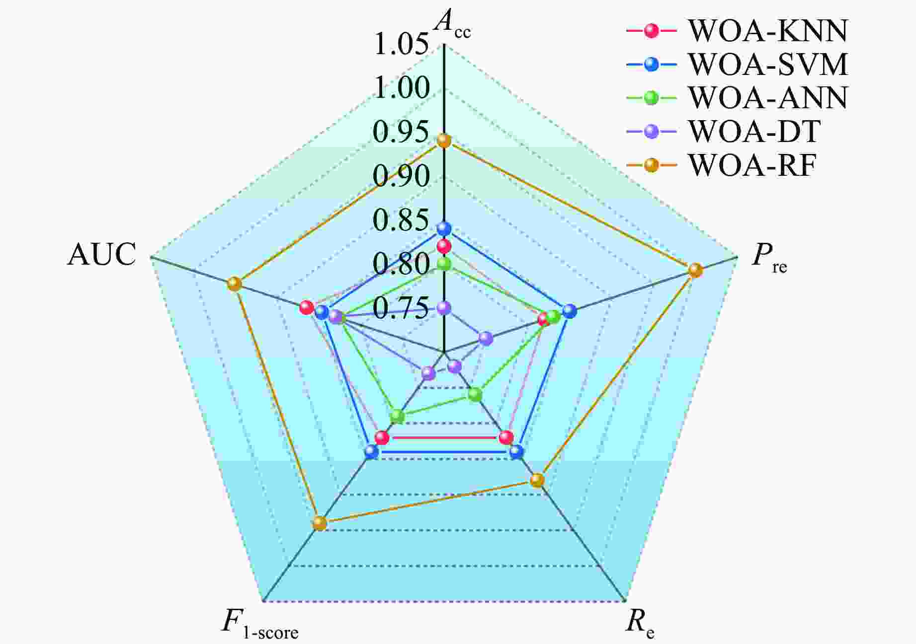 $A_{\mathrm{cc}} $ and$F_{\mathrm{1\text{-}score}}$ before and after optimizationModel Acc F1-score Model Acc F1-score KNN 0.76 0.76 WOA-KNN 0.82 0.82 SVM 0.80 0.80 WOA-SVM 0.85 0.84 ANN 0.53 0.52 WOA-ANN 0.80 0.79 DT 0.71 0.71 WOA-DT 0.75 0.75 RF 0.84 0.84 WOA-RF 0.94 0.94 表 4 各模型优化后分类性能指标及排名