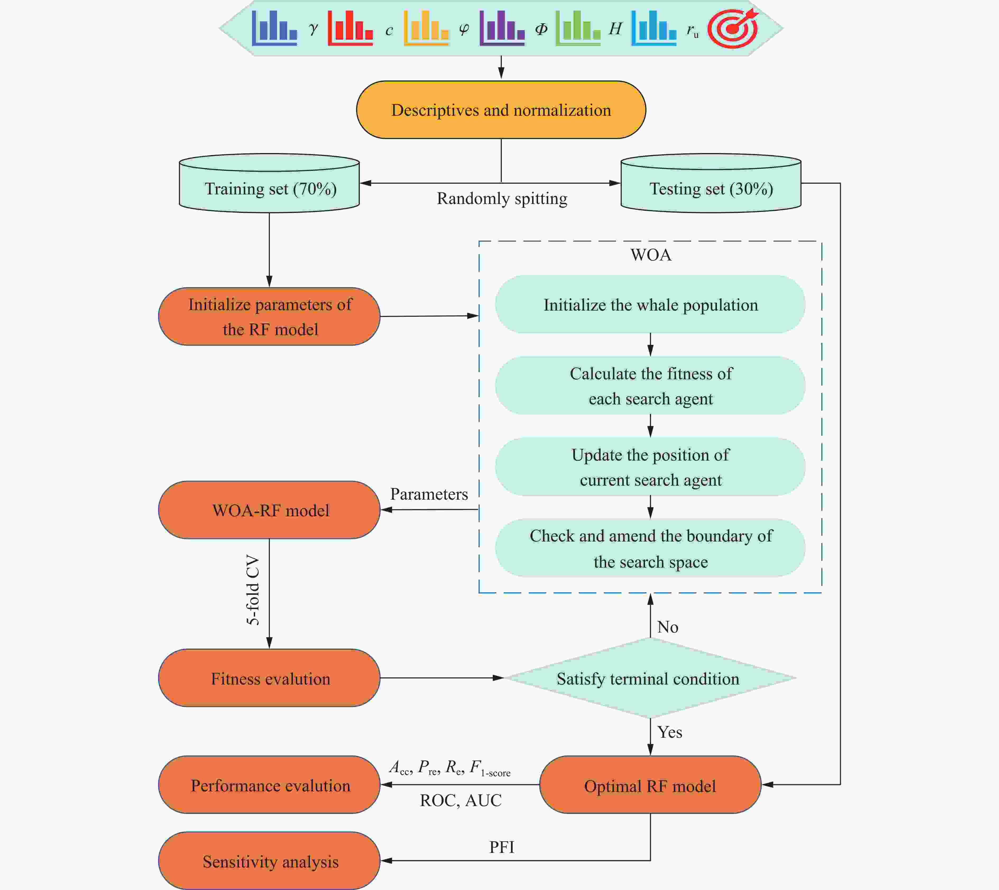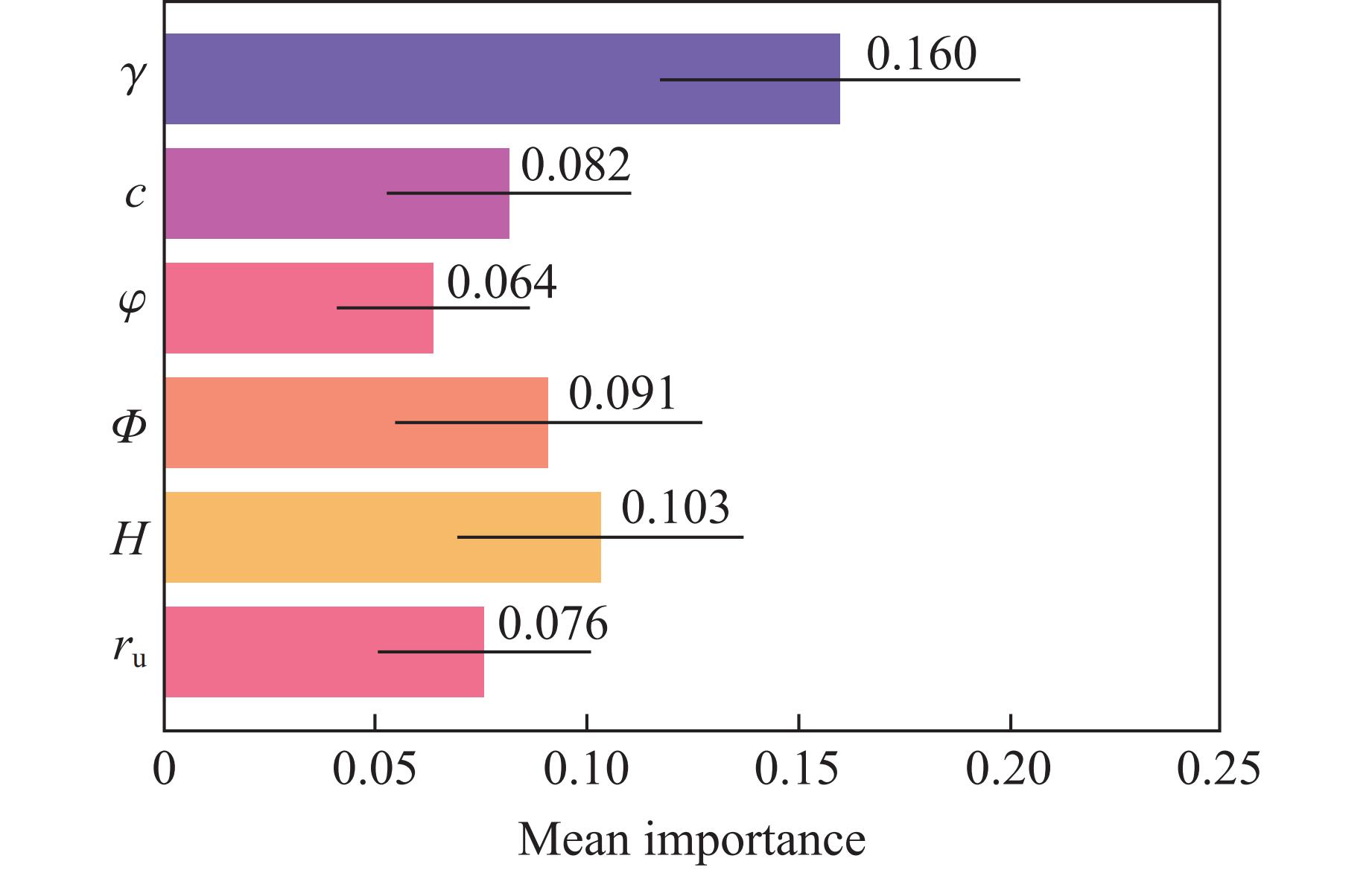 Feature γ/(kN∙m−3) c/kPa ϕ/(°) Φ/(°) H/m ru/kPa S Max 31.30 300.00 45.00 59.00 511.00 0.50 1.0 Min 12.00 0 0 16.00 3.60 0 0 Mean 21.76 34.12 28.73 36.10 104.19 0.22 0.5 Median 20.96 19.96 30.24 35.00 50.00 0.25 Standard deviation 4.15 45.96 10.61 10.25 133.08 0.16 表 2 WOA-RF模型参数设置