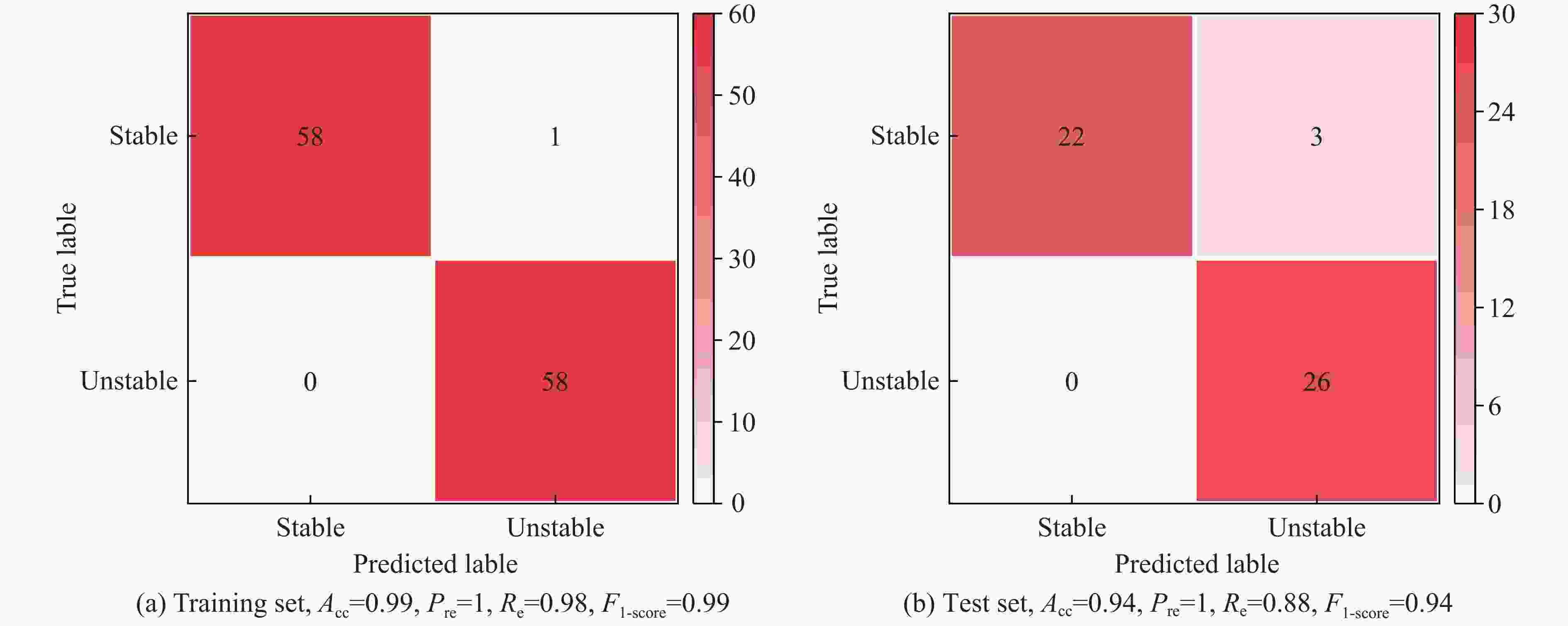 摘要: 为有效地预测边坡稳定性和预防边坡失稳事故的发生,提出了鲸鱼优化算法(whale optimization algorithm,WOA)和随机森林(random forest,RF)相结合的混合模型WOA-RF;基于所收集的边坡案例,采用混淆矩阵的分类性能指标和受试者工作特征曲线及线下面积评估混合模型WOA-RF的分类和泛化性能;使用WOA对4种广泛应用的机器学习模型进行优化,并将优化后的机器学习模型与WOA-RF模型进行对比分析。结果表明:WOA可以有效地优化超参数和提升模型性能;最优WOA-RF模型在训练集和测试集上的准确率分别为0.99和0.94,优化后,准确率、精确率、召回率、精确率和召回率的加权平均值分别提升了11.9%、19.0%、4.8%和11.9%;对比分析各个模型的预测性能后发现,WOA-RF模型的各项指标均优于其他模型;确定了特征重要性排序,发现容重是影响边坡稳定性的最敏感特征。WOA-RF模型可有效地预测边坡稳定性,预测结果可为防护措施的制定提供依据。Abstract: To effectively predict slope stability and prevent slope instability occurrence, a hybrid model WOA-RF, combining whale optimization algorithm (WOA) and random forest (RF) was proposed. Based on the collected slope cases, the classification and generalization performance of the model was evaluated according to the classification performance indicators given by the confusion matrix and the area under the receiver operating characteristic curve. Additionally, WOA was used to optimize four widely used machine learning models, and the optimized machine learning models were compared with WOA-RF. The results demonstrate that WOA is effective in optimizing hyperparameters and improving model performance. The optimal WOA-RF model achieves an accuracy of 0.99 on training set and of 0.94 on test set. After optimization, the accuracy, the precision, the recall, and the hamonic mean of the precision and recall are increased by 11.9%, 19.0%, 4.8%, and 11.9%, respectively. Comparative analysis reveals that the WOA-RF model is superior to the others in all indicators. Furthermore, the feature importance ranking was determined. Analysis of the feature importance indicates that unit weight is the most sensitive feature affecting slope stability. The established WOA-RF model is proved effective in predicting slope stability and facilitating the development of appropriate protective measures based on the predicted results.