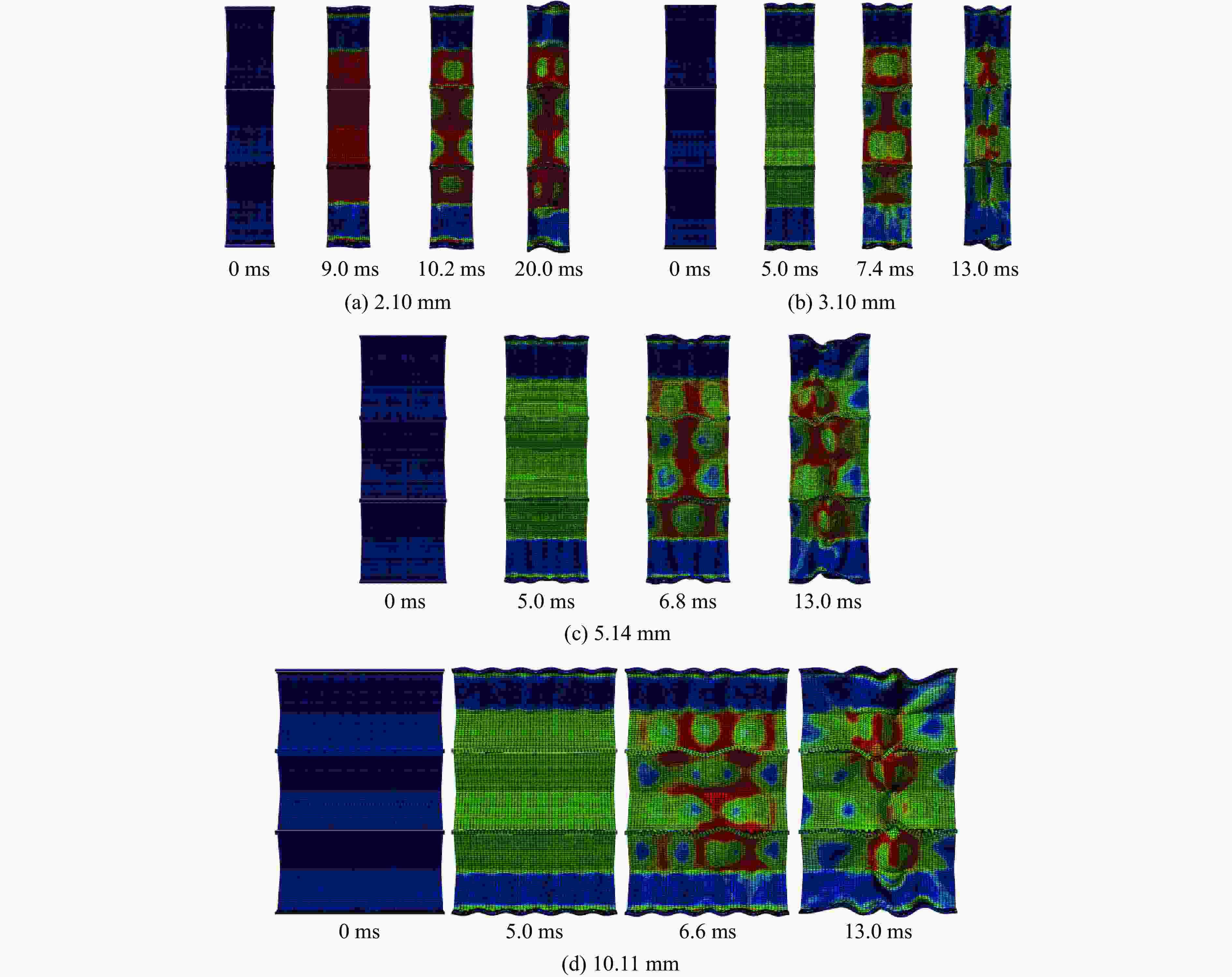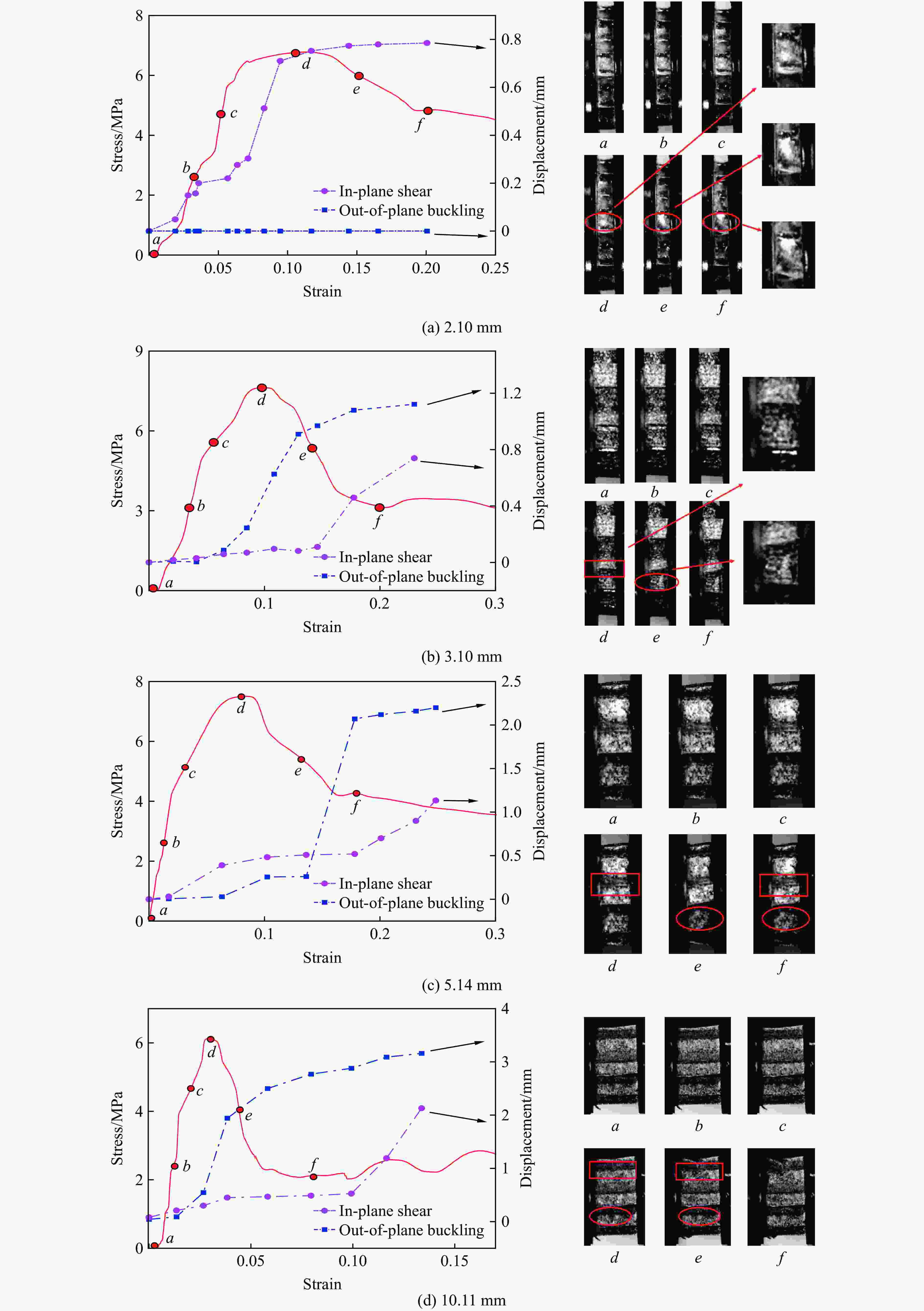摘要: 应用新研制的中应变率实验装置结合激光干涉测速系统完成了纸蜂窝结构的动态加载实验,研究纸蜂窝结构在中应变率下的力学性能;结合高速摄影和数字图像相关方法,得到纸蜂窝结构的变形过程和动态失效机制,并采用数值方法进一步探究其动态失效机制。结果表明:纸蜂窝结构表现出明显的应变率效应;厚度为2.10 mm的纸蜂窝屈服强度明显低于其他3种尺寸,表现出异常尺寸效应,应力-应变曲线下降段也有较大差异。产生异常尺寸效应的主要原因是,随着试样尺寸的增大,纸蜂窝结构的破坏模式发生了变化。中应变率加载过程中,纸蜂窝结构的失效机制为破坏模式的转变—由面外壁屈曲破坏转变为面内剪切破坏。本研究还利用数值模型分析了胞元宽度的变化对结构力学性能的影响,该研究结果对于薄壁结构的优化设计具有很好的参考意义。Abstract: Combining the laser interferometry system, using the newly developed experimental device at medium strain rates to conduct the dynamic loading experiment of paper honeycomb structure. The purpose is to study the mechanical properties of paper honeycomb structure at medium strain rates. The deformation process and dynamic failure mechanism of paper honeycomb structure were obtained by high-speed photography and digital image correlation method. Numerical methods were used to further explore the dynamic failure mechanism. The results show that the paper honeycomb structure exhibits obvious strain rate effect. The yield strength of 2.10 mm thick paper honeycomb is obviously lower than the other three sizes, showing abnormal size effect. The descending section of stress-strain curve of 2.10 mm thick paper honeycomb is also different. The main reason for it is that the failure mode of paper honeycomb structure changes with the increase of sample size. The failure mechanism of paper honeycomb structure during the loading process at medium strain rates is the change of two failure modes, namely from out-of-plane buckling to in-plane shear. The effect of cell width on mechanical properties of the structure was analyzed by numerical model. This study is a good reference significance for the optimal design of thin-walled structures.