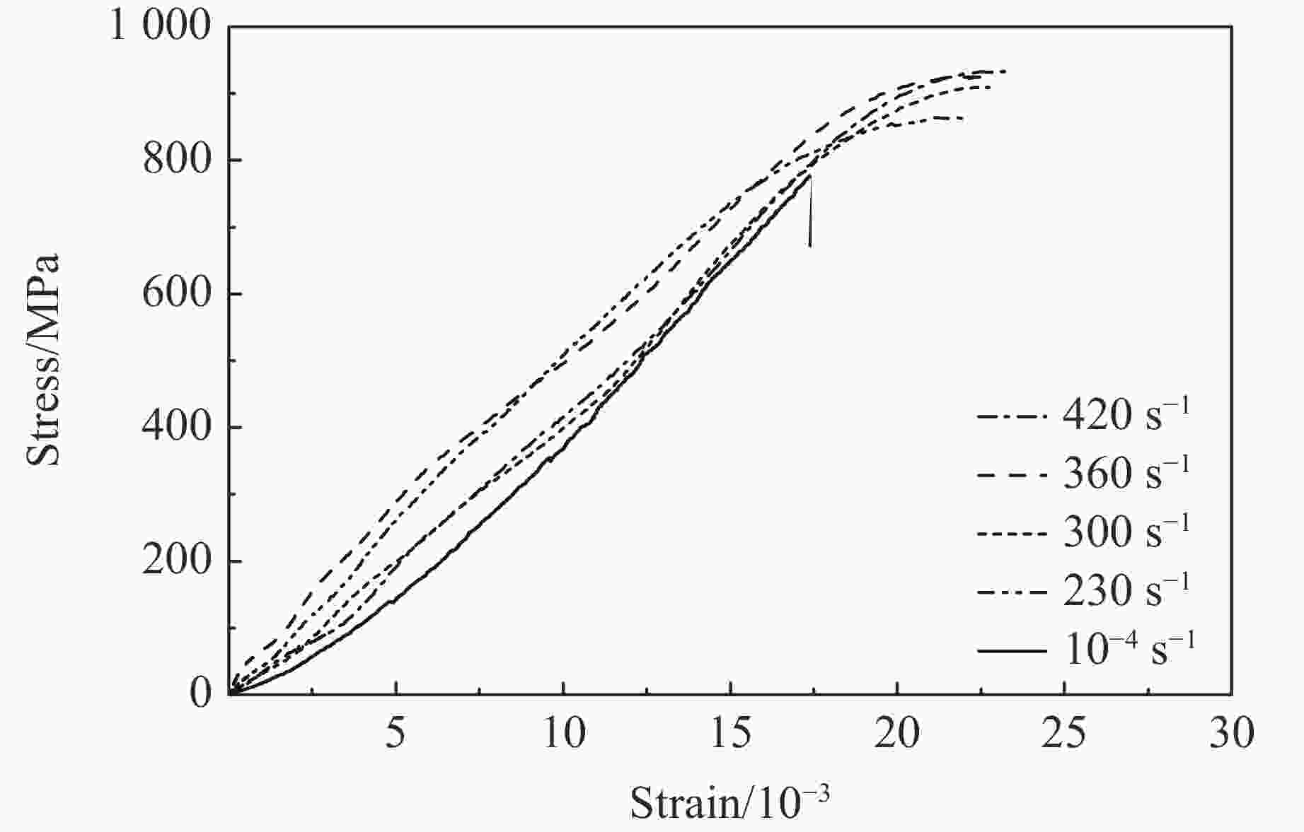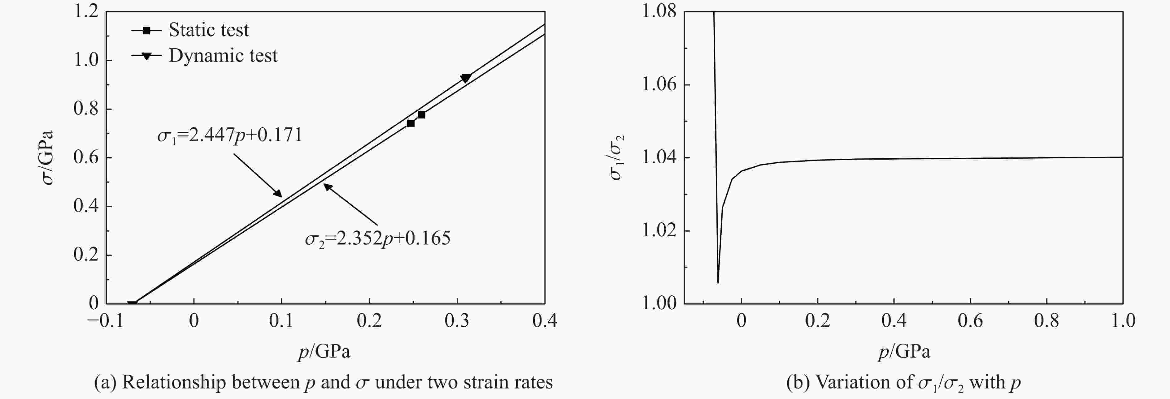 Test ${ \dot{{ \varepsilon }}}\text{/}{\text{s}}^{{-1}} $ σ/GPa p/GPa $\sigma^{*}$ $p^{*}$ Quasi-static compression 10−4 0.760 0.253 0.127 0.0719 SHPB 420 0.930 0.310 0.156 0.0881 表 3 根据动态压缩试验数据拟合得到的完整强度参数