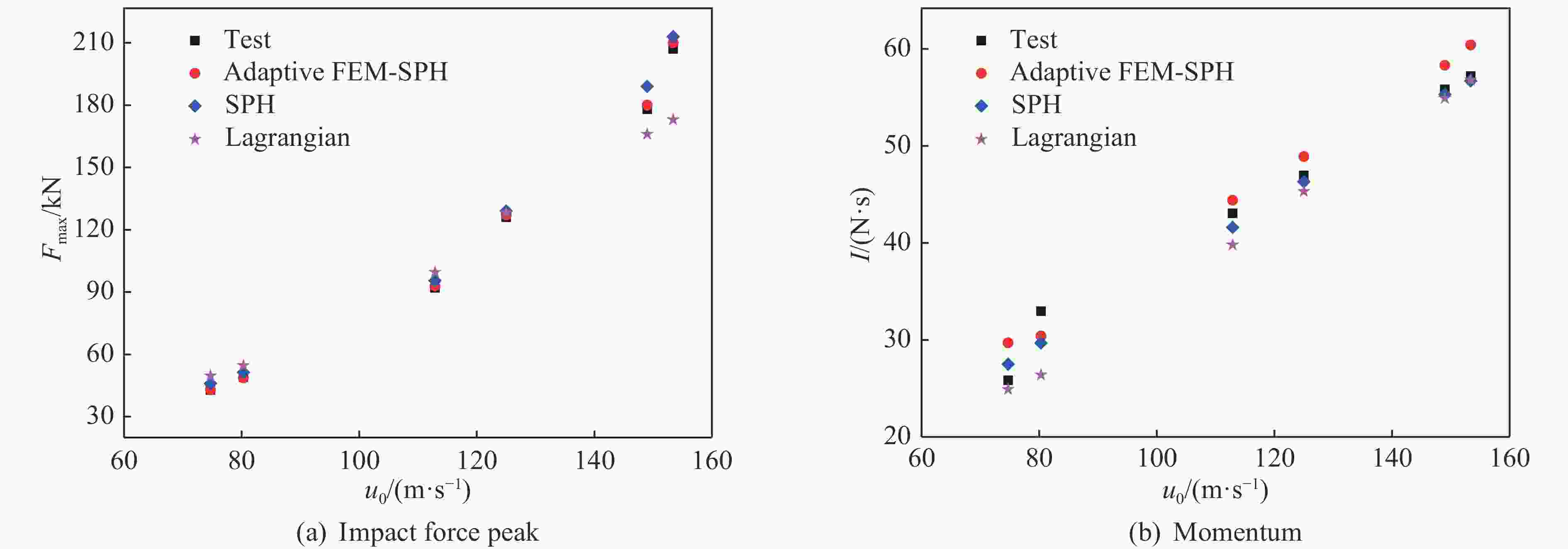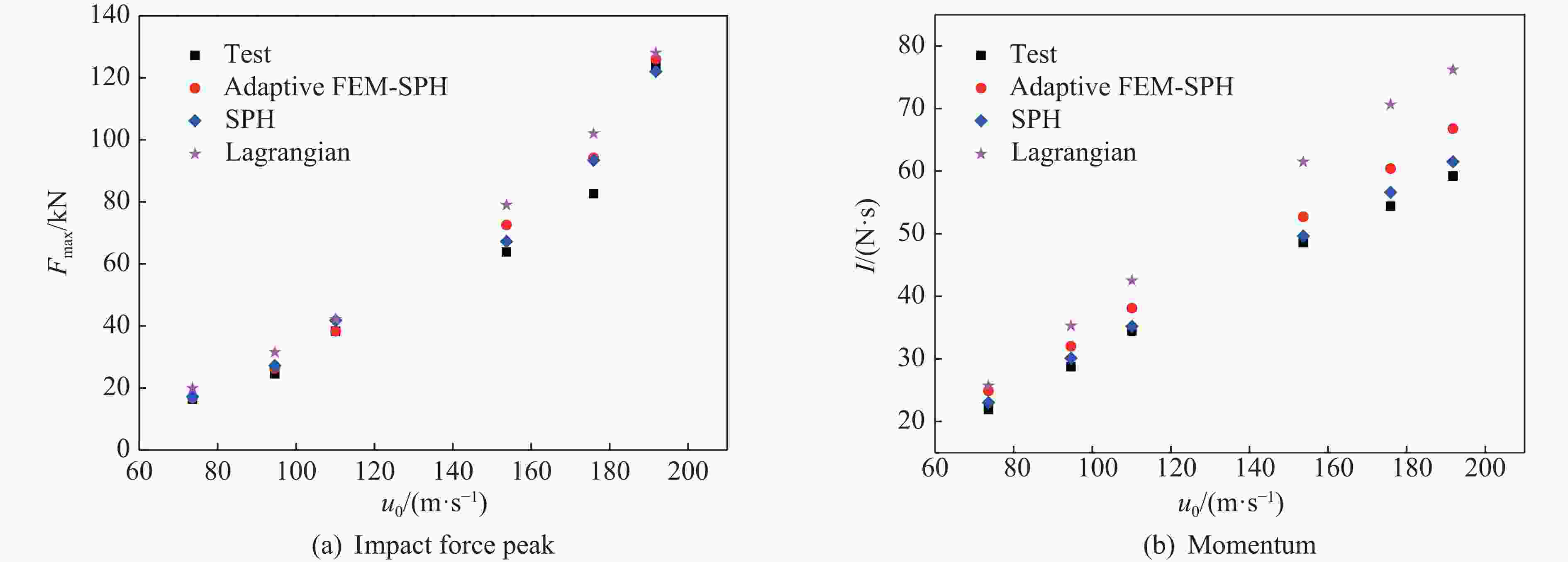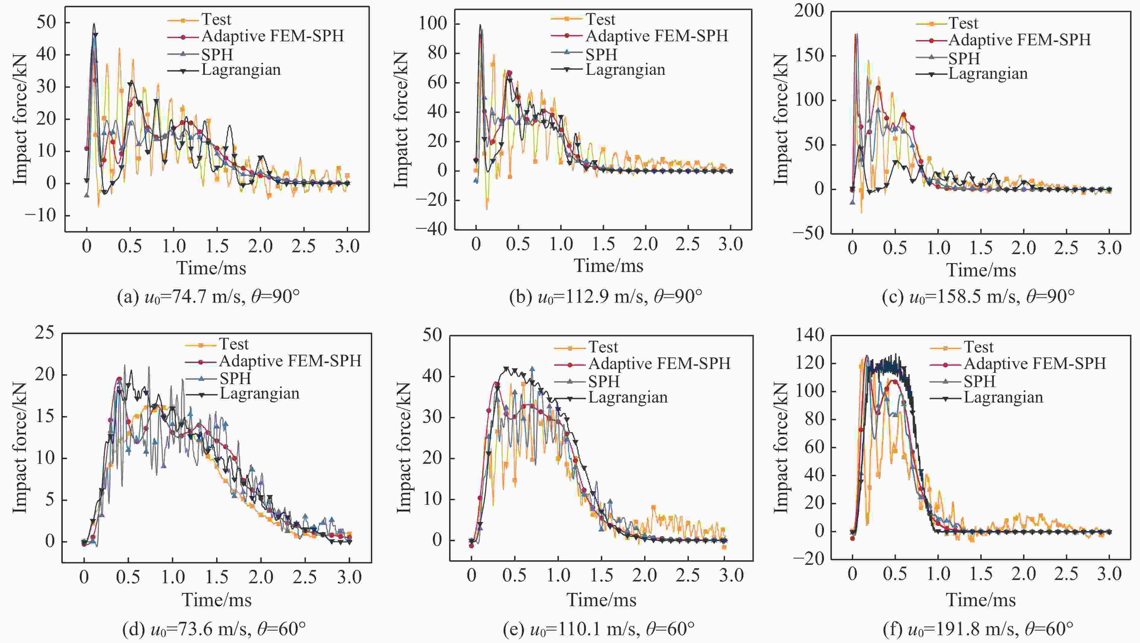 摘要: 明胶鸟弹在不同撞击速度下表现出不同的响应特性。为解决传统明胶鸟弹本构表征方法在不同速度范围内不能通用的问题,开展了330 g明胶鸟弹以70~190 m/s速度、60°或90°入射刚性铝合金平板试验,记录了冲击力数据及撞击形貌。结果表明,随着撞击速度的提高,鸟弹碎裂得更充分,碎块体积减小。利用LS-DYNA建立了自适应FEM-SPH(finite element method-smoothed particle hydrodynamics)鸟体模型。依据试验结果反演得到一组鸟体本构参数:切线模量为1.33 MPa,剪切模量为115.95 MPa,Murnaghan状态方程参数γ为10.49,k0为69.77 MPa,体积模量为246.4 MPa,失效塑性应变为1.15,初始屈服应力为0.21 MPa。仿真结果与试验结果具有很好的一致性,冲击力峰值的相对误差在2%以内,冲量的相对误差在10%以内。自适应FEM-SPH鸟体模型具有比SPH模型和拉格朗日模型更高的精度。由自适应模型得到的Hugoniot压强与理论结果具有相同的变化趋势,滞止压强与理论值较接近。Abstract: Previous studies revealed that gelatin birds show different mechanical behaviors at different impact velocities. In order to solve the problem that the traditional constitutive methods of gelatin bird cannot be universal in different velocity ranges, the tests of 330 g gelatin birds impacting rigid aluminum alloy plate at 60° and 90° incident angles, covering a velocity range of 70−190 m/s were carried out to record the impact force data and impact morphology. With the increase of velocity, the birds were broken more fully and smaller fragments were observed. The adaptive FEM-SPH (finite element method-smoothed particle hydrodynamics) model of bird was established in LS-DYNA, and a set of constitutive parameters were inverted according to the test results: tangent modulus equals to 1.33 MPa, shear modulus equals to 115.95 MPa, the parameters of Murnaghan equation of state γ equals to 10.49, k0 equals to 69.77 MPa, bulk modulus equals to 246.4 MPa, failure plastic strain is 1.15, yield stress is 0.21 MPa. The simulation results were in good agreement with the test results, and had higher accuracy compared to the SPH models and the Lagrangian models. The Hugoniot pressure of the adaptive model had the same change trend as the theoretical value, and the stagnation pressure was close to the theoretical value.