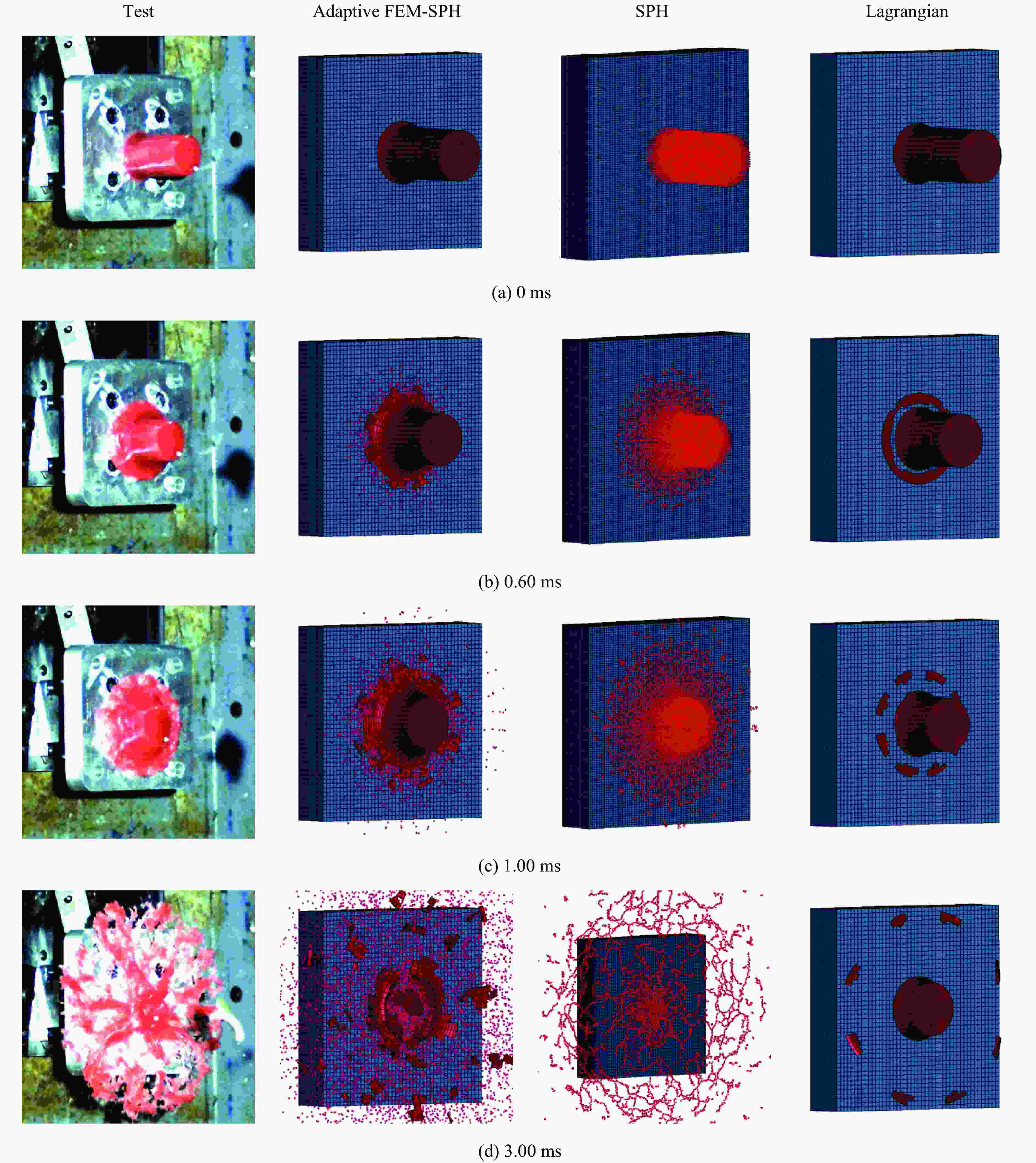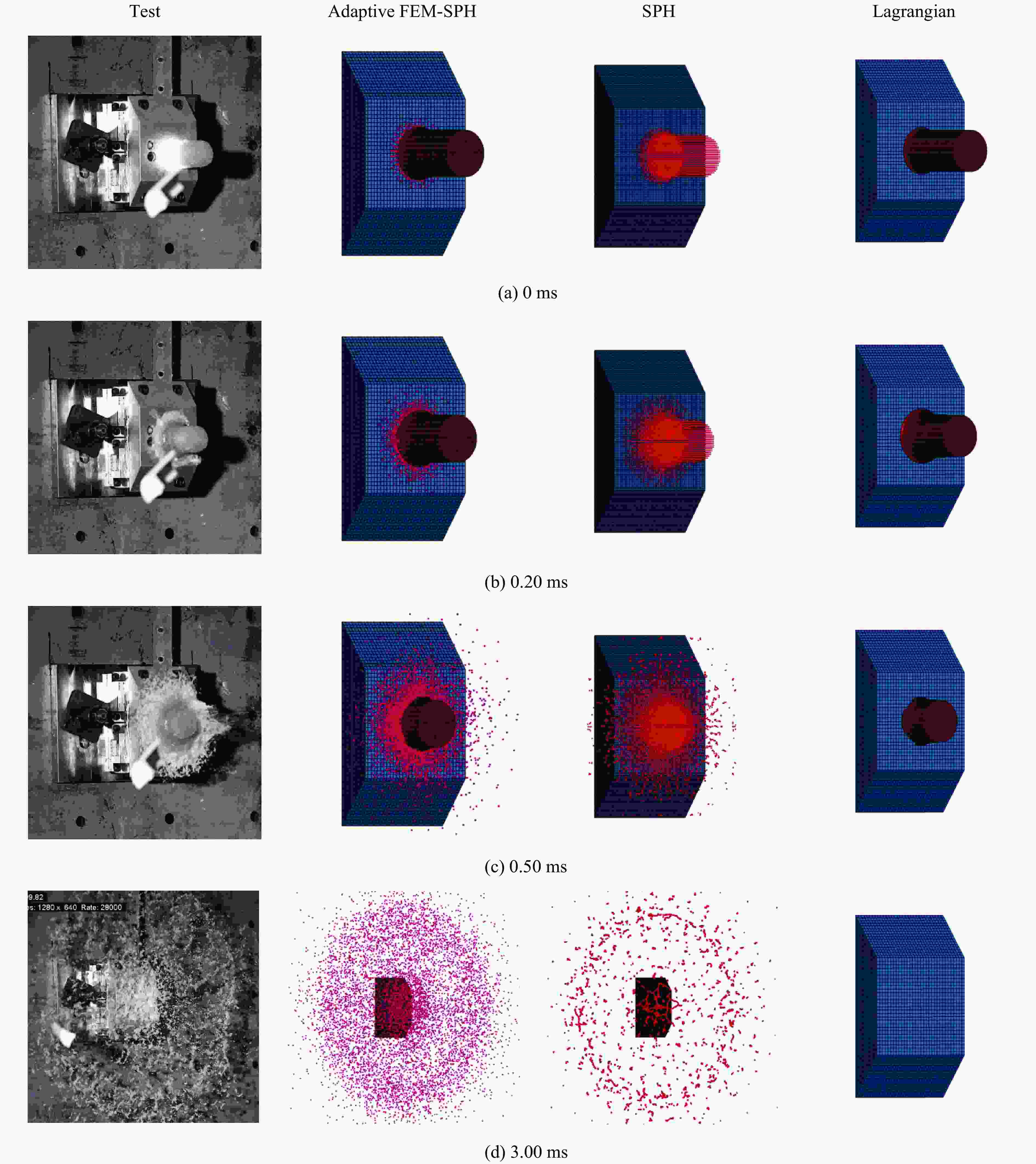 Density/(kg·m−3) Cut-off pressure/MPa Dynamic viscosity/(Pa·s) 950 −1 0.001 表 4 自适应FEM-SPH模型的本构参数优化结果