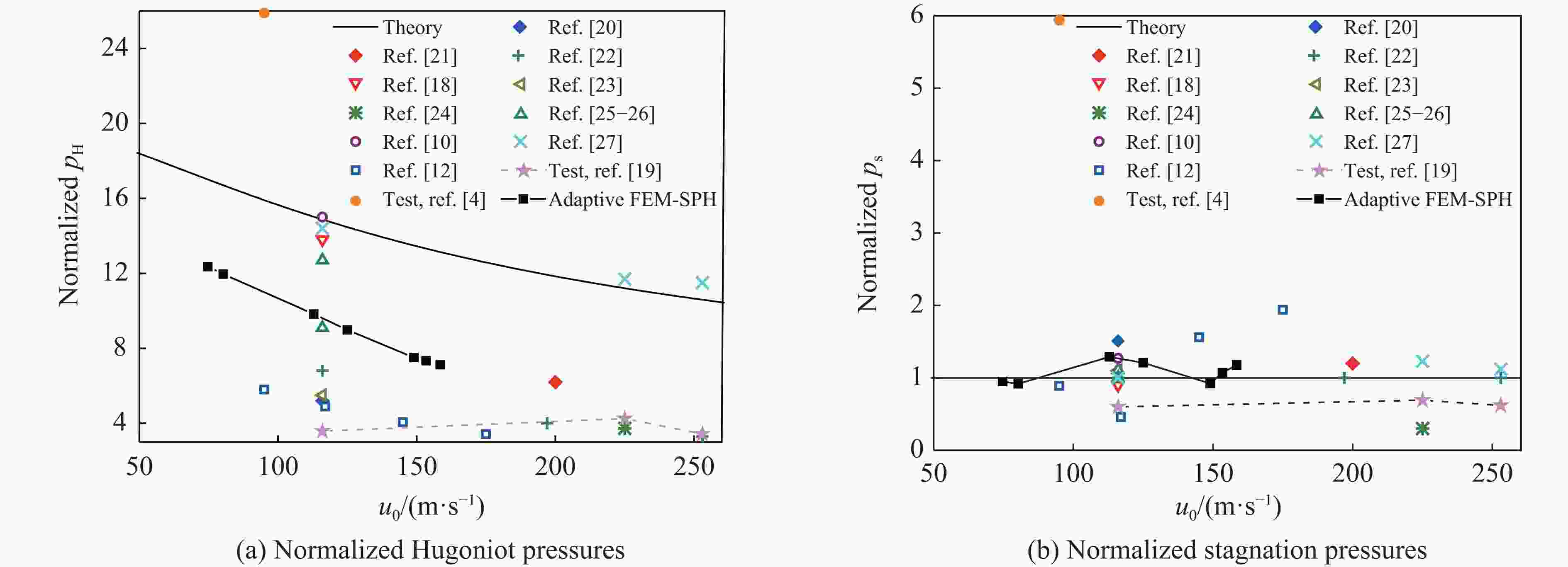 Table 5. Numerical results of normalized Hugoniot and stagnation pressures calculated by different researchers[10, 12, 18, 20–27]