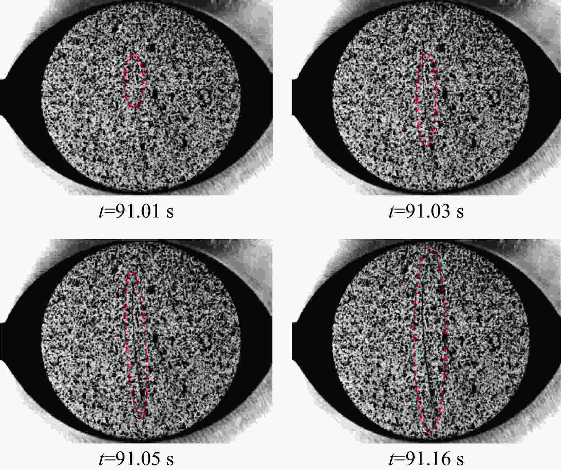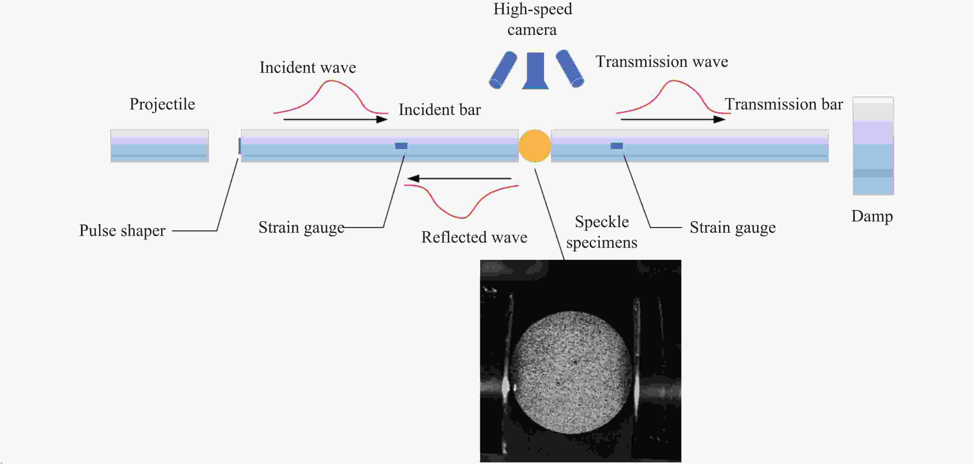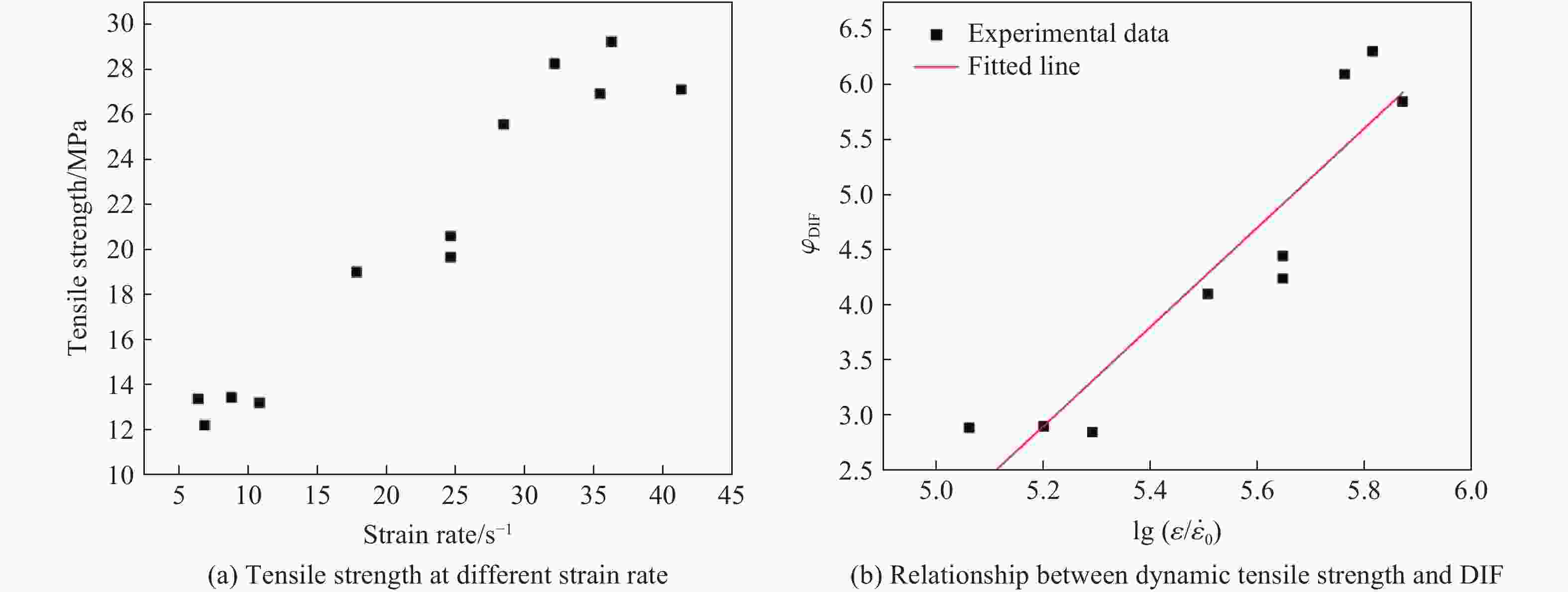 $\varnothing$ 40 mm 分离式霍普金森压杆进行动态加载,结合高速相机、数字图像相关等测试方法观察试样在劈裂过程中的破坏过程以及应变场演化规律,获得应变时程曲线。试验结果表明:人造结石的准静态拉伸强度与硬度、粉水比成正比,与孔隙率成反比,而蛋白质含量对拉伸强度的影响不大,但会影响其韧脆性。在动态加载下,人造结石试样具有明显的应变率强化效应,拉伸强度动态增强因子与应变率对数之间呈线性增长关系。研究方法为人造结石的力学特性研究提供了一种有效的实验方法和分析手段。Abstract: This article aims to explore the mechanical properties of artificial stones under different conditions. Firstly, dental plaster samples with different ratios (hardness, porosity, powder-to-water ratio, and protein content) were prepared as artificial stones to study the splitting behavior. Secondly, quasi-static Brazilian splitting test were conducted on artificial stones. Finally, a$\varnothing$ 40 mm split Hopkinson pressure bar (SHPB) was used for dynamic loading, combined with high-speed cameras, digital image correlation (DIC) and other testing methods to observe the damage process during sample splitting and the evolution law of the strain field, and then obtain the strain time history curve of the sample was obtained. Test results show that the quasi-static tensile strength of artificial stones is directly proportional to the hardness and powder-to-water ratio, and inversely proportional to the porosity. And the protein content has little effect on the tensile strength of the material, but it does affect its ductility and brittleness. Under dynamic loading, the artificial stone specimen has an obvious strain rate strengthening effect. There is a linearly increasing relationship between the dynamic enhancement factor for tensile strength and the logarithm of the strain rate. This article provides an effective test method and analysis technique for studying the mechanical properties of artificial stones. -