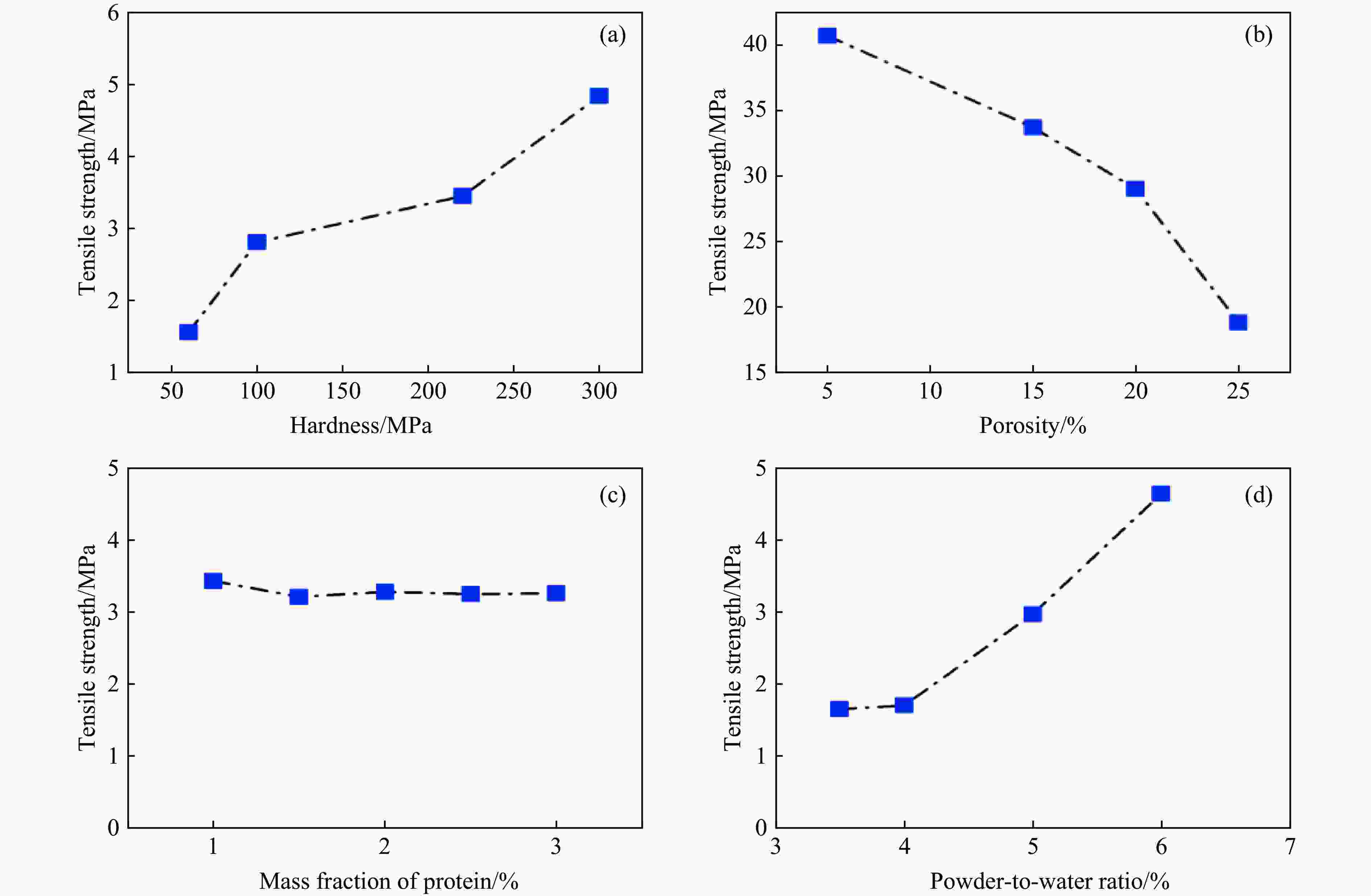 Hardness/MPa Porosity/% 1-1 1-2 1-3 1-4 2-1 2-2 2-3 2-4 60 100 220 300 5 15 20 25 Protein content/% Powder-to-water ratio 3-1 3-2 3-3 3-4 3-5 4-1 4-2 4-3 4-4 1.0 1.5 2.0 2.5 3.0 6.0∶1 5.0∶1 4.0∶1 3.5∶1 表 3 动态加载试验中试样的物理参数