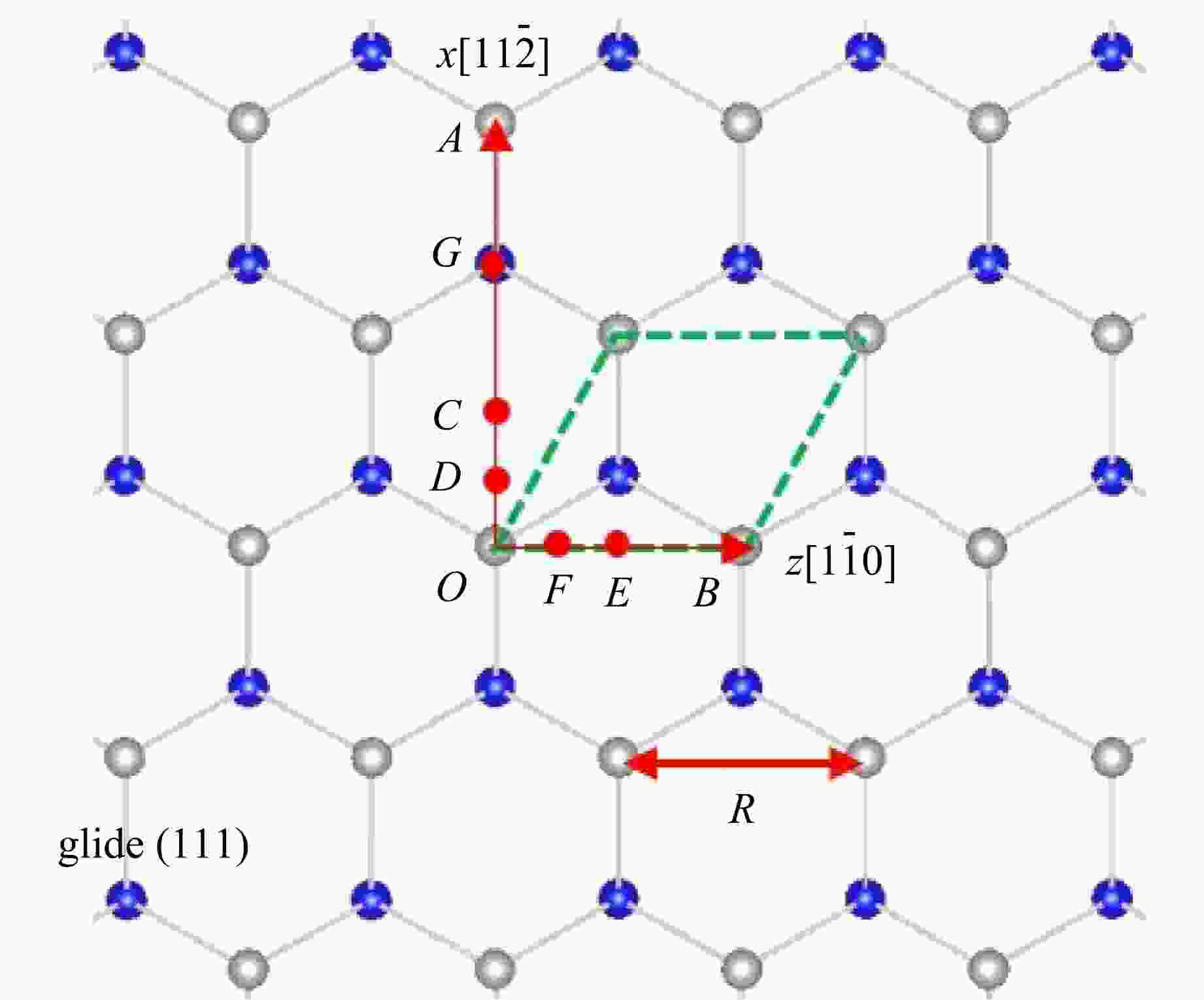 • 图  glide (111)面示意图(蓝色原子为下半无限大晶体的最上层原子,灰色原子为上半无限大晶体的最下层原子,ROB的距离,C点为本征层错位置,D点为不稳定层错位置)