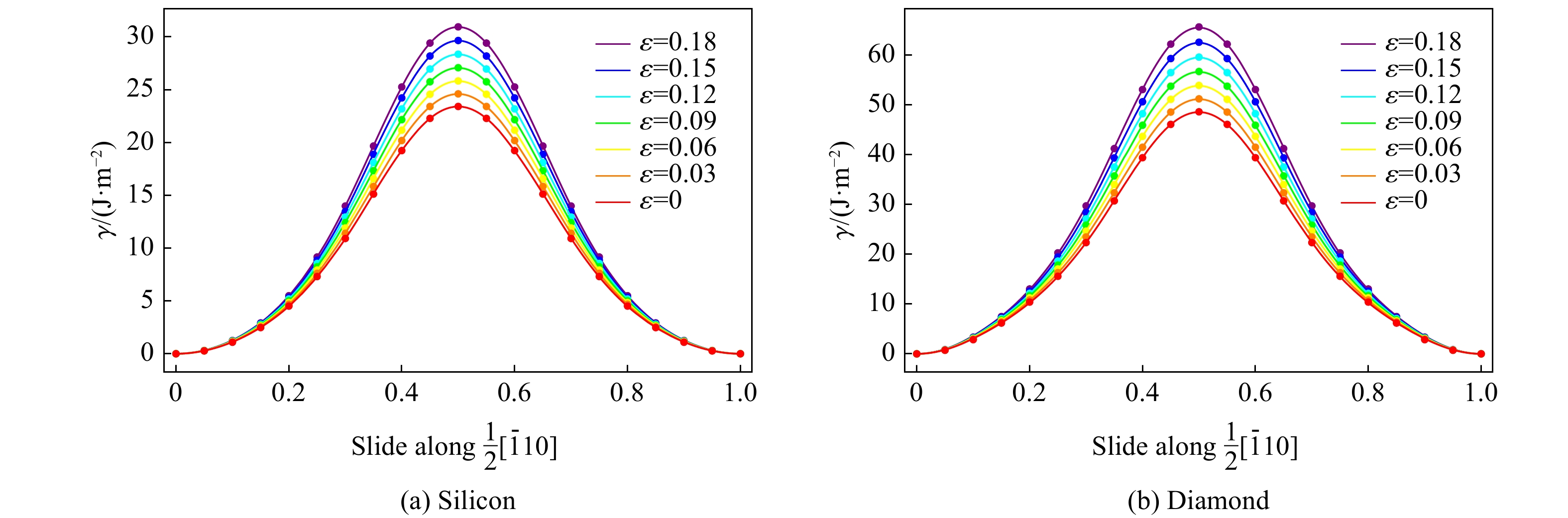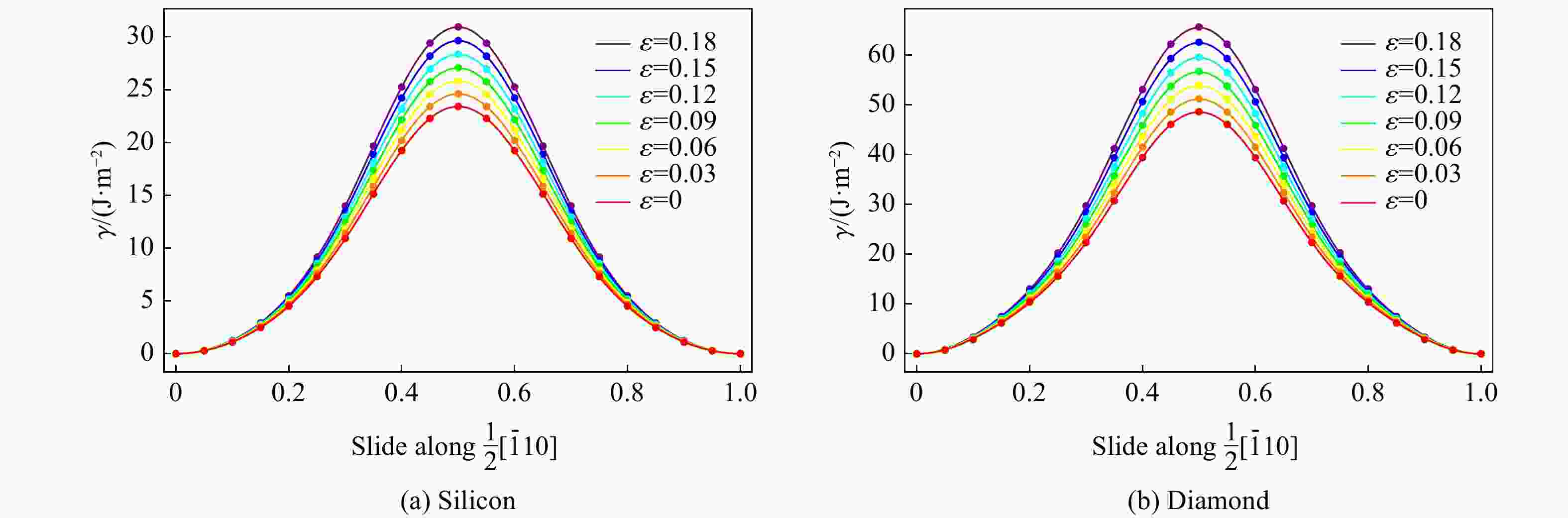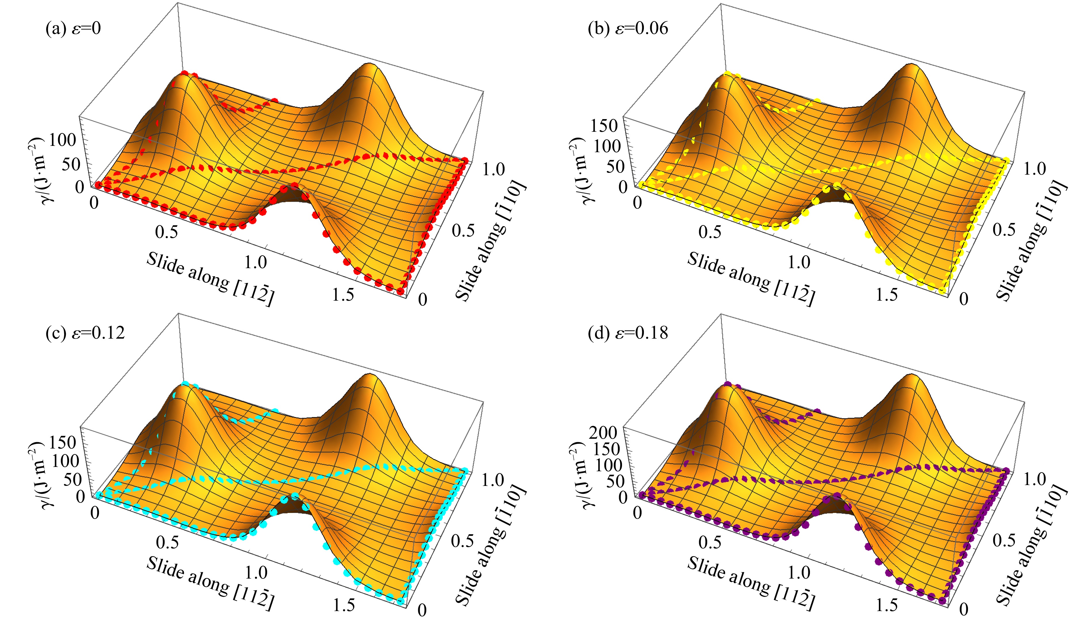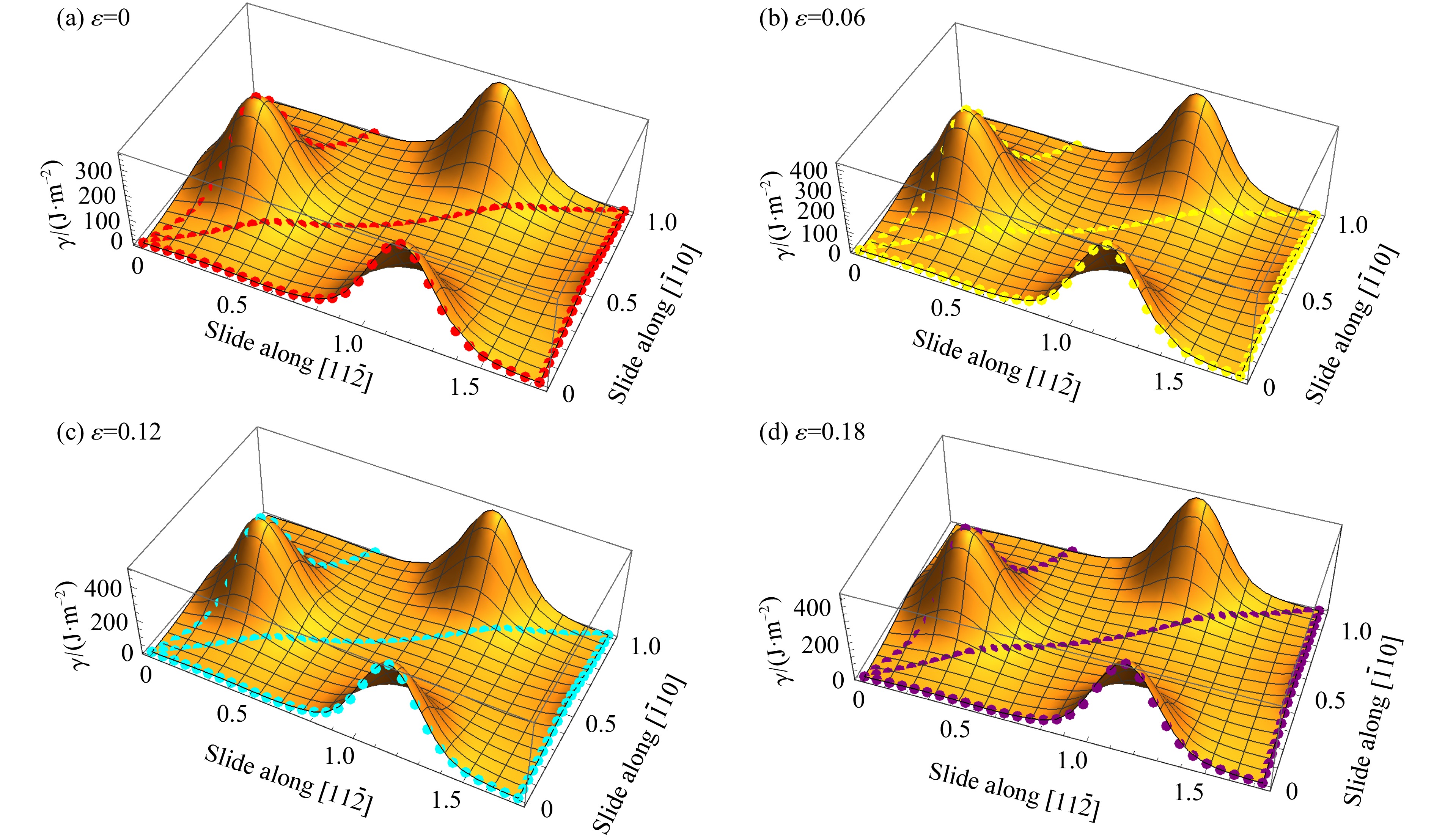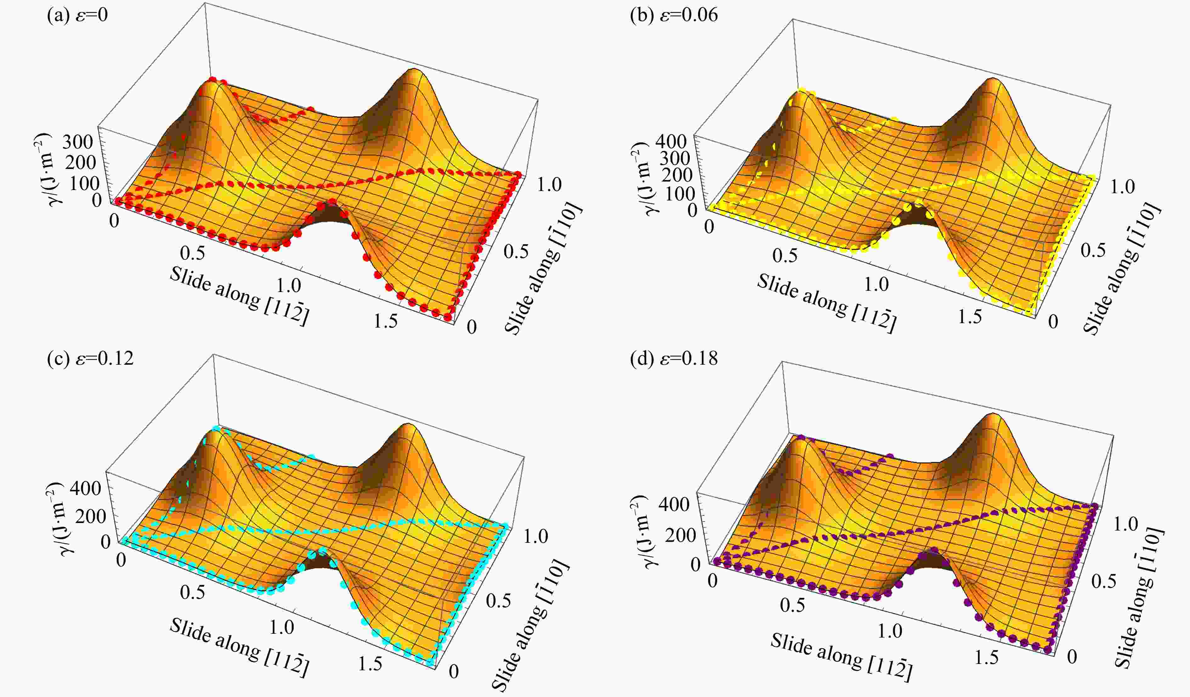 Figure  4.  GSFE surface of the glide (111) surface of diamond fitted by Eq. (4) for different strains (The points in the figures are the results of first principles calculations, the first energy peak in the [$ 11\overline{2} $] direction is the unstable stacking fault energy, the first energy minimum is the intrinsic stacking fault energy, and the GSFE surface is symmetric along the projection in the [$ \overline{1}10 $] direction.)