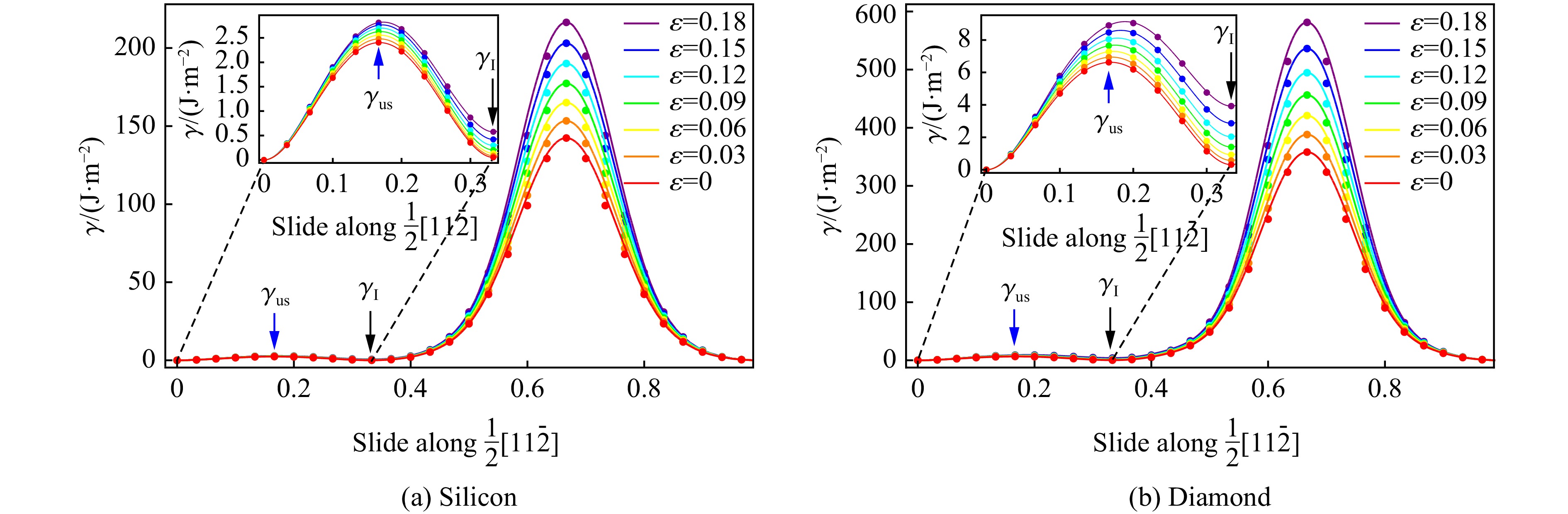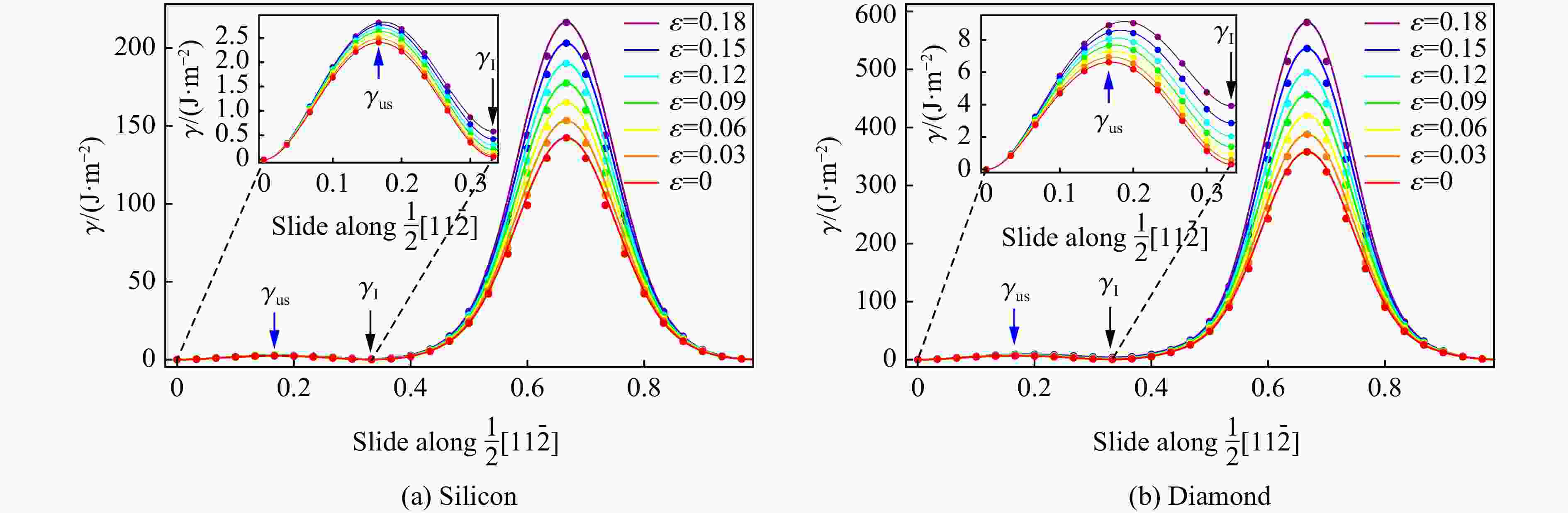 Figure  8.  Intrinsic stacking fault energy (γI) and unstable stacking fault energy (γus) and the ratio of them for the glide (111) surface of dimond at different strains